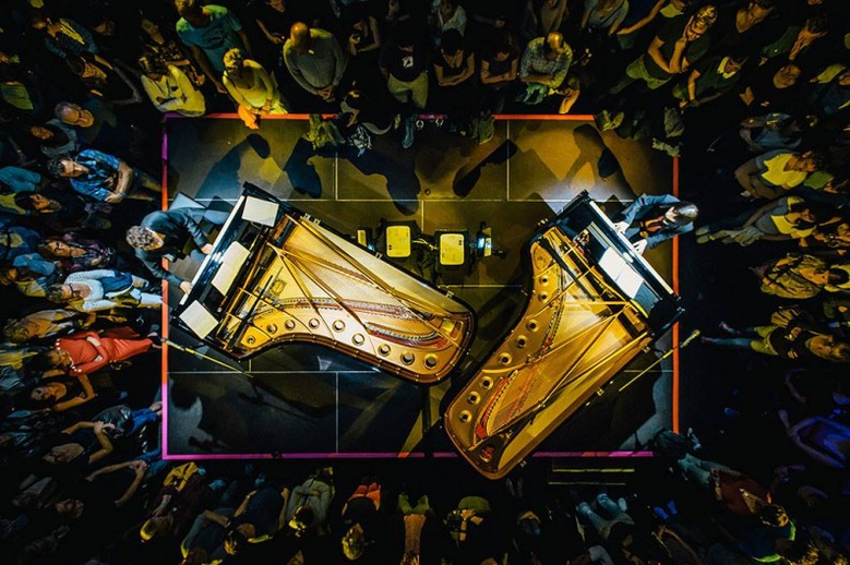 Ideas about exhibitions and staging from the art world and theatre led Duo Hellqvist/Amaral to create the artist collective Impossible Situations (IS:CNE). With a membership including a number of composers, an architect, a photographer and a sound engineer, IS:CNE has been meeting regularly since 2016 in order to develop new compositions and to work out how to integrate them into different concert situations. We try for instance to create connections between the thematics of our pieces and the architecture of the performance space, all the while looking for greater proximity between performers and audiences. This is done by experimenting with the placement of musicians, audience, projection, cables and loudspeakers to progressively tip the customary horizontal angle of viewing towards the circular and even the vertical, as in a concert at the Zagreb Music Biennale, where pictures covered the ground and videos of imaginary concert situations (from Plans for keyboard and violin pieces by composer Øyvind Torvund). As described in the book Impossible Situations: Concerts in the Making (2020), a valuable insight acquired by us performers throughout the four years of the project is the fact that working so closely with an architect and a sound engineer completely modifies our attitude to the music, not only because we become much more aware of the interplay between us, the music, the audience and the space, them but also because we see infinitely more possibilities of experimentation in a practice that was for us until then limited to interpreting composers and scores, and mastering instrumental-technical skills.