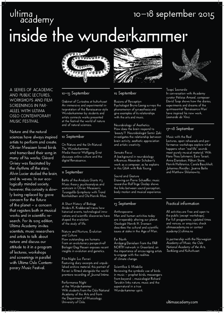 Ultima Academy (UA) was a programme of lectures, talks and screenings that accompanied the musical productions of the Ultima Oslo Contemporary Music Festival between 2012-15 (see Discourse), which UA looked at from within a broader socio-political perspective. By way of illustration, the 2014-edition of the Ultima Academy hosted the likes of political theorist Antonio Negri, pianist Ingfrid Nyhus, the Slovenian band Laibach, composer Simon Steen Andersen and music sociologist Esteban Buch to discuss concepts of power, ideology, ethics and cultural identity, and their connections with artistic practice. The programmes of UA and festival that year were intended both as pendant and reaction to the events celebrating the bicentennial of the Norwegian constitution, many of them uncritically glorifying the notion of nation. Taking place three year after the extreme-right terror attacks that shook the country’s political consciousness, it also marked the launch of the book Music after July 22nd, which looks at the many roles played by music in such a tragic event.