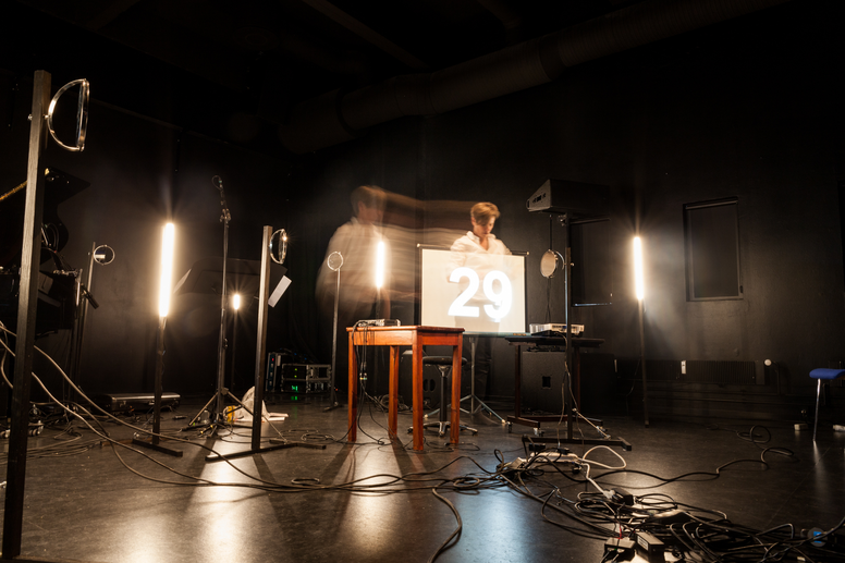 With non- or unstaging, on the other hand, I refer to forms of display that do not try to conceal the 'noise'  of musical productions, that is, performances in which 'disturbing' elements are not made to silence or retreat. This can take various shapes, the most typical of them being acting on stage like in everyday life, both in terms of clothing, behaviour and relation to the audience. Ensemble Besides plays lounge music in the intervall between pieces and Ensemble neoN choreographs stage shifts, particularly lenghty and complex in contemporary music productions, thus highlighting the 'working' and technical aspects of the concert. In the productions of Impossible Situations, we make stage-inherent elements such as cables, mixers, scores or projectors 'extra visible' in our scenography to show how practical, technical and aesthetic elements entangle in the making of a concert; else we fill the stage with mirrors that give more visibility to small but significant visuals details of the music-making. We also invite our audiences to visit our set-up and to take part in open workshops (see Discourse). In Voyage au bout du pianoa contemporary piano event organized biannually at De Bijloke, scores of the pieces programmed that evening and other performance material were exhibited outside of the concert for audiences to listen and see in the intermissions. The material was shown in a space called 'clicktrack corner', in reference to the in-ear metronomes used by contemporary musicians to keep the beat and/or synchronise playing with video, electronics and tape. The clicktrack corner offered a rare insight into a phase of the performance normally concealed from the audience, as did Chloe Abbott's performance of Berio's trumpet Sequenza at the final concert of the seminar With and Beyond Music. Abbott had annotated the score beforehand, highlighting passages that she considered important and writing personal comments such as reminders and expression marks that could be understood both by musicians and lay persons. this information was shared with the audience through the scores projected behind her; a simple curatorial artifice that produced very personal results. Unstaging might also mean purposefully subverting ritual markers, as in MusicExperiment21's Rasch, which starts before the audience enters the hall and finishes after musicians have left the stage, thus avoidig the final applause. While the audience tends to react positively to the immersive sensation caused by entering an ongoing performance, the absence of applause elicits mixed reactions, most likely due to the listeners not always knowing how and where to channel the energy, enthusiasm or frustration provoked by the performance.