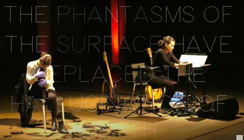 Curators and artists in the search for new formats of display are often inspired by other artistic disciplines such as theatre, architecture, graphic design or the visual arts. The increasing user-friedliness of new technologies and softwares for live video, electronics and light makes it easier to integrate of non-musical elements into the context of classical and contemporary music. Arguing that a musical work is the sum of all sorts of materials related to that work, the performance Rasch 11: Loving Barthes, by the artistic research group MusicExperiment21 (ME21) combined an instrumental performance of Robert Schumman's piano work Kreisleriana with philosophical texts written about the piece,  as well as with films and information emerging from musicological research or personal associations of the performers. Similarly to other projects by ME21, the resulting performance echoes the work of postdramatic music theatre directors such as Heiner Goebbels or Romeo Castellucci, who both question the primacy of the musical text by confronting it to other media such as light, props and other texts. These do not illustrate the music but rather complement, comment upon or subvert it. Violonist Nigel Kennedy also draws on theatre when integrating in his performance of Vivaldi's Four Seasons, scenographic elements such as dynamic forest landscapes. Kennedy's casual clothing and his communicative way of interacting with musicians and the audience contrasts with the formal dresses and conduct of orchestra musicians, and reflects an unpretetentious approach to the classical music world. Choreography and dance also attract musicians, as in Transit, a staged concert in which musicians from the Berliner Kaleidoskop Soloists’ Ensemble, instructed by choreographer Laurent Chétouane, performed while walking amongst sitting audiences (read more here), or in Aberrant Decodings, a collaboration between guitarist Lucia d'Errico and dancer Marlene Freitas, where Freitas embodies a listener whose body is decomposed by the musical experience. Incidentally, Aberrant Decodings also experiments extensively with graphic design: the fonts of the text projected behind the performers are created for the performance and the speed of the projection is controlled by the performer along with the music.