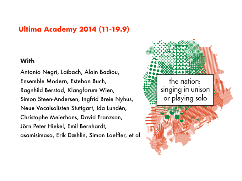 Ultima Academy (UA) was a programme of lectures, talks and screenings that accompanied the musical productions of the Ultima Oslo Contemporary Music Festival between 2012-15 (see Discourse), which UA looked at from within a broader socio-political perspective. By way of illustration, the 2014-edition of the Ultima Academy hosted the likes of political theorist Antonio Negri, pianist Ingfrid Nyhus, the Slovenian band Laibach, composer Simon Steen Andersen and music sociologist Esteban Buch to discuss concepts of power, ideology, ethics and cultural identity, and their connections with artistic practice. The programmes of UA and festival that year were intended both as pendant and reaction to the events celebrating the bicentennial of the Norwegian constitution, many of them uncritically glorifying the notion of nation. Taking place three year after the extreme-right terror attacks that shook the country’s political consciousness, it also marked the launch of the book Music after July 22nd, which looks at the many roles played by music in such a tragic event.