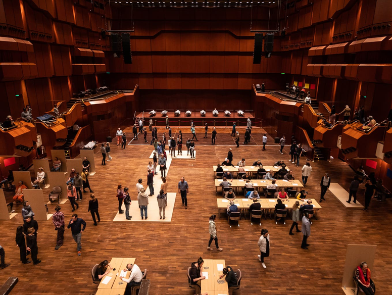 This project was created by performance artist Marina Abramovic and choreographer and director Linsey Peysinger in 2019 for the Alte Oper Frankfurt. A Different Way of Hearing was conceived as a reaction to the superficial and scripted way live classical music is listened to today, a mode of listening enhanced, or provoked by, our hectic lifestyle ('the tempo of life, thoughts, stress or smartphones'). and was announced as a ‘unique and unprecedented community event in which the public encounters music through the lens of performance art and a communal sense of mindfulness. As with all such projects, it is difficult to describe it using existing categories. The official description of the project says ‘large scale public participatory art and music'. In practice, it is a musical event preceded by a series of compulsory workshop. Informed by performance art, of which Abramovic is one of the best-known exponents, the purpose of the project was to explore the possibilities of body and mind in the search for personal and collective connection and transformation through listening, all of which are recurrent topics in Abramovic’s work.