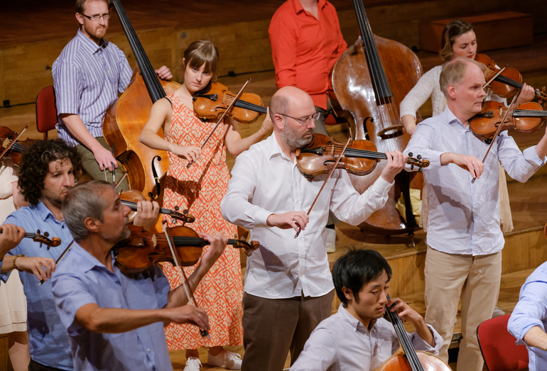Feeling that conventions such as seating and performing from scores on notestands restrained their musical expression and the ability to make direct contact with the audiences, the Norwegian Chamber Orchestra decided to perform Grieg's Holberg Suite by heart and in standing position. Far from exhausting, musicians found the fluidity of these new standing position liberating. They lost themselves in the music, which the audience partook in.