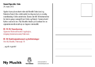 SoundSpecific:Oslo is a concert-concept combining sightseeing and sound technology. Developed by saxophonist Bendik Giske, composer and 3D-sound specialist Natasha Barrett and myself in 2012, during my tenure as guest curator for the Norwegian New Music Association, the purpose of the event was to introduce the audience to non-musical spaces with unusual acoustic properties through performances that would underscore these characteristic acoustics. In addition, we wanted to use the occasion to explore how our perception of a city is tied to our auditory memory. It proved complex to get access to many of the locations we had in mind, either for logistical reasons such as security and physical difficulty of access, lack of clarity about administration and proprietorship of abandoned or semi-abandoned spaces, or regulations concerning the use of public space. After an intensive period of venue scouting, we settled on two spaces in the city centre: the first was the western entrance hallway to the National Theatre Train Station, a place crossed daily by thousands of commuters familiar with the astonishing flutter echo caused by the circular geometry of the site. The second space was an underground storage room belonging to the national train company. Located inside of a grotto underneath the same train station and made accessible to the audience from the street through an emergency exit, this cave-like room was known only to a few, and exhibited highly reverberant acoustics typical of caves. After guaranteeing access to these two locations, engaging security personnel and studying safety protocols, we decided on a date for a one-day event featuring concerts with Giske and Barrett in these two spaces. The concerts were integrated into a city walk labeled as a soundseeing. During the concerts, Giske improvised on the saxophone while Barrett manipulated the acoustics of the spaces. Using a sound processing technique called Higher Order Ambisonics, she transformed the space into a three-dimensional sound environment that interacted with the sound of the saxophone as if it were a musical instrument. The soundseeing was followed by a concluding performance in the office spaces of NyMusikk, where we digitally simulated the acoustics of all of the spaces visited earlier in the day.
