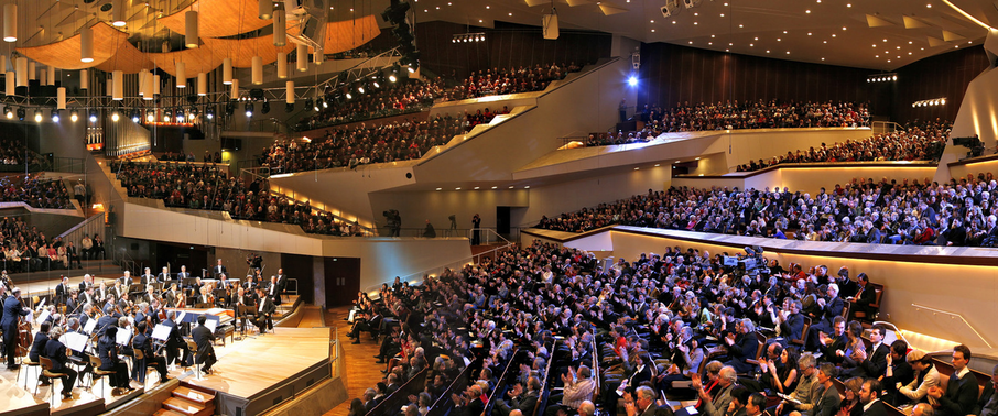 We will later look at the sociopolitical implications of how a concert house is built. For now, I would like to point out how the architecture of the concert hall itself, its acoustics in particular, sculpt our listening. There exists two main types of concert hall architecture, the shoebox shaped hall and the surround hall. The Konzertverein in Wien is a famous example of the first, and the Berliner Philharmonie, an example of the latter.