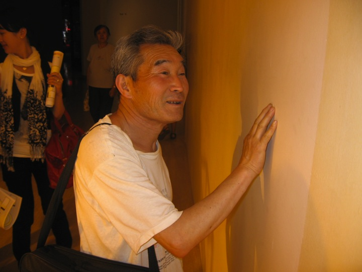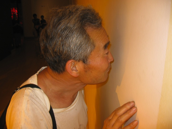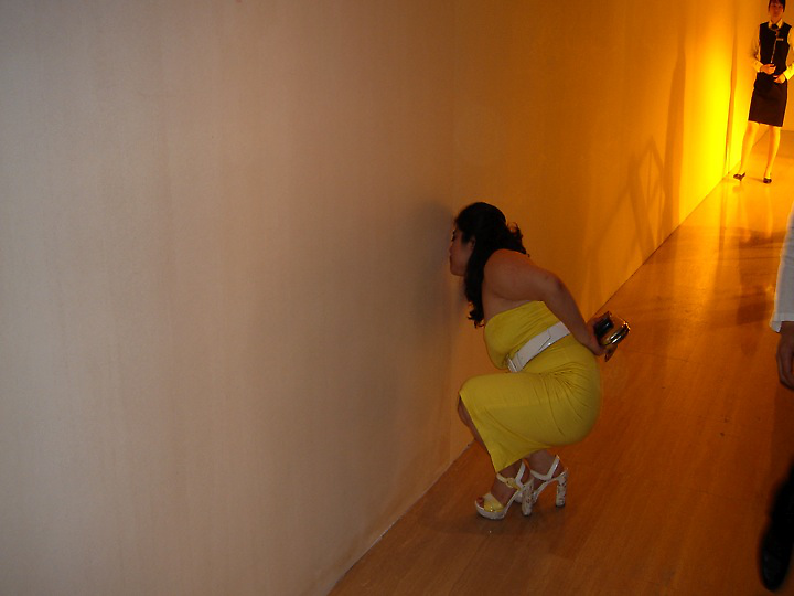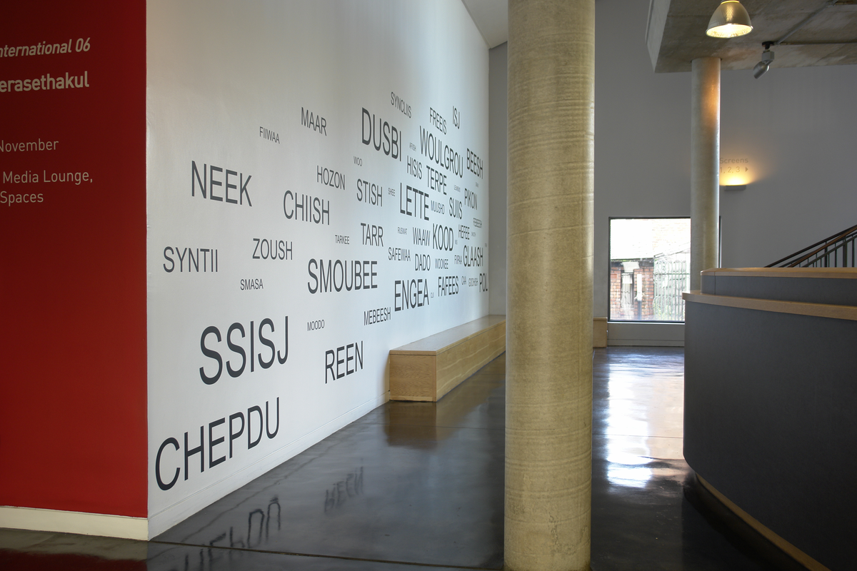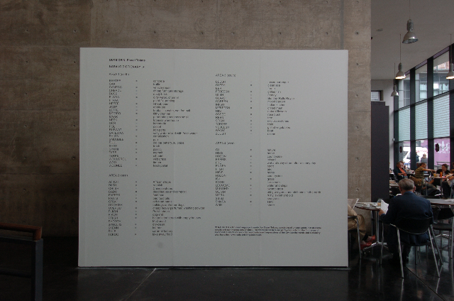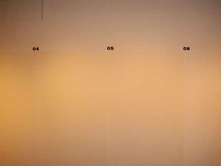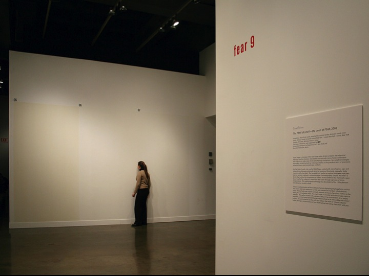 The micro-encapsulated simulated sweat molecules were then integrated into transparent smell-neutral binders with which the gallery walls were 'painted'. By doing so, only touching the walls released the smells. The smells were all painted next to each other without any clear borders, as if one body was positioned next to the other, merely separated by numbers positioned in the left corner of each 'smell portrait'.