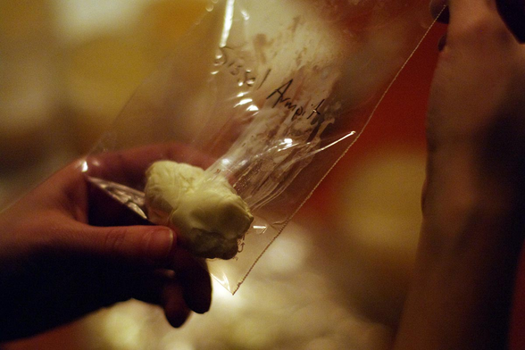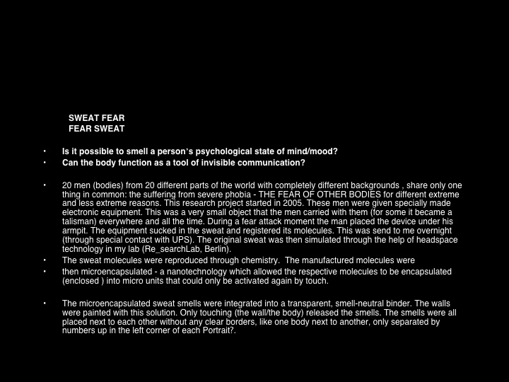 At the onset of a fear attack the men would place the device under their armpits. Subsequently, the equipment would suck the sweat in and register its molecules. The samples were then sent to the Re_search Lab in Berlin overnight (thanks to a special service provided to the project by parcel service UPC), where the original sweat samples were chemically simulated. The manufactured molecules were then 'micro-encapsulated' - a nanotechnology process in which molecules are packed together in micro units. The tiny membranes of these units rupture so easily that touching them activates the smell again.