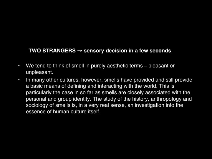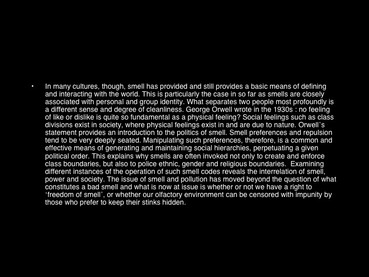 What we are dealing with now is a society full of Blandscapes, areas so empty of stimuli that they lead to an alienating sense of placelessness. The revolution in civic cleanliness has been accompanied by a revolution in personal cleanliness, and this came with the drive for deodorization. Sight has become the predominant means and metaphor for discovery and knowledge. What would happen if one were able to change this?