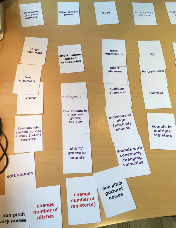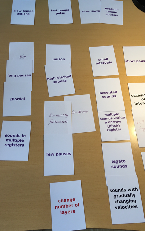 Early in this project, I imagined the above perspectives to be central to the artistic investigations of the project. However, I realized while reading and experimenting with applying these theories in my work, that as much as I find the topic of metaphorical-linguistic structures in the conversation on art and music in need of seriously being researched, it would not become the main focus in this project, and if done later, then maybe not by me. Researching that topic from the above starting point would become research on the structure of the language surrounding art. As such, it would have to become a theoretical study, and not necessarily to be even undertaken by an artist. This project’s main ambition, on the contrary, crystalized into applying and testing relevant perspectives and theoretical ideas, thorugh an artistic, creative process. The aim was to research through an artistic practice the musical phenomenon of klang (harmony, texture and timbre) – and to make interesting new music along the way. I would argue that the role of established metaphor theories in the project were to become critically restaged through the practical process of a.o. the card deck methodologies – se especially the pages Texture and Output.