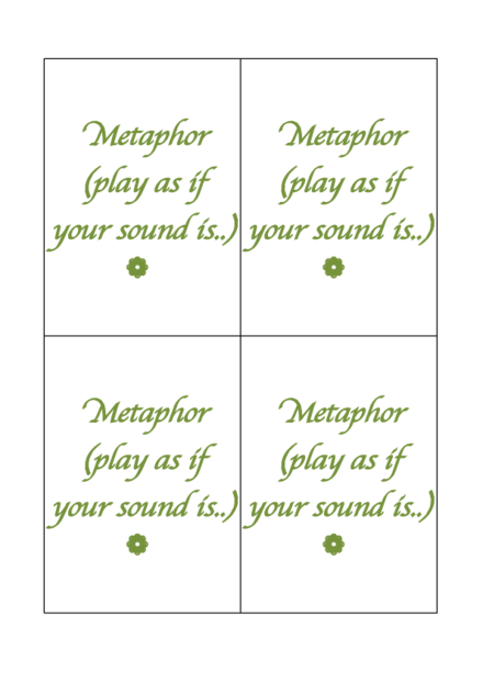 Before turning down the volume of the metaphor perspective (…), I had created the "Metaphor Card Deck" (see pdf on the right) for using metaphorical thinking as an empowering tool for collective music creation. Instructing a group of young (pre-conservatory level) students for a seven-day project in 2019, I created the Metaphor Card Deck that called for the students’ individual creative reactions to a number of metaphors being presented to them. Freely based on Howard Gardner’s (empirically unsupported, though sympathetic) theory of the multiple intelligences, coupled with a chain of thinking from Lakoff & Johnson, the card deck contained words representing multiple kinds of metaphors: spatial metaphors, visual metaphors, narrative, logical, kinesthetic, interpersonal, intrapersonal, orientational, existential, moral and ecological metaphors. Almost no obvious links to music vocabulary was present on the cards, therefore being left open to the creative interpretation of the musician.