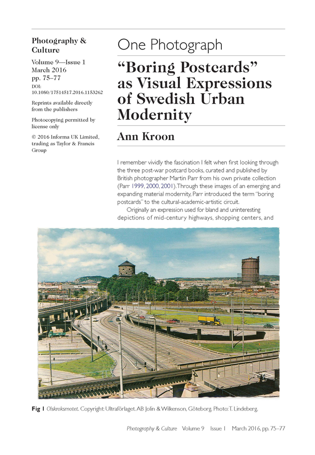 Kroon, A. (2016), " 'Boring Postcards' as Visual Expressions of Swedish Urban Modernity". Photography & Culture, 9(1):75-77.