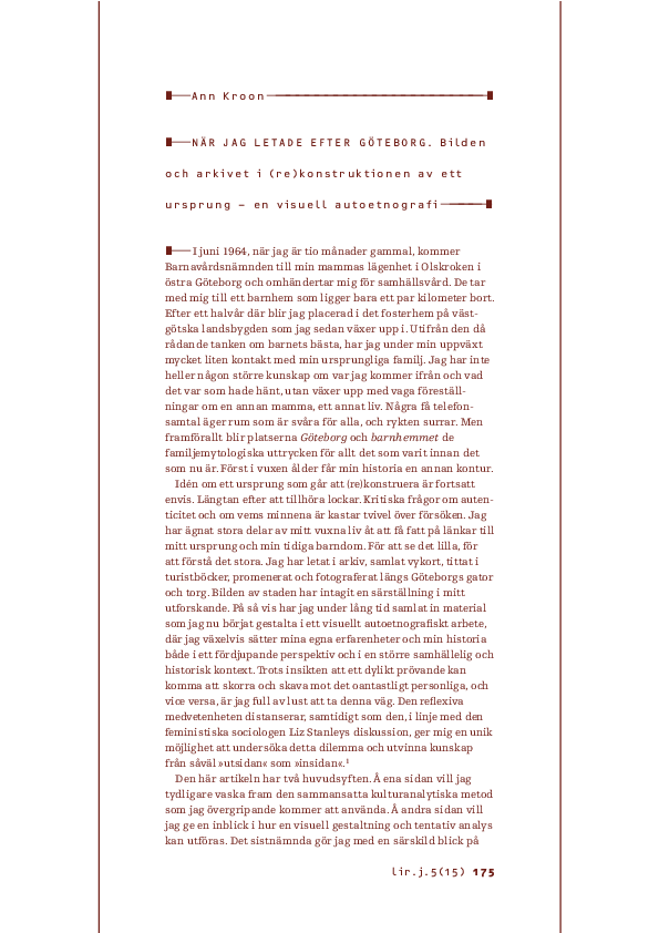 Kroon, A. (2015), "När jag letade efter Göteborg. Bilden och arkivet i en visuell autoetnografi". LIR Journal, 5(15):174-90.