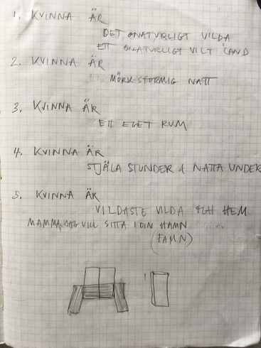 To rehearse the prologue to Kersti’s 50%-seminar, I need to screw the wooden frame together. All of a sudden it feels too much. Is it typically me not being able to settle for less? The desire to widen the perspectives and bring things further? Since it is my idea, I am responsible for rehearsals. Costumes and fika are fixed. I have refreshed the alphabet and how to say hi, welcome, my name is, coffee, tea, milk and crackers in sign language. The performers have been asked to bring 4-5 one-liners starting with Woman is… plus a Lived experience from your womanhood – a situation you found yourself in and how you reacted to it.