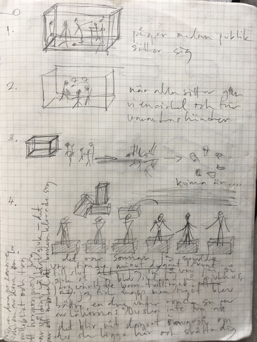 Time aspects and finance not taken into consideration; what if the editing would be more ambitious to operate for those who cannot see and for those who cannot hear? what if cinematic tension in the relation between eye, ear and body were stretched further? what if our bodies were left in silence? what if the cuts were even steeper – creating montages within the montages? what if cognitive comprehension was even more challenged? what if risk taking was performed as vulnerability? what if the figures/roles/us acknowledge being watched?