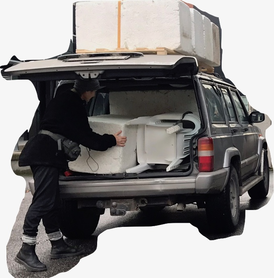 To be able to transport the six styrofoam blocks, I steal-borrow a pallet from a construction site in our neighborhood and tie it to the roof of the car. There is a tension in the grey-light and in the air, almost literally, like in a rubber band. The blocks are dirty and stink from years of serving as swimming pool cover holders. Since it is Saturday night, I assume no one will use the car wash area in the garage, so I put them there, soak them, lather them, rinse them off. Five blocks fit on the roof, and if I fold down the back seat the sixth plus the garden chairs fit in the trunk. I wonder what kind of fantasy the image invokes.