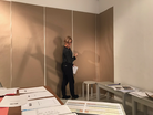 The gallery is closed. Working alone in the Open Studios. Focusing on getting the brown carpet lining up on the wall. Indecisive – space between gores or not?