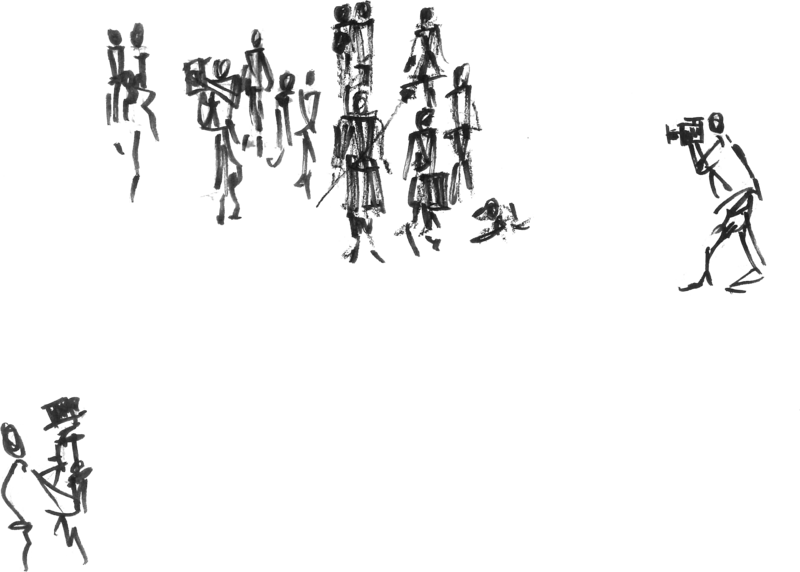 After sharing this premise, we start our excursion, staging the filming of background research on a character, inviting the conference participants to handle cameras and microphones. Presenter Annika assumes the role of research interviewer, involving the surrounding people in what to ask the character FILM SCHOLAR to get to know him. Presenter Kersti assumes the role of FILM SCHOLAR, involving the crowd in what to answer, what tone of voice and posture, his manner, language etc. – co-creating his background and personality, trying things out, involving the place and the time.