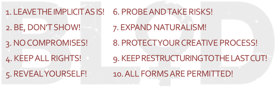 The BLOD method is articulated as a Manifesto, written to accommodate a multitude of contents, forms, and modes of collaboration, while demanding cross-disciplinarity, honesty and risk-taking. The method is non-linear, looping, and embedded in the manifestations of the research: films, performances, presentations, etc. BLOD research activities include: making cinematic building blocks that allow and induce multiplicity, improvisation, and fluidity of form; sharing personal experiences through fictionalized documentary processes; dealing with ethics in interpersonal and ecological relations.