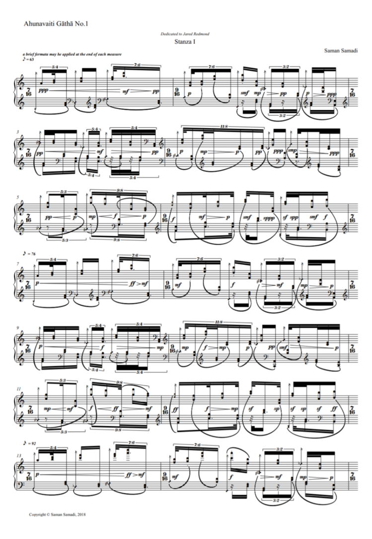 "Ahunavaiti Gāthā no.1, stanzas I and II" were dedicated to Jared Redmond by whom they were premiered at the San Francisco Center for New Music, San Francisco, CA, on Friday, February 15, 2019. This is the recording of the Asian premiere, by the same pianist, at Hanyang University, in Seoul, South Korea, on Monday, June 3, 2019.