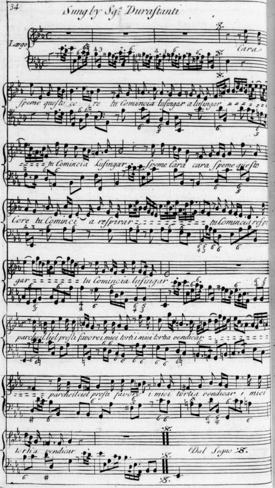 This aria (with some slight changes) was re-used as a continuo aria in Handel’s second opera for the London stage, Il Pastor fido (1712). Handel composed a final ritornello for the strings that uses motifs from the singer’s material:[22]