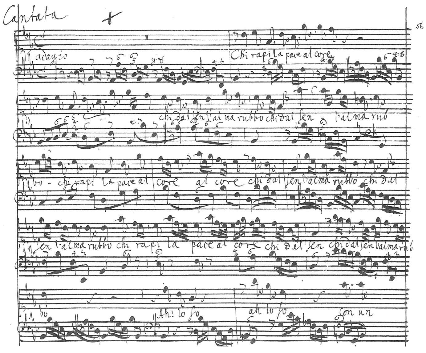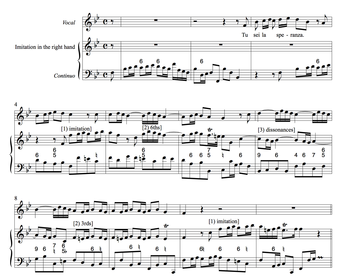 Occasionally, I have come across a fragment in the keyboard music that reminds me of a certain passage in a cantata – melodically or harmonically. Two examples from the famous cantata Lucrezia can illustrate this: