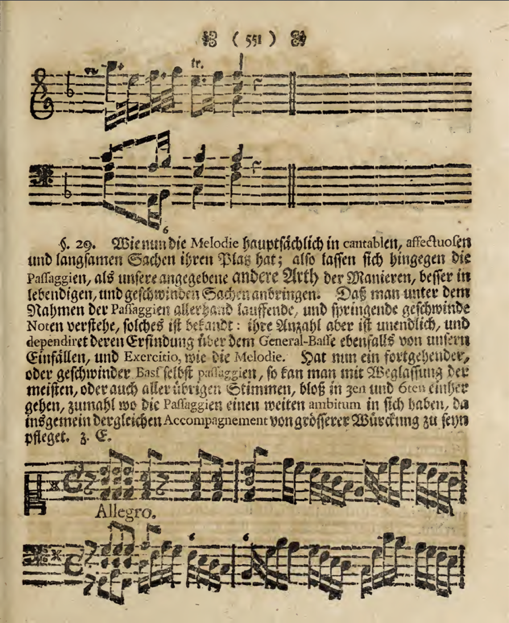 Heinichen, Der Generalbass, 551 §.29. ‘Wie nun die Melodie hauptsächlich in cantablen, affectuosen und langsamen Sachen ihren Platz hat; also lassen sich hingegen die Passagien, als unsere andere Arth der Manieren, besser in lebendigen, und geschwinden Sachen anbringen.’ ↩︎