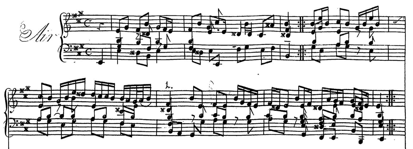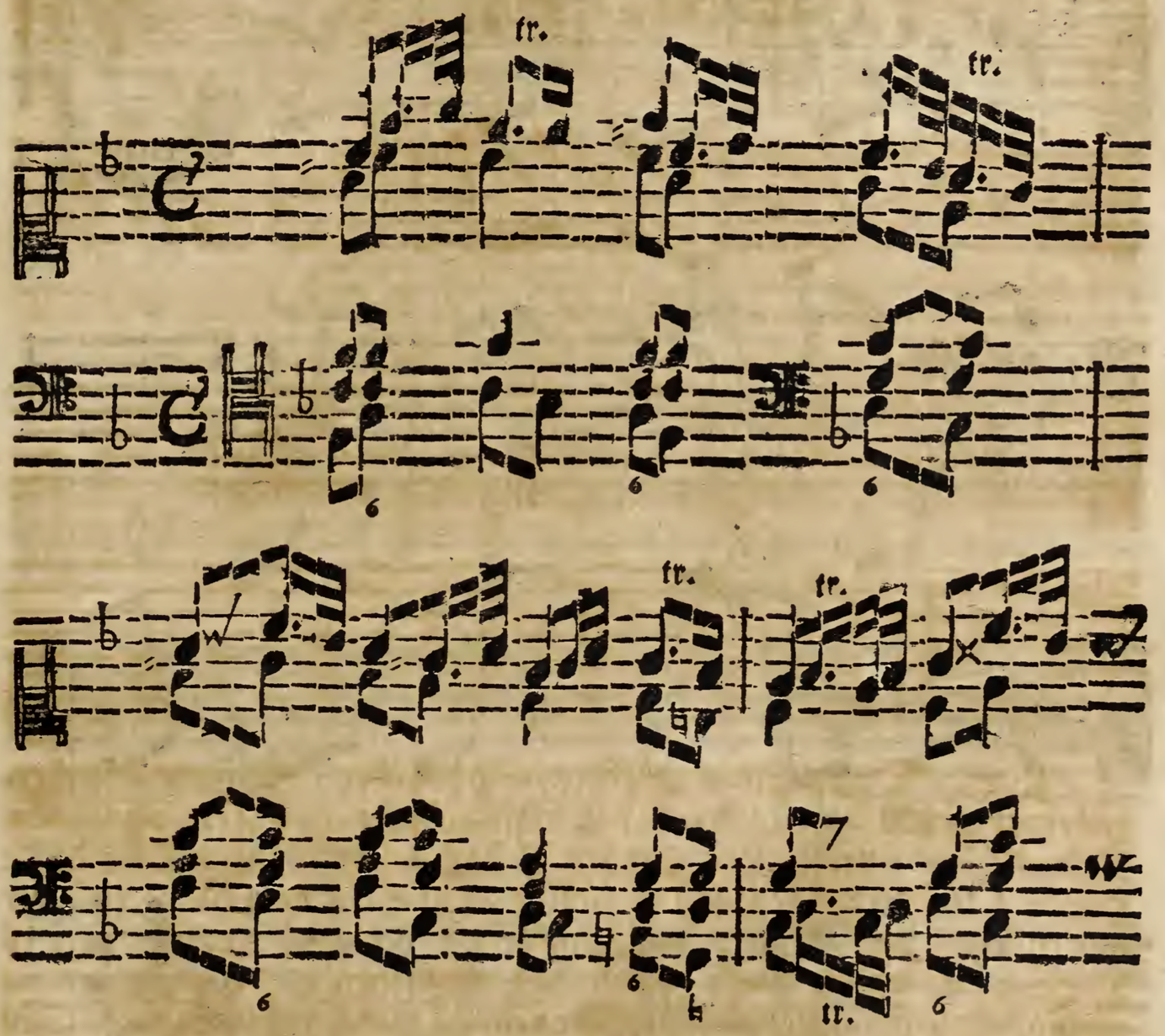 *) Quand on accompagne une voix seule qui chante quelque Air de mouvements, dans lequel il y a plusieurs imitations de chants, quelque sont les Airs Italiens; on peut imiter sur son Claveçin le Sujet & les Fuges de l’Airm faisant entrer les Parties l’une après l’autre; mais cela demande une science consommé, & il faut etre du premier Ordre, pour y reussir.’ St. Lambert, Traité de l’accompagnement, p.6.’ ↩︎