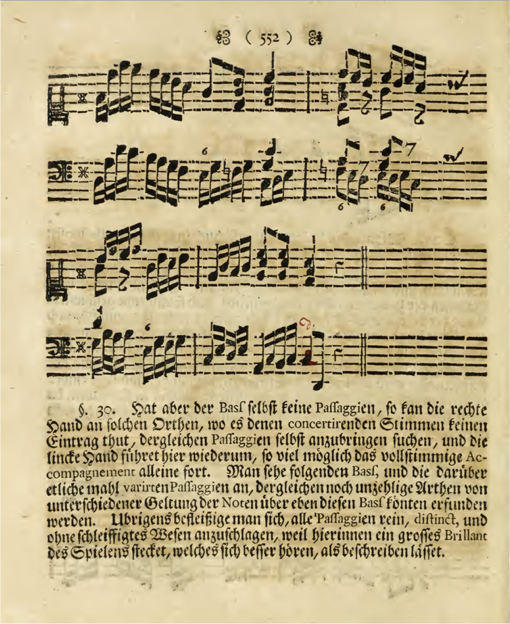 Wenn*) man zu einer einzigen Sing-Stimme den General-Baß spielet / und etwa eine muntere / lebhaffte Arie vorkömmt / darin viele Nachahmungen anzutreffen sind / so wie wir sie in den Italiänischen Sachen finden; alsdenn kann man auf seinem Clavier den Haupt-Satz und die Fugen der Arie wol nachahmen / auch die Stimmen / eine nach der andern / anbringen. Aber es gehöret eine völlige Wissenschaft dazu / und es muß ein Meister vom ersten Rang seyn / dem solches gut von Stattengeben soll.’