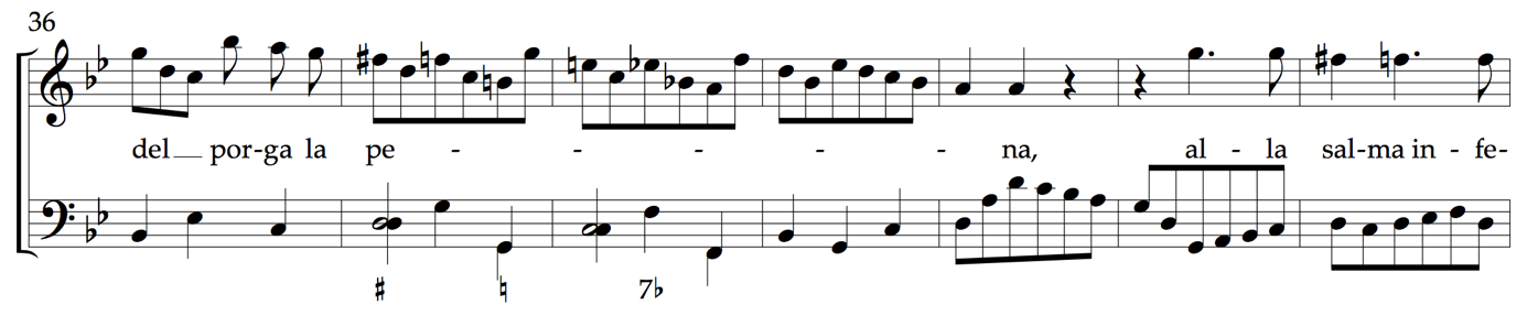 Occasionally, I have come across a fragment in the keyboard music that reminds me of a certain passage in a cantata – melodically or harmonically. Two examples from the famous cantata Lucrezia can illustrate this: