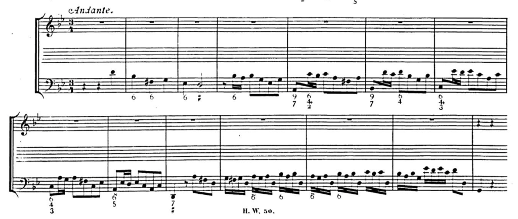 Jesper B. Christensen, ‘Zur Generalbaß-Praxis bei Händel und Bach’, 72. Christensen suggests an advanced realization based on advice from 18th-century sources in the continuo cantata, Dolce mio ben, no. 14 in Chrysander’s edition, today not attributed to Handel anymore, but the principles remain the same. ↩︎