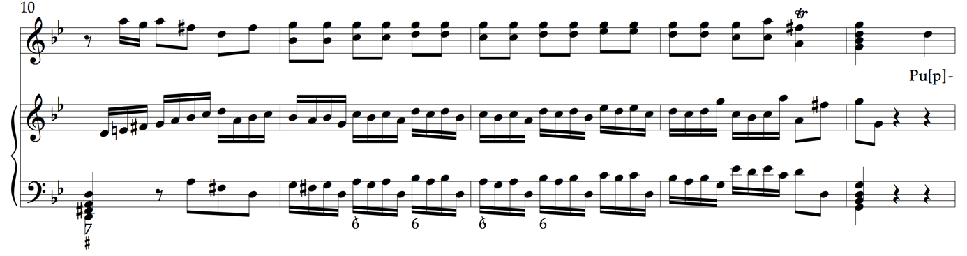 My Diplomarbeit (a substantial text on a self-chosen subject) at SCB was devoted to the type of four-part continuo playing where the hands (mainly) take two parts each, called divided accompaniment. It has its roots in early 17th-century continuo playing from score and this idiom found its way into the keyboard repertoire. As late as C. P. E. Bach, it was considered an art in itself, and mostly used for nicety, variety, and sometimes out of necessity due to voice leading or practicality. Divided accompaniment allows for a more melodic voice leading in the inner parts, and it is easier to add ornaments when there’s a voice less in the right hand. My research into this practice sparked my interest in exploring other alternatives to the traditional form of chordal accompaniment where the left hand plays the bass and the right hand supplies the chords.