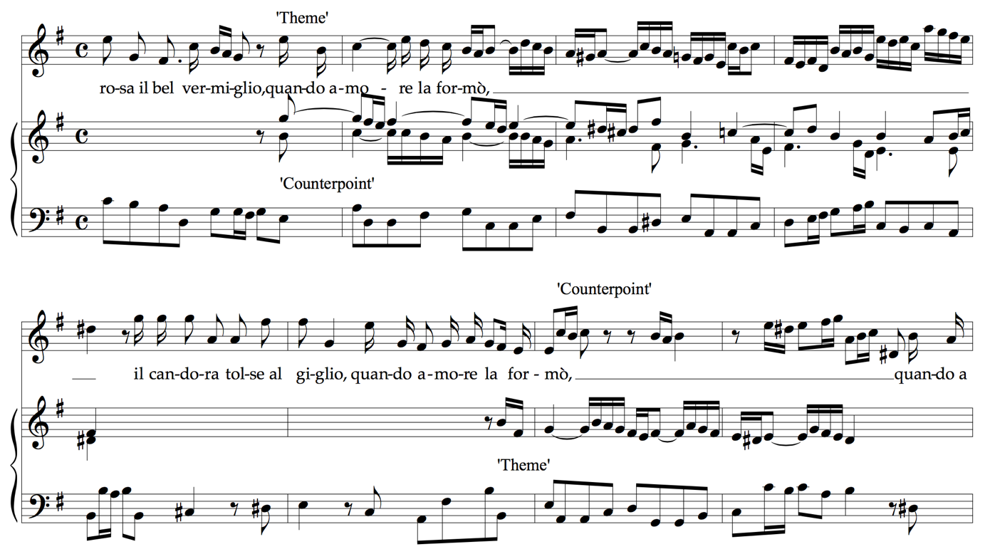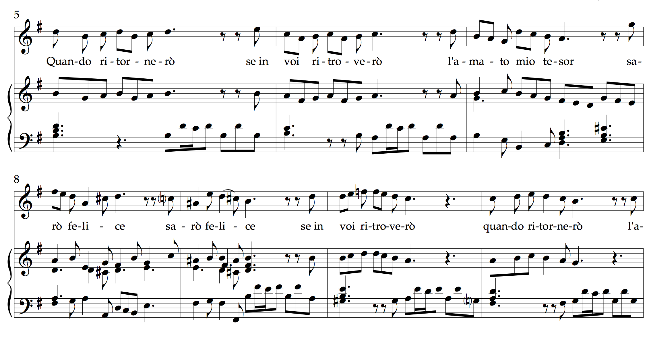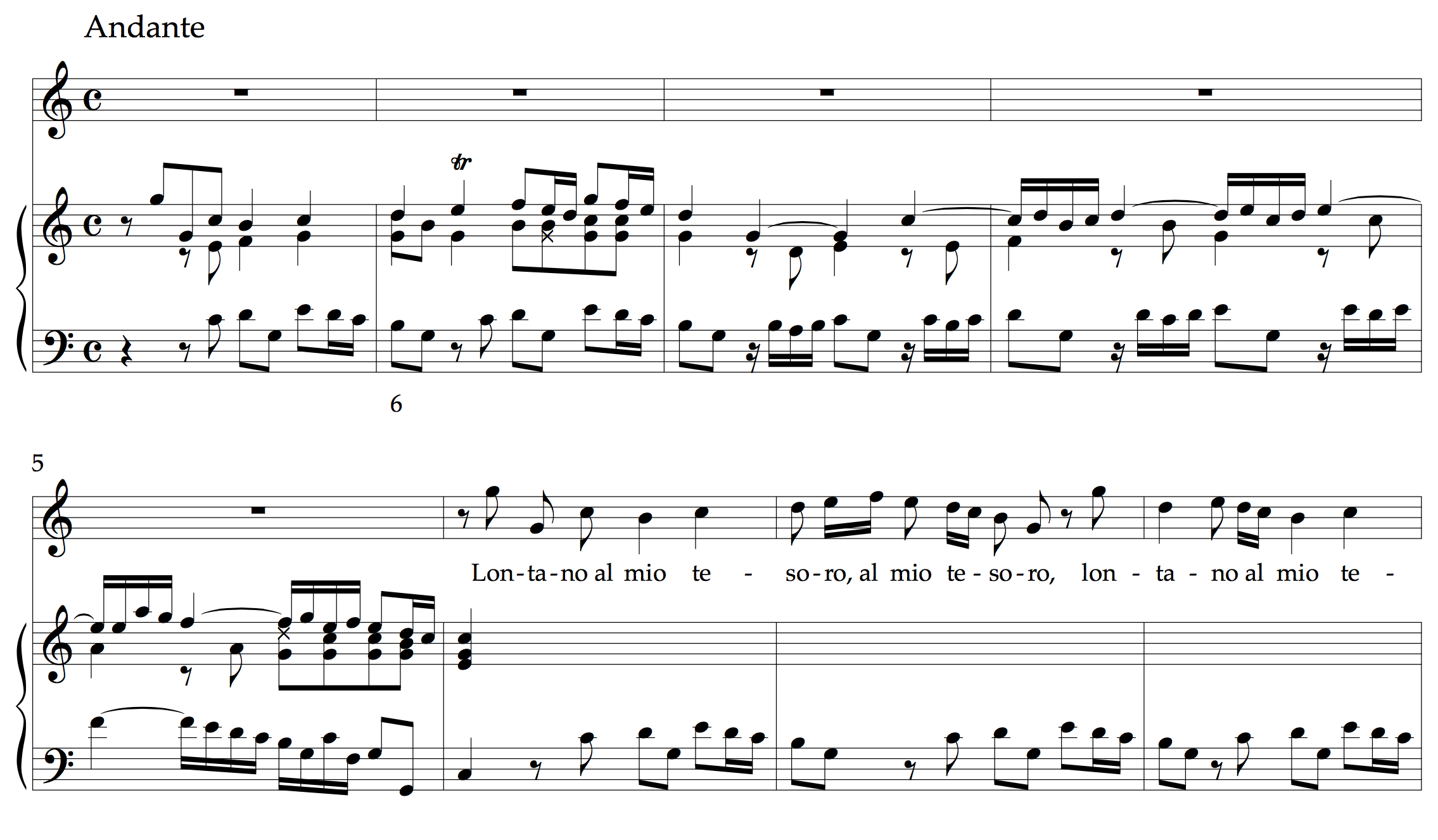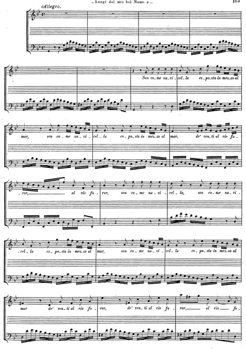 When I develop realizations, I alternate between a compositional approach and an improvisational approach. To show how one can construct a realization using a compositional approach, I will use the first aria ‘Lontano al mio tesor’ from Lungi dal mio bel nume.