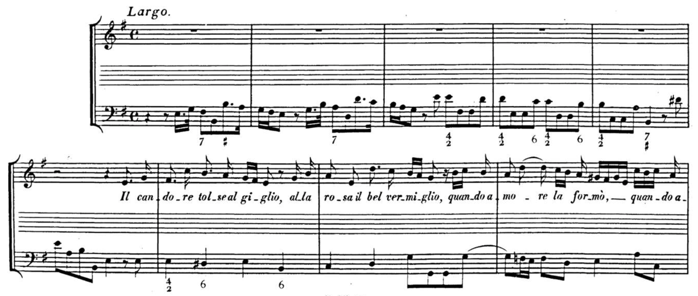 Heinichen, Der Generalbass, 578, §.40. ‘[…] Weil aber doch seltene Casus vorkommen können, […] (sonderlich in Cantaten und Arien ohne Instrumente) […], da ein geschickter Accompagnist die im General-Bass, oder in der concertirenden Stimme angegebene Clausul mehrmahl wiederhohlen könte, […] daß die rechte Hand die concertirende Stimme gern suchet in 3en und 6ten zu begleiten, und gleichsam ein concertirendes Duetto mit ihr zu machen. Welche Arth der Imitation sonderlich in cantablen Sachen wohl ausfället, und desto leichter zu bewerckstelligen ist, weil man in Cammer- und Theatralischen Sachen den Sänger aus der gewöhnlich darüber geschriebenen Stimme genau observiren, ihm ausweichen, und wiederum nachgehen kan.’ My translation. ↩︎