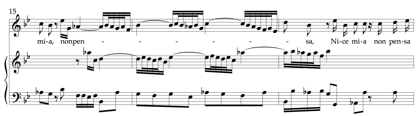 Occasionally, I have come across a fragment in the keyboard music that reminds me of a certain passage in a cantata – melodically or harmonically. Two examples from the famous cantata Lucrezia can illustrate this: