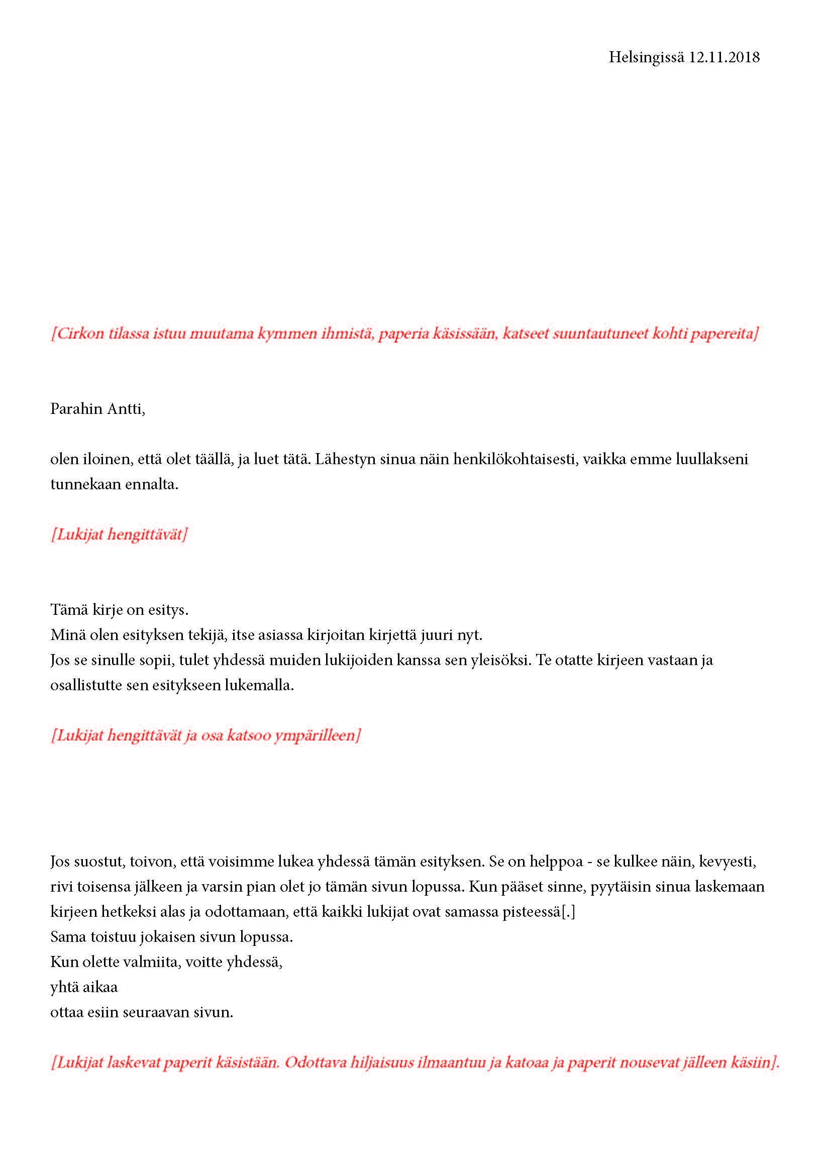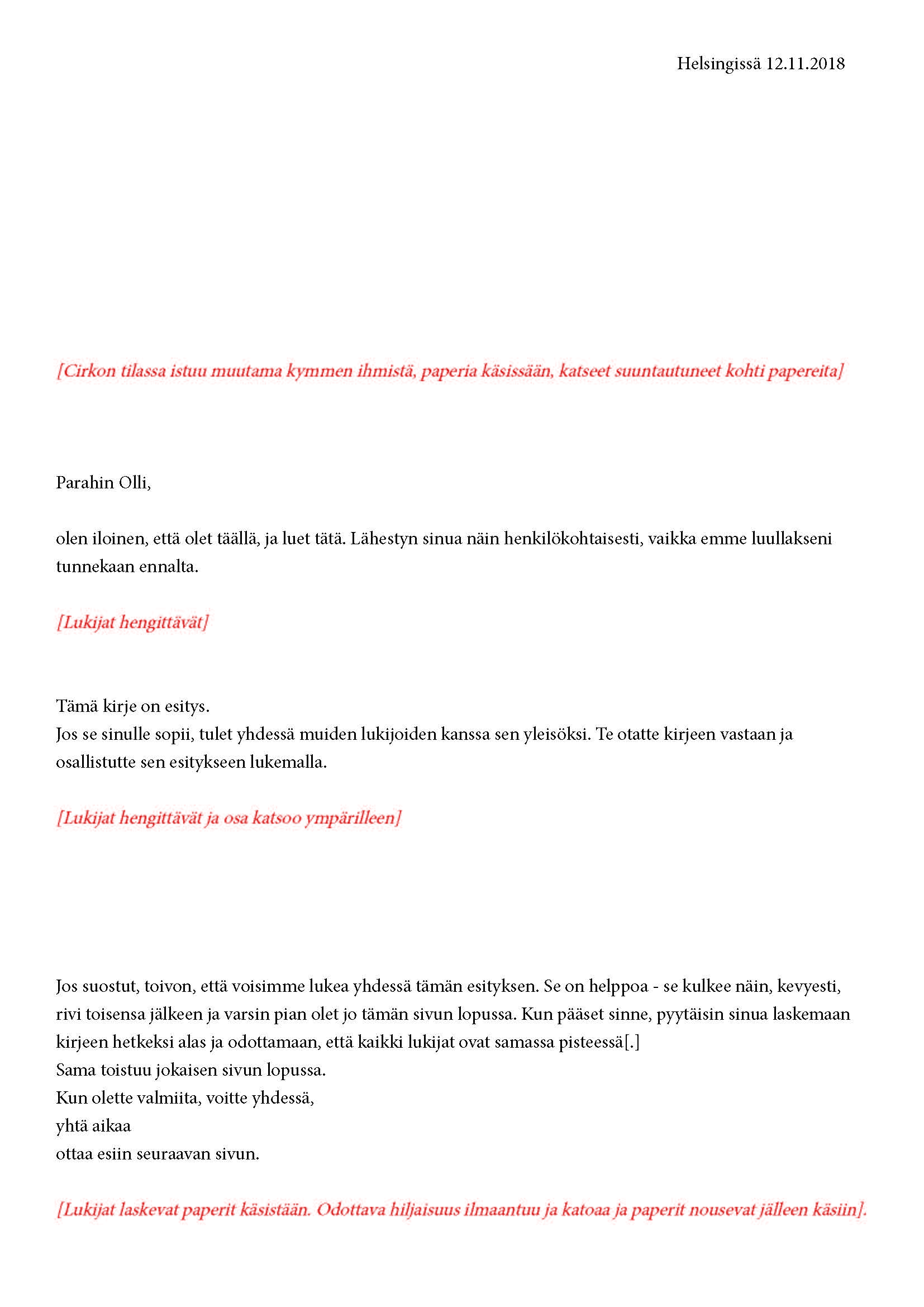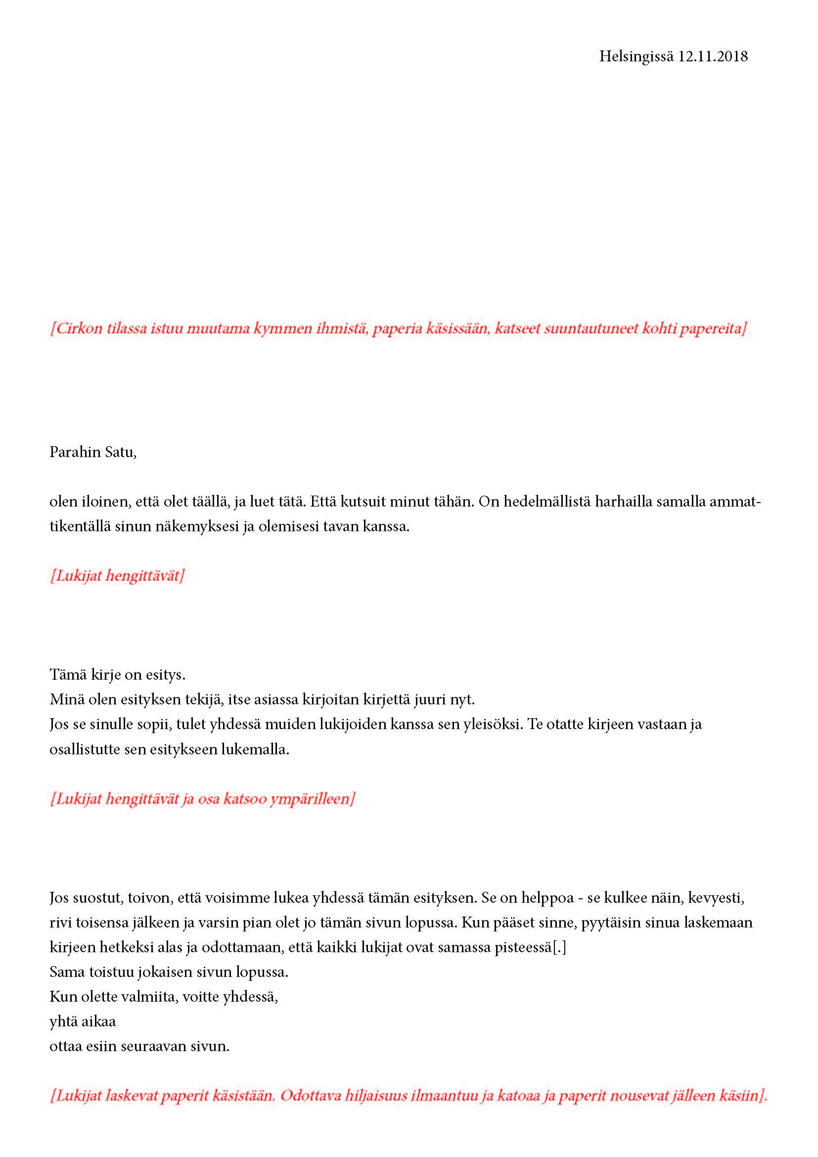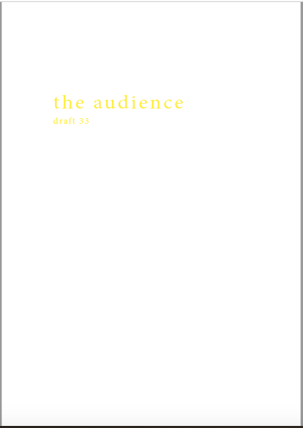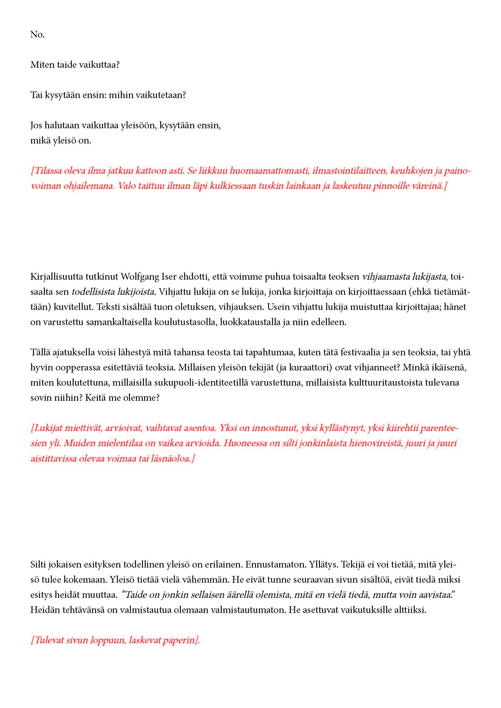 Mikä yleisö on? Miksi esityksessä on yleisö? Väitöstutkimuksessani käsittelen näitä kysymyksiä ja pyrin luonnostelemaan teoreettista esitystä yleisöstä. Hahmottaakseni asiaa olen toteuttanut sarjan esityksellisiä luonnoksia, joissa yleisö katsoo itseään ja esitystilannetta. Näissä luonnoksissa yleisö on paikalla, mutta esitys, näyttämötapahtumien merkityksessä, puuttuu. Näyttämötapahtumien sijaan olen kussakin luonnoksessa valmistanut yleisölle tekstin, joka toimii käsikirjoituksena tai lukuohjeena. Valitsin tapahtumallisen tekstin, jotta voisin käsitellä esitystä sen tavanomaisessa ympäristössä, elävänä tapahtumana, ja samalla rakentaa teoriaa sen tavanomaisessa ympäristössä, tekstinä. Olen kokeillut luonnosteksteille erilaisia muotoja: käsiohjelma, kirje, vihko. Vaihtelua on myös siinä, puhuttelenko yleisöä enemmän ryhmänä vai yksilöinä sekä anonyymeinä vai tiettyinä henkilöinä. Toisissa luonnoksissa kaikilla on sama teksti, toisissa tekstejä on useita, joissain jokaisella on oma henkilökohtainen tekstinsä. Luonnokset ovat aina tilannesidonnaisia.