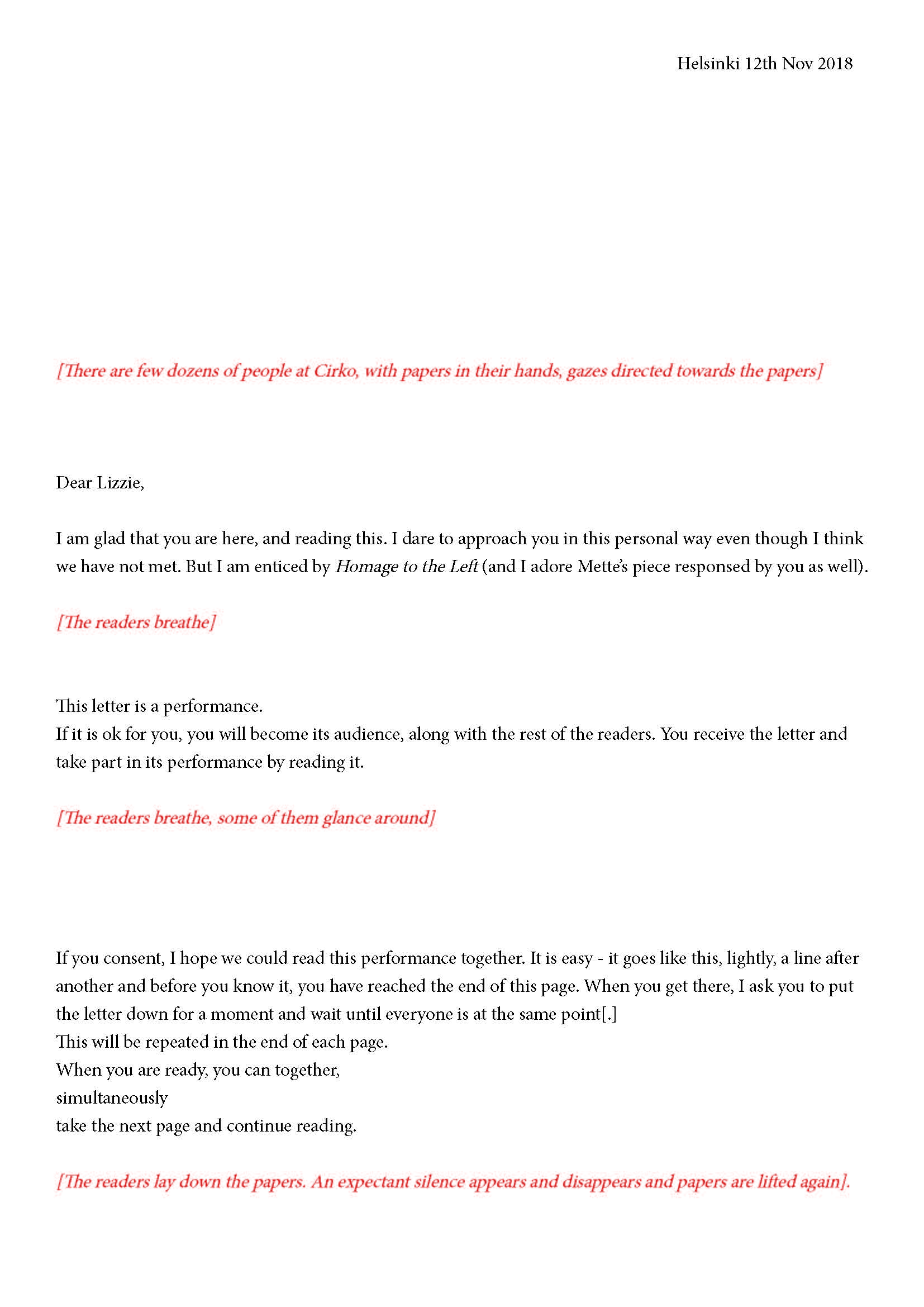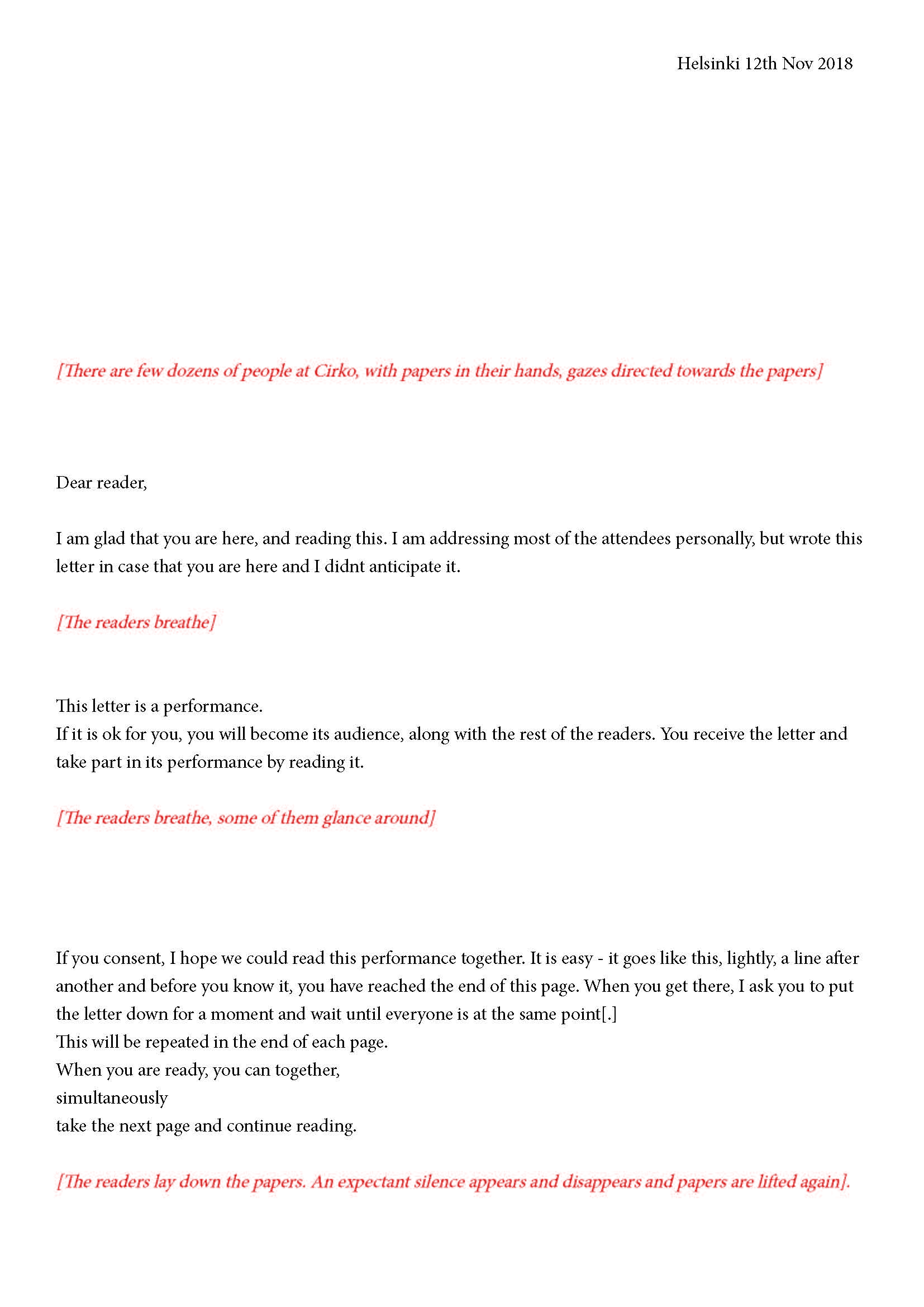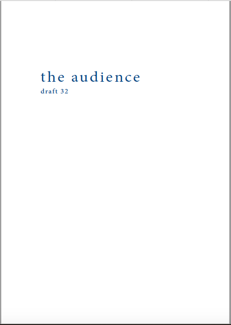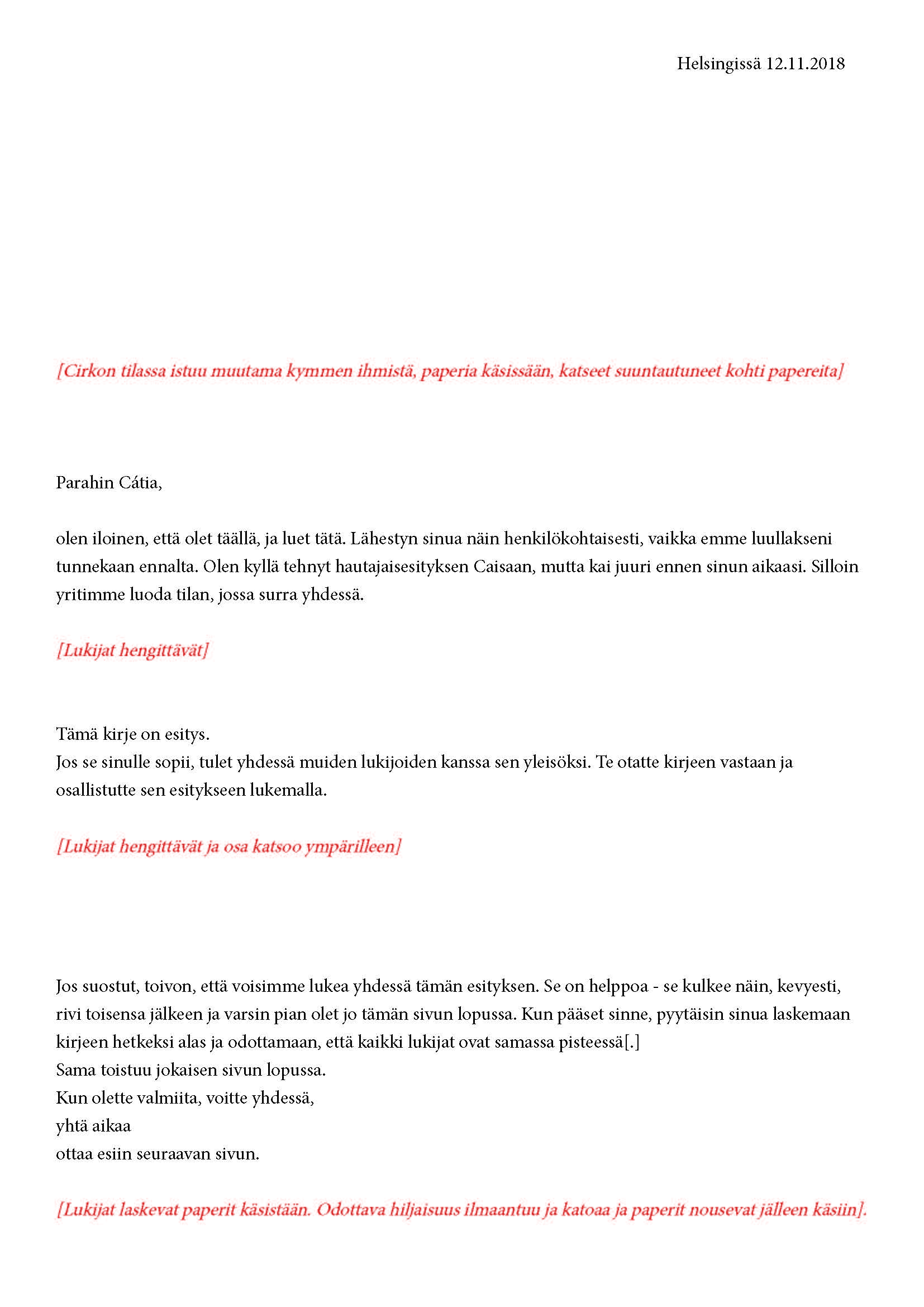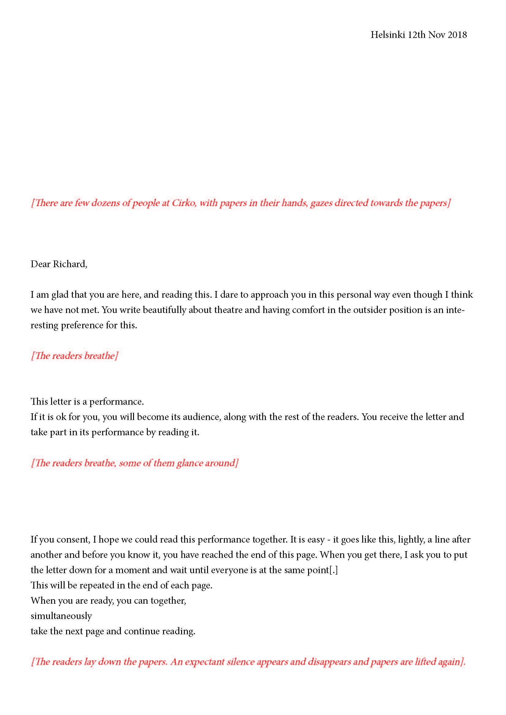 Mikä yleisö on? Miksi esityksessä on yleisö? Väitöstutkimuksessani käsittelen näitä kysymyksiä ja pyrin luonnostelemaan teoreettista esitystä yleisöstä. Hahmottaakseni asiaa olen toteuttanut sarjan esityksellisiä luonnoksia, joissa yleisö katsoo itseään ja esitystilannetta. Näissä luonnoksissa yleisö on paikalla, mutta esitys, näyttämötapahtumien merkityksessä, puuttuu. Näyttämötapahtumien sijaan olen kussakin luonnoksessa valmistanut yleisölle tekstin, joka toimii käsikirjoituksena tai lukuohjeena. Valitsin tapahtumallisen tekstin, jotta voisin käsitellä esitystä sen tavanomaisessa ympäristössä, elävänä tapahtumana, ja samalla rakentaa teoriaa sen tavanomaisessa ympäristössä, tekstinä. Olen kokeillut luonnosteksteille erilaisia muotoja: käsiohjelma, kirje, vihko. Vaihtelua on myös siinä, puhuttelenko yleisöä enemmän ryhmänä vai yksilöinä sekä anonyymeinä vai tiettyinä henkilöinä. Toisissa luonnoksissa kaikilla on sama teksti, toisissa tekstejä on useita, joissain jokaisella on oma henkilökohtainen tekstinsä. Luonnokset ovat aina tilannesidonnaisia.