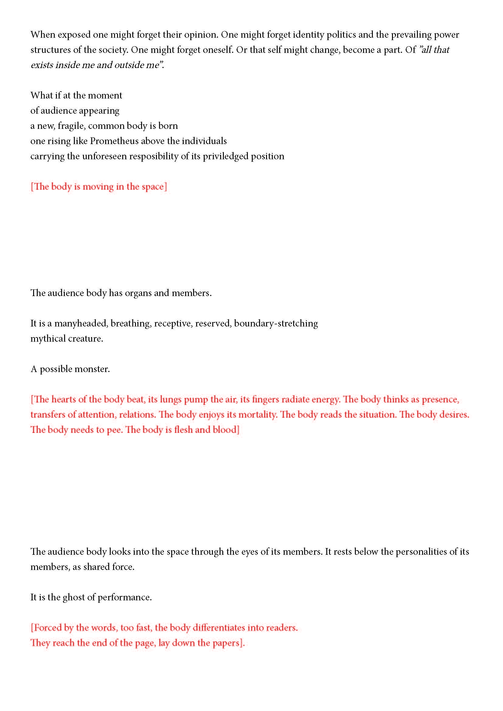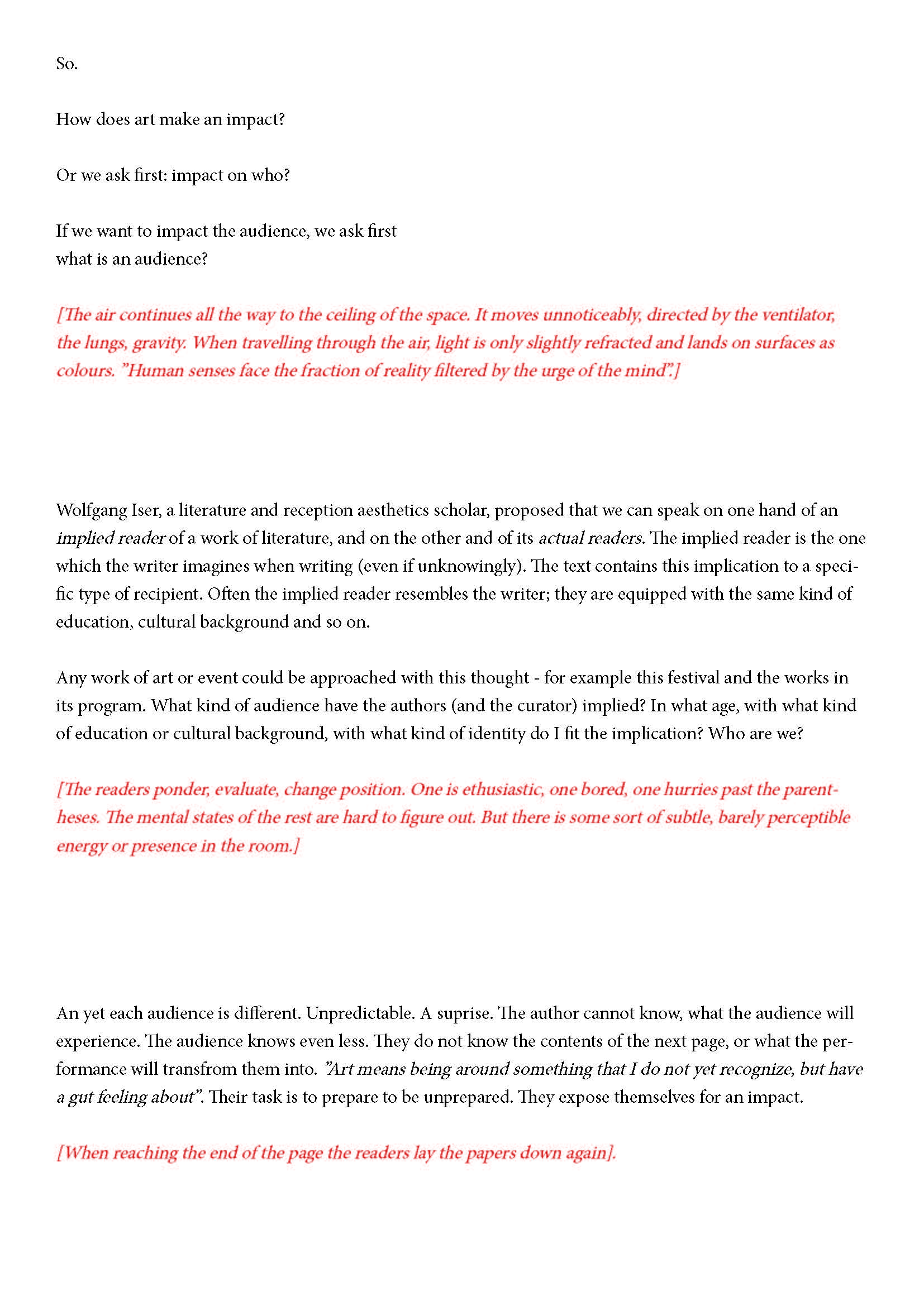 Ehdotan silti jotain. Olen kiinnostunut yleisön synnystä tai luomisesta -- jonkinlaisena yhteisyytenä. Toivon, että voit auttaa minua siinä hieman. Jo lukiessasi tätä luot yhdessä muiden kanssa monikollista olemusta. Suostuessaan se olemus ottaa yleisön muodon.