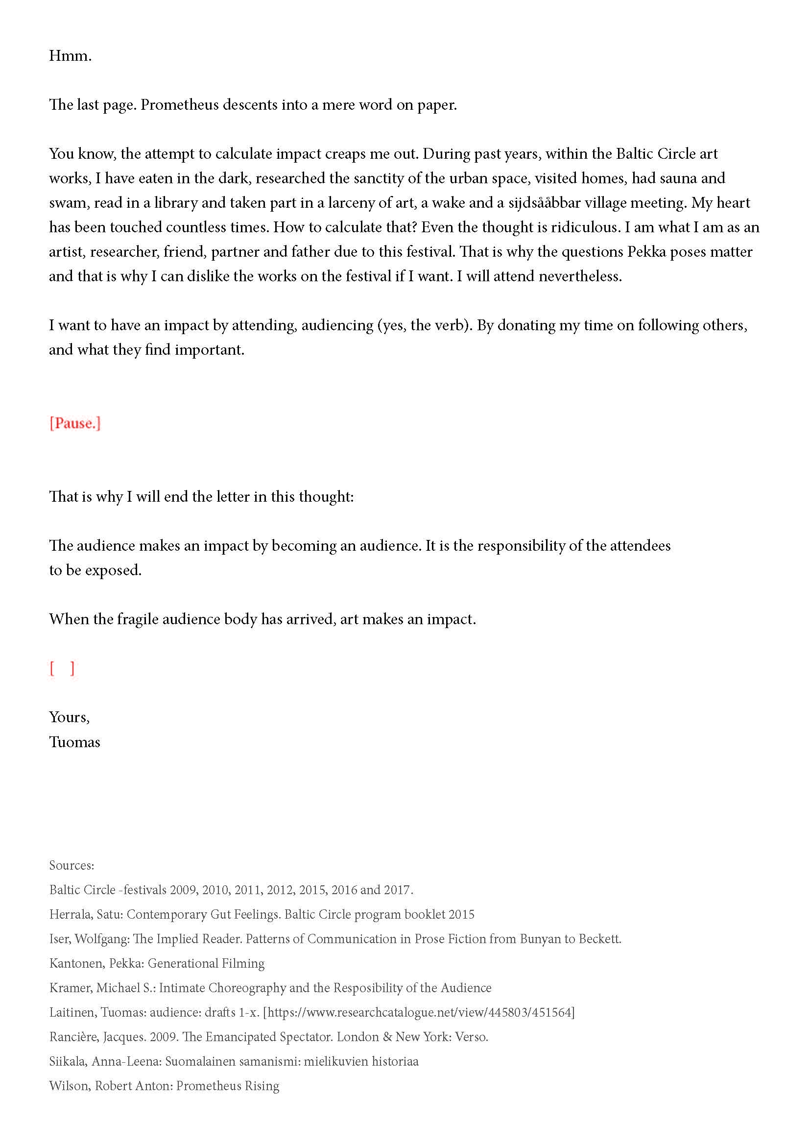 Kiitos kun tulit. Tätä onkin jännittävää kirjoittaa. Tiedät kirjeen sisällön jo ennalta, joten noidankehästä ei pääse eroon. Tämä on tutkijan paradoksi, jota en voi olla käsittelemättä. Toivon, että pääset osaksi yleisöä.
