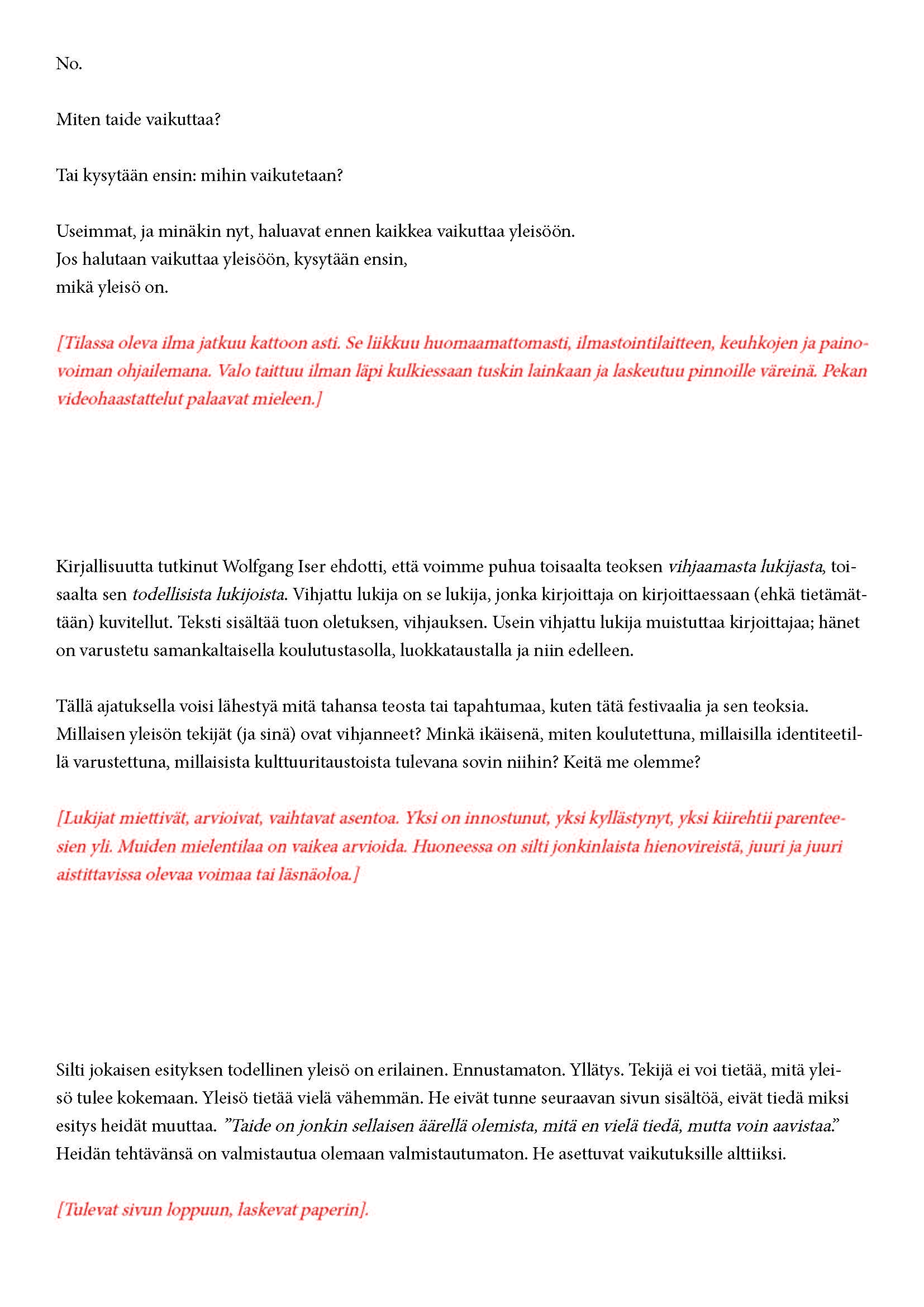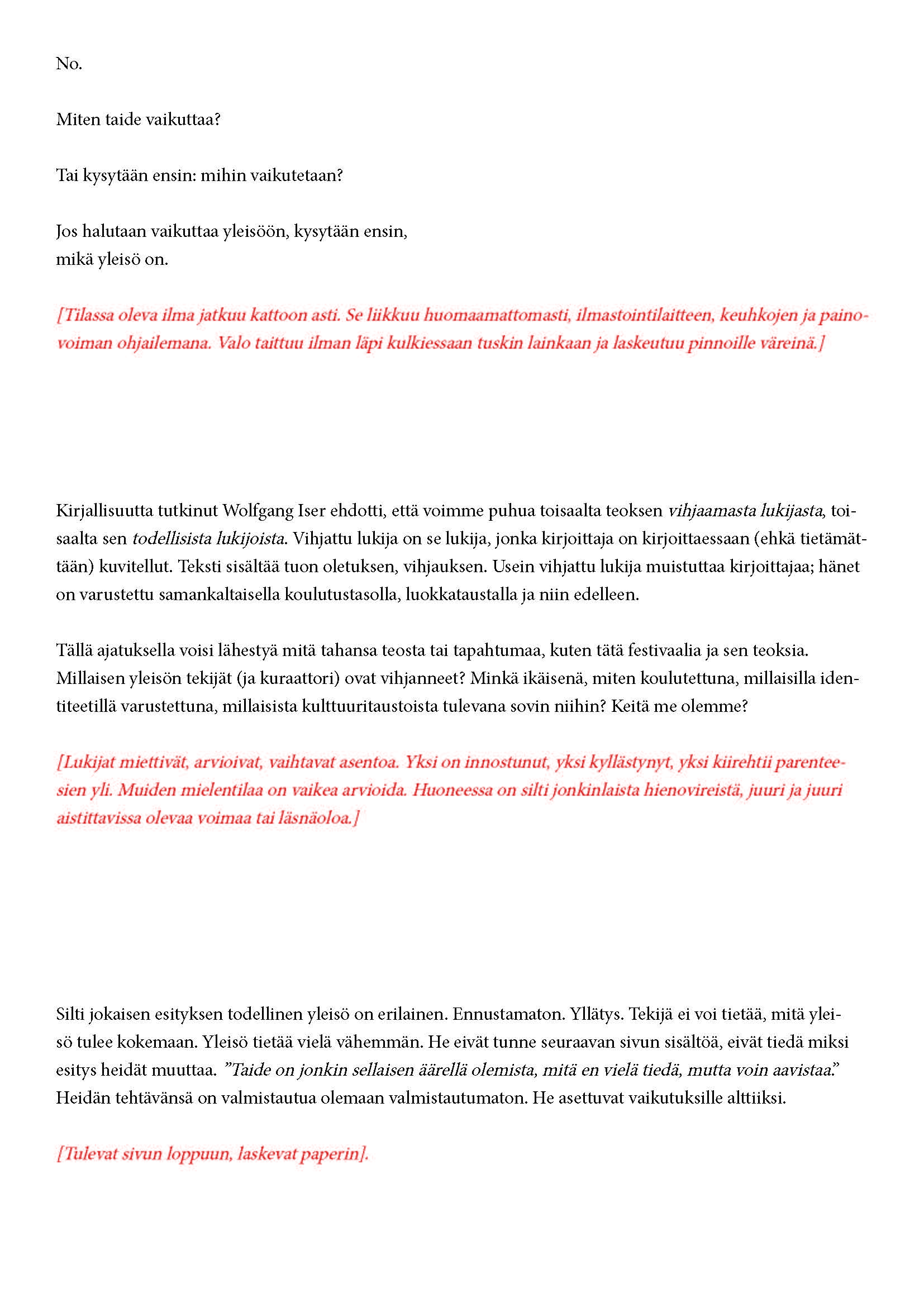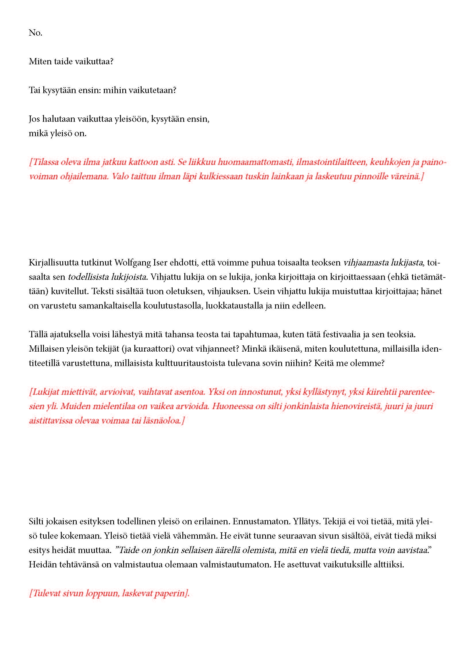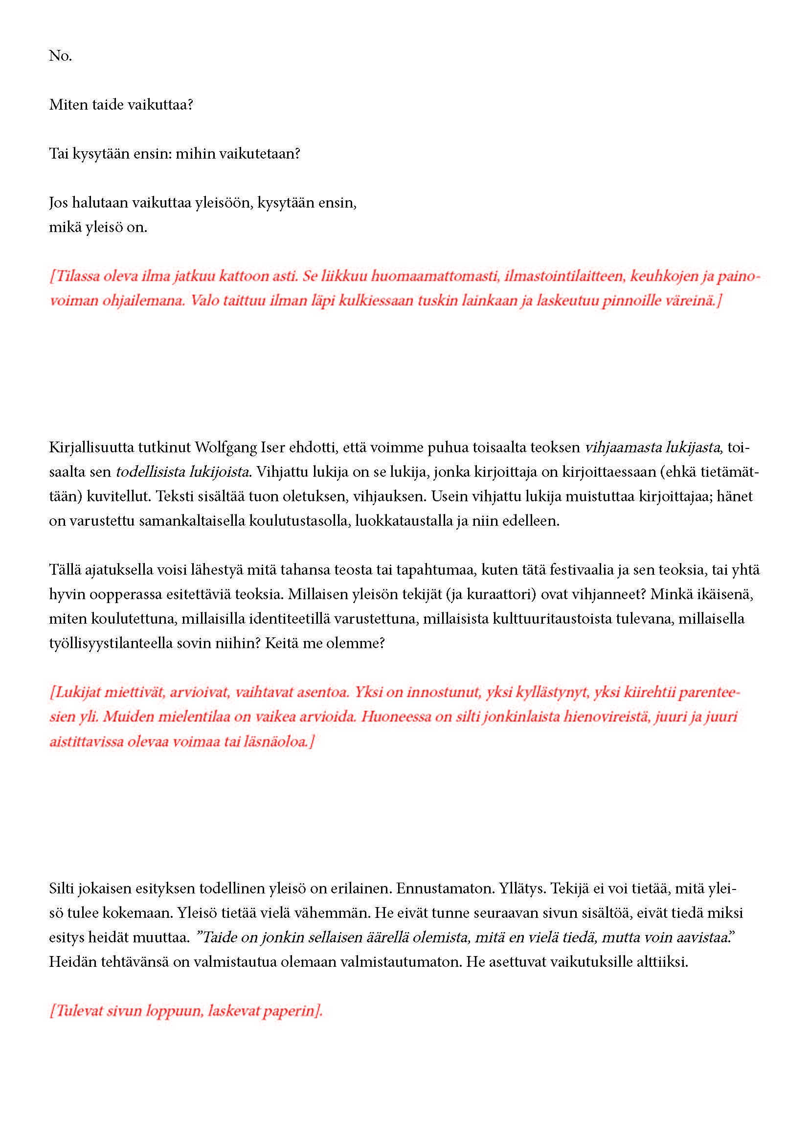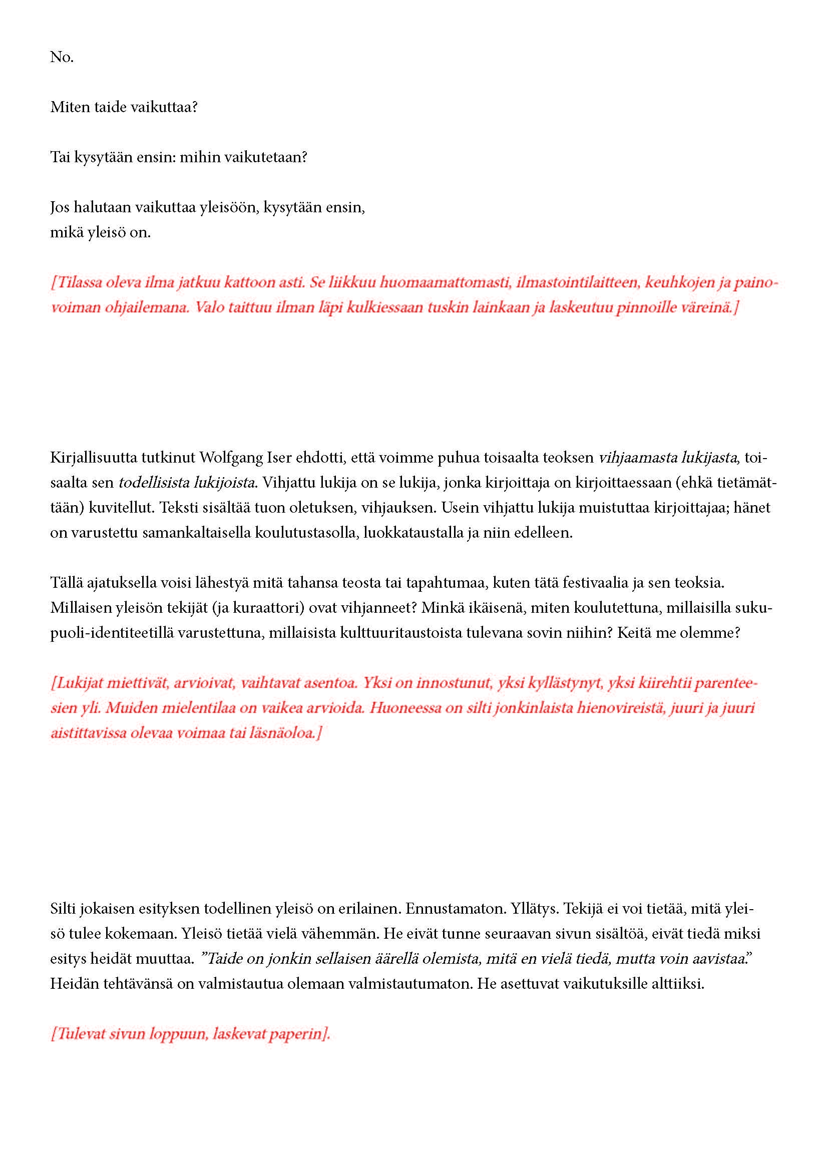 Mikä yleisö on? Miksi esityksessä on yleisö? Väitöstutkimuksessani käsittelen näitä kysymyksiä ja pyrin luonnostelemaan teoreettista esitystä yleisöstä. Hahmottaakseni asiaa olen toteuttanut sarjan esityksellisiä luonnoksia, joissa yleisö katsoo itseään ja esitystilannetta. Näissä luonnoksissa yleisö on paikalla, mutta esitys, näyttämötapahtumien merkityksessä, puuttuu. Näyttämötapahtumien sijaan olen kussakin luonnoksessa valmistanut yleisölle tekstin, joka toimii käsikirjoituksena tai lukuohjeena. Valitsin tapahtumallisen tekstin, jotta voisin käsitellä esitystä sen tavanomaisessa ympäristössä, elävänä tapahtumana, ja samalla rakentaa teoriaa sen tavanomaisessa ympäristössä, tekstinä. Olen kokeillut luonnosteksteille erilaisia muotoja: käsiohjelma, kirje, vihko. Vaihtelua on myös siinä, puhuttelenko yleisöä enemmän ryhmänä vai yksilöinä sekä anonyymeinä vai tiettyinä henkilöinä. Toisissa luonnoksissa kaikilla on sama teksti, toisissa tekstejä on useita, joissain jokaisella on oma henkilökohtainen tekstinsä. Luonnokset ovat aina tilannesidonnaisia.
