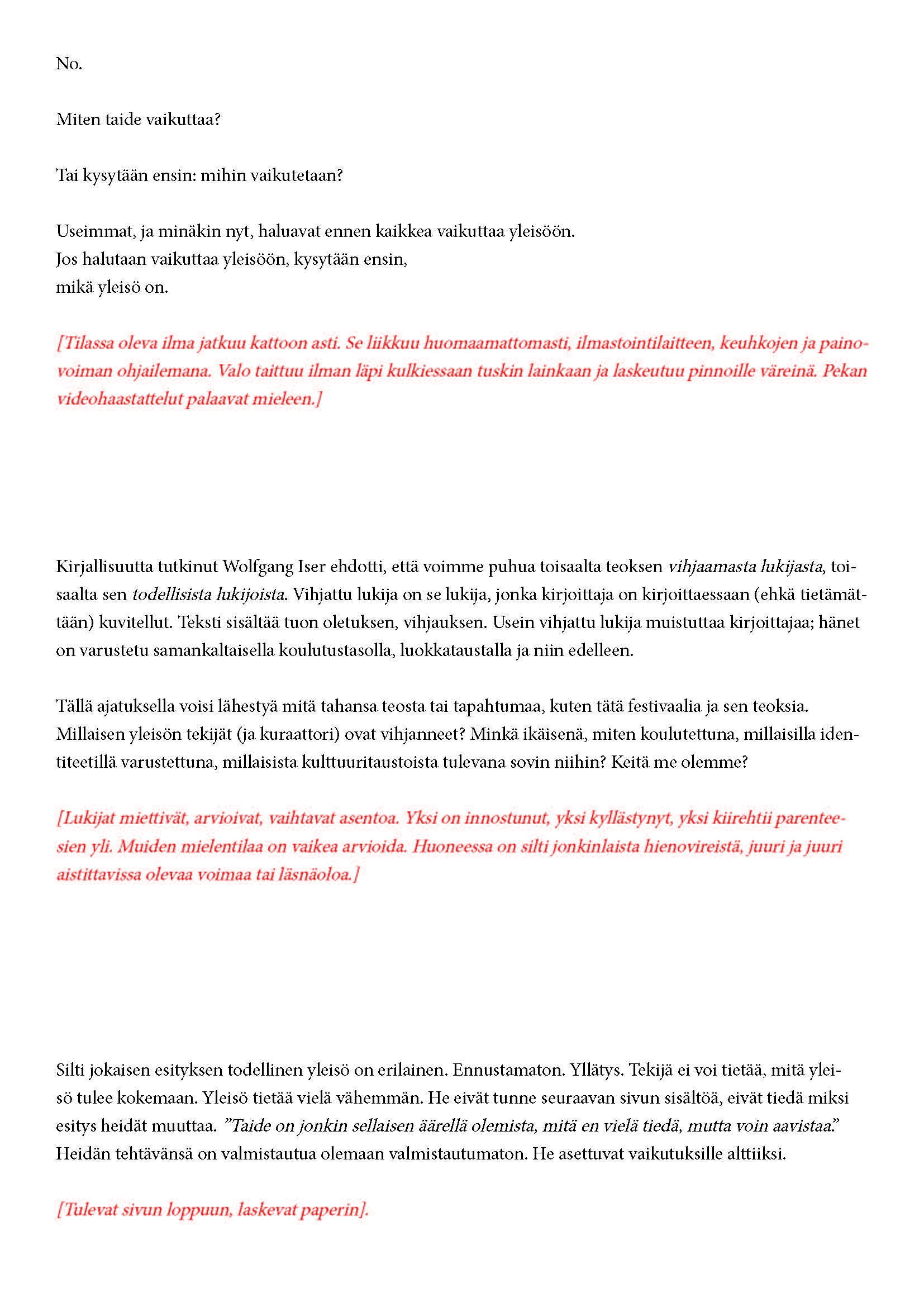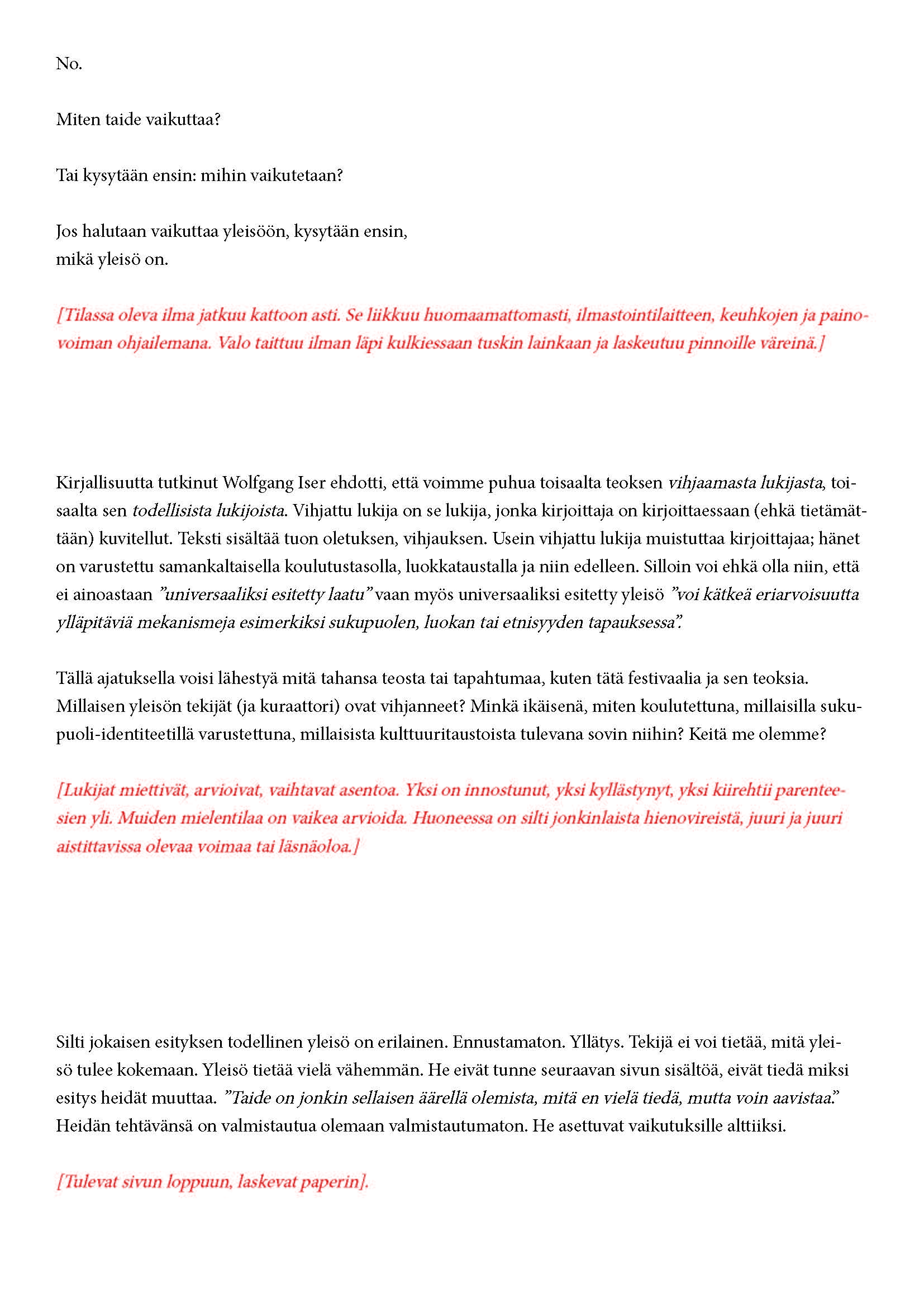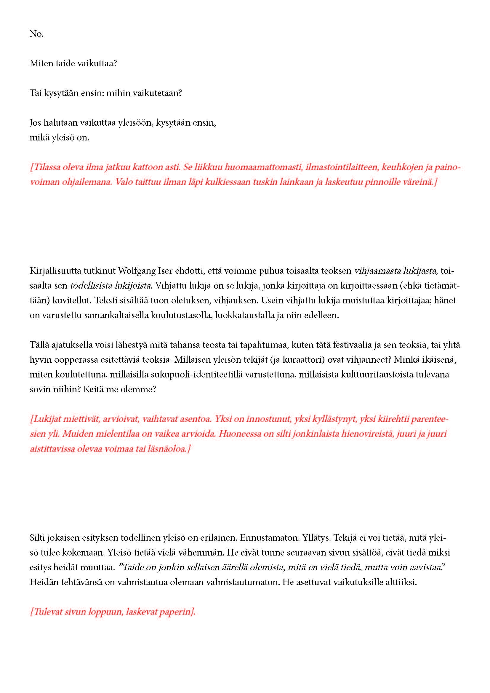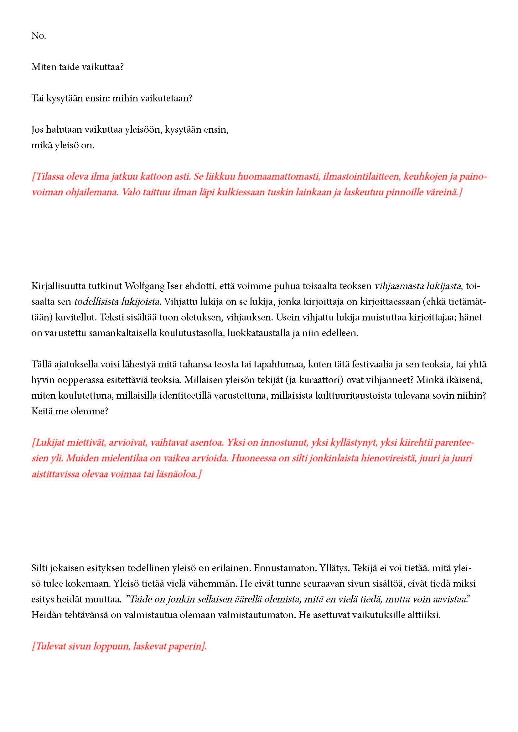 Mikä yleisö on? Miksi esityksessä on yleisö? Väitöstutkimuksessani käsittelen näitä kysymyksiä ja pyrin luonnostelemaan teoreettista esitystä yleisöstä. Hahmottaakseni asiaa olen toteuttanut sarjan esityksellisiä luonnoksia, joissa yleisö katsoo itseään ja esitystilannetta. Näissä luonnoksissa yleisö on paikalla, mutta esitys, näyttämötapahtumien merkityksessä, puuttuu. Näyttämötapahtumien sijaan olen kussakin luonnoksessa valmistanut yleisölle tekstin, joka toimii käsikirjoituksena tai lukuohjeena. Valitsin tapahtumallisen tekstin, jotta voisin käsitellä esitystä sen tavanomaisessa ympäristössä, elävänä tapahtumana, ja samalla rakentaa teoriaa sen tavanomaisessa ympäristössä, tekstinä. Olen kokeillut luonnosteksteille erilaisia muotoja: käsiohjelma, kirje, vihko. Vaihtelua on myös siinä, puhuttelenko yleisöä enemmän ryhmänä vai yksilöinä sekä anonyymeinä vai tiettyinä henkilöinä. Toisissa luonnoksissa kaikilla on sama teksti, toisissa tekstejä on useita, joissain jokaisella on oma henkilökohtainen tekstinsä. Luonnokset ovat aina tilannesidonnaisia.
