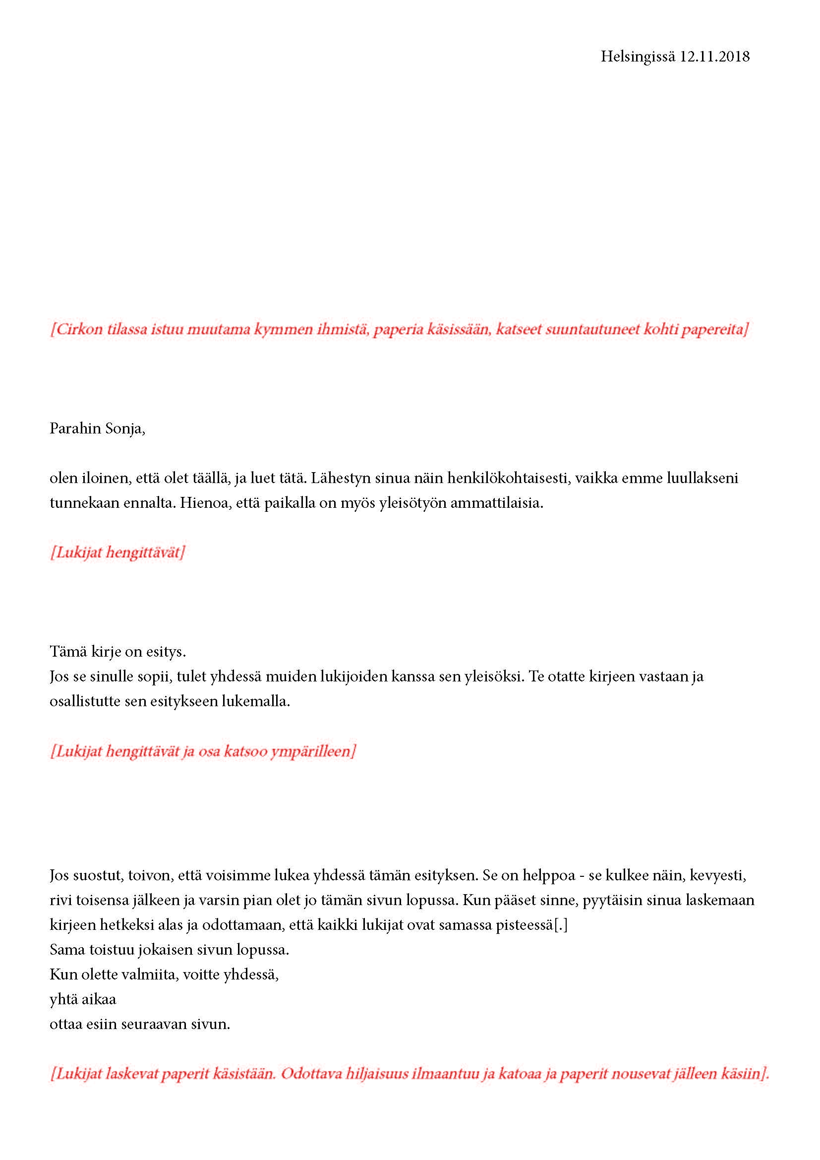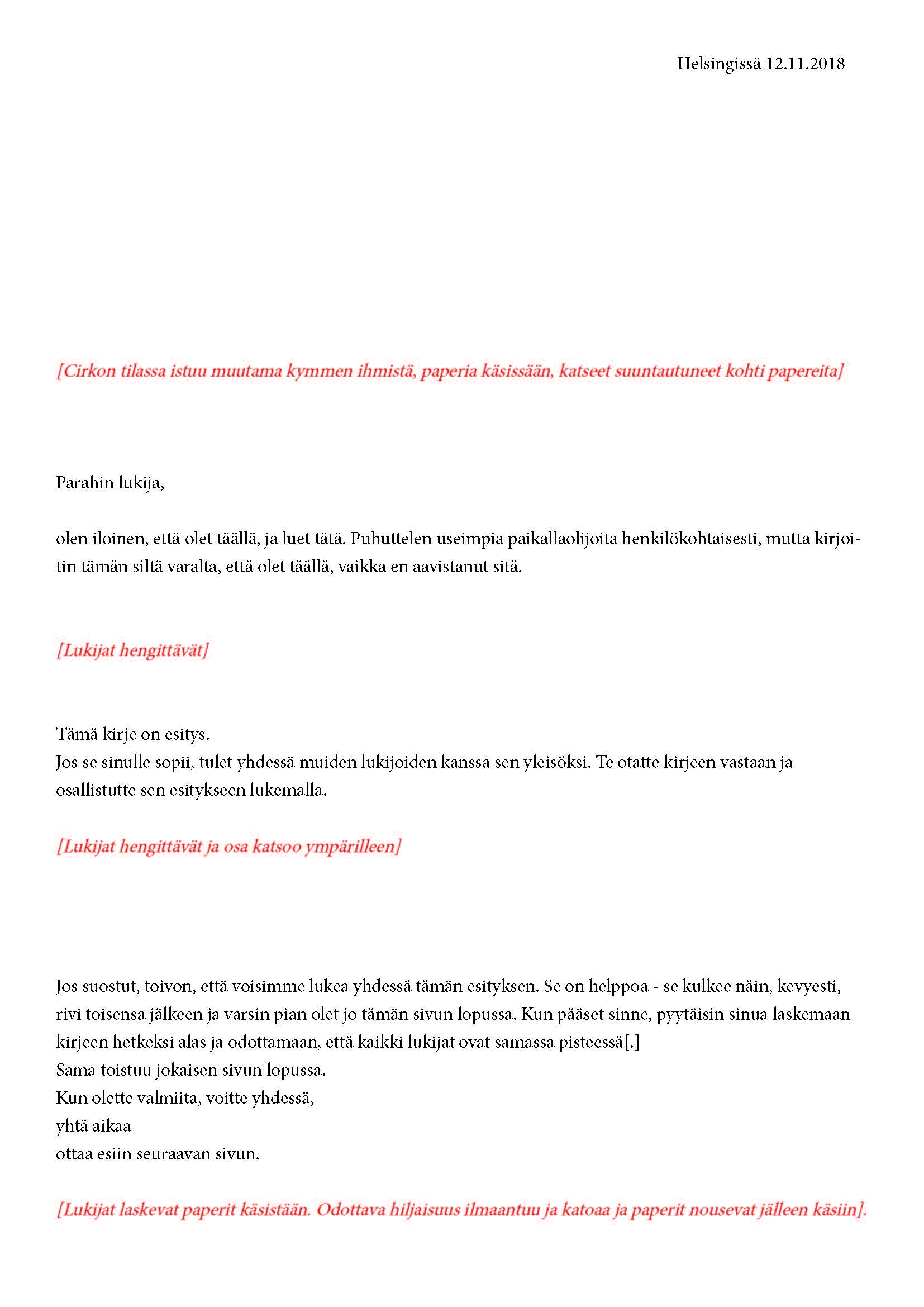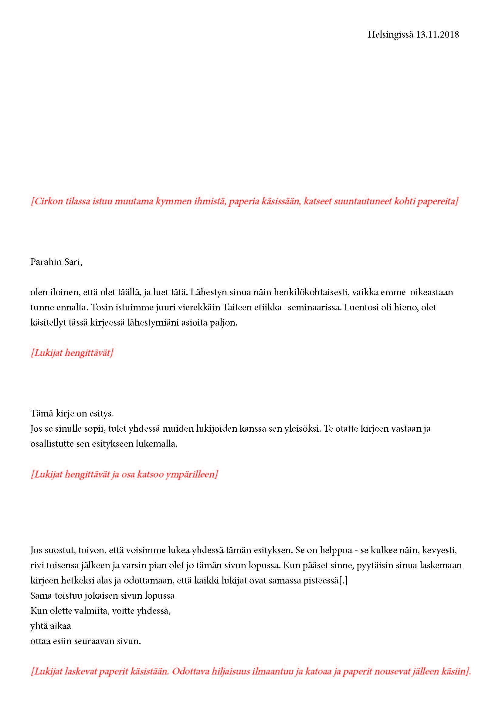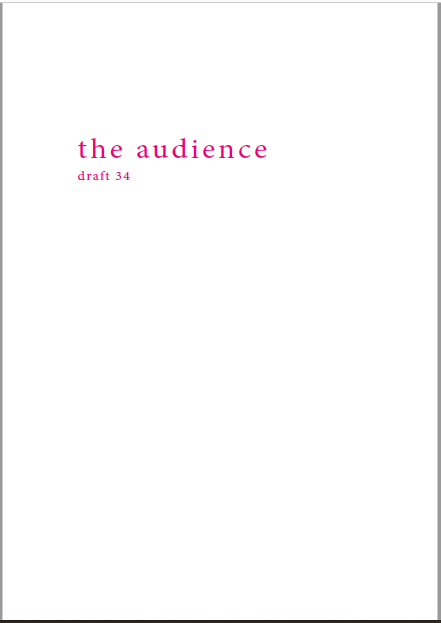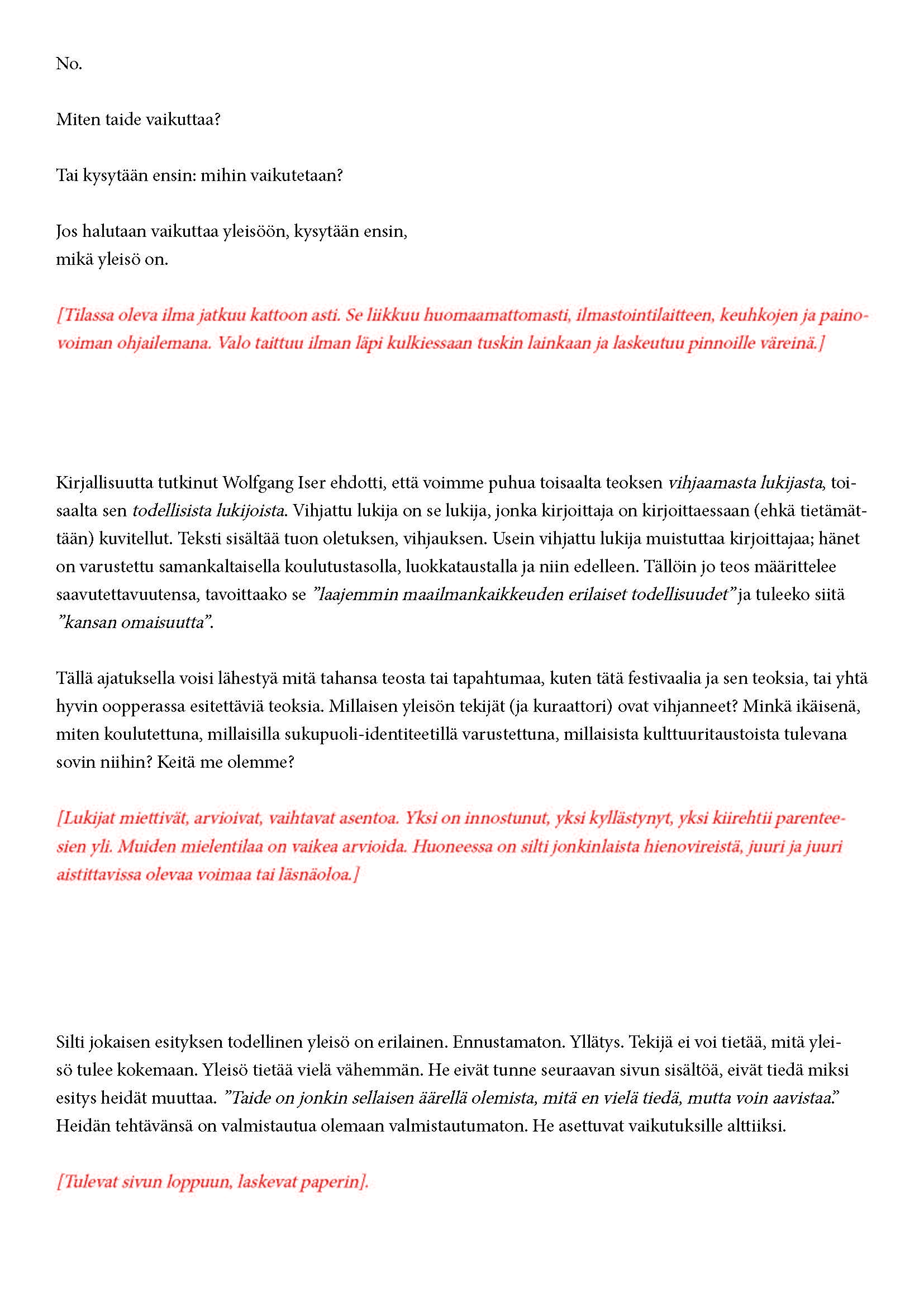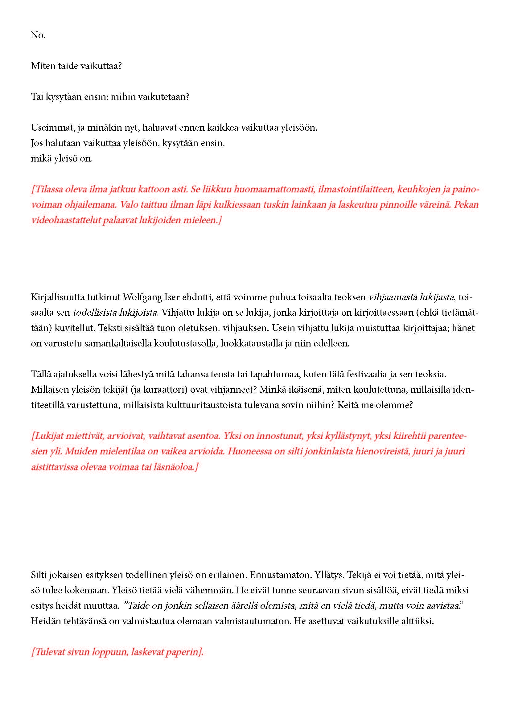 Mikä yleisö on? Miksi esityksessä on yleisö? Väitöstutkimuksessani käsittelen näitä kysymyksiä ja pyrin luonnostelemaan teoreettista esitystä yleisöstä. Hahmottaakseni asiaa olen toteuttanut sarjan esityksellisiä luonnoksia, joissa yleisö katsoo itseään ja esitystilannetta. Näissä luonnoksissa yleisö on paikalla, mutta esitys, näyttämötapahtumien merkityksessä, puuttuu. Näyttämötapahtumien sijaan olen kussakin luonnoksessa valmistanut yleisölle tekstin, joka toimii käsikirjoituksena tai lukuohjeena. Valitsin tapahtumallisen tekstin, jotta voisin käsitellä esitystä sen tavanomaisessa ympäristössä, elävänä tapahtumana, ja samalla rakentaa teoriaa sen tavanomaisessa ympäristössä, tekstinä. Olen kokeillut luonnosteksteille erilaisia muotoja: käsiohjelma, kirje, vihko. Vaihtelua on myös siinä, puhuttelenko yleisöä enemmän ryhmänä vai yksilöinä sekä anonyymeinä vai tiettyinä henkilöinä. Toisissa luonnoksissa kaikilla on sama teksti, toisissa tekstejä on useita, joissain jokaisella on oma henkilökohtainen tekstinsä. Luonnokset ovat aina tilannesidonnaisia.
