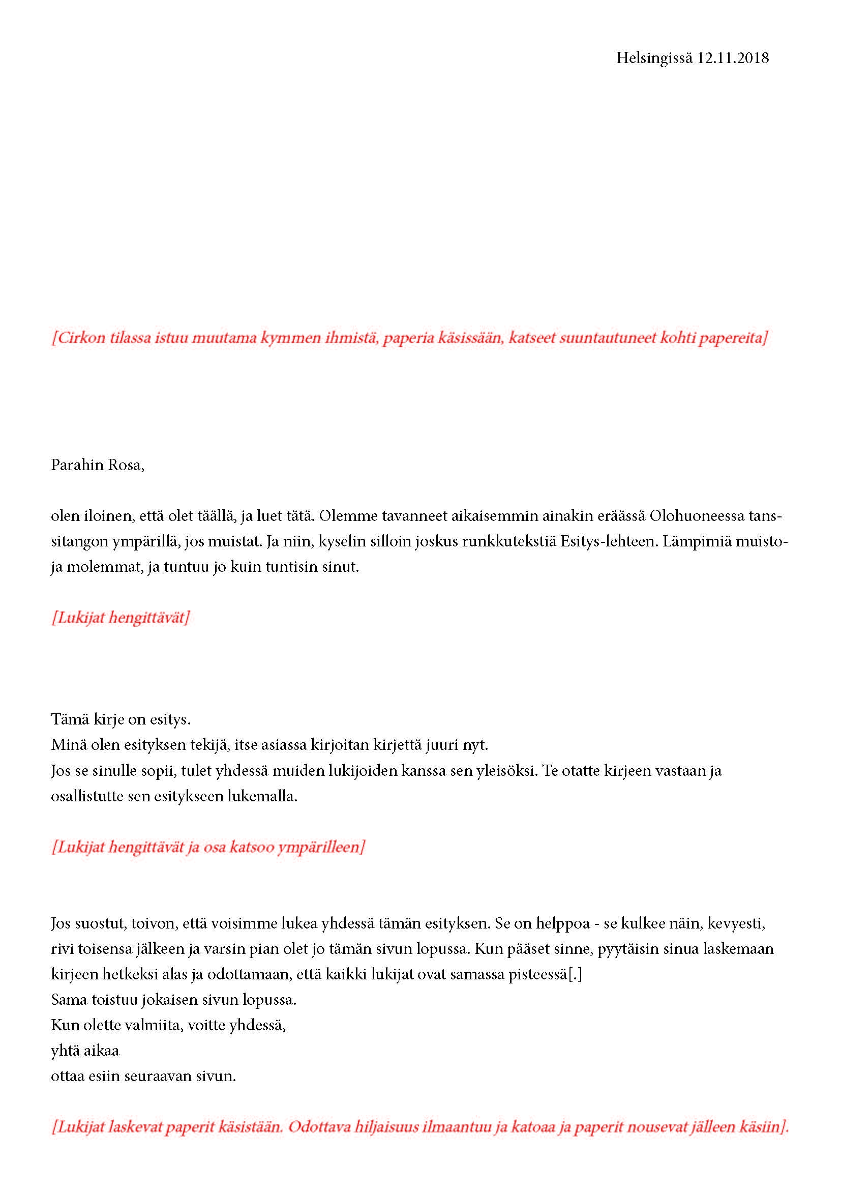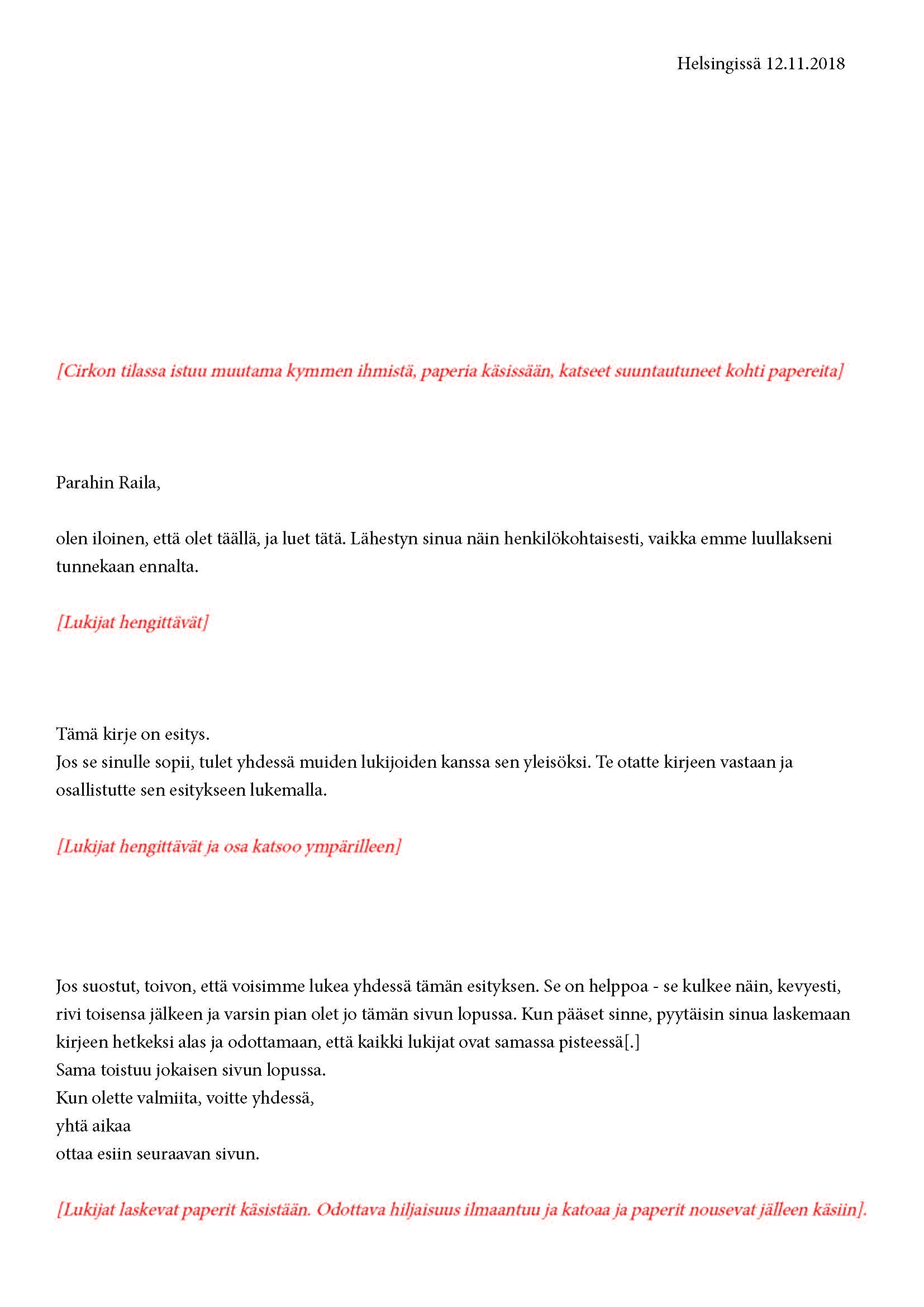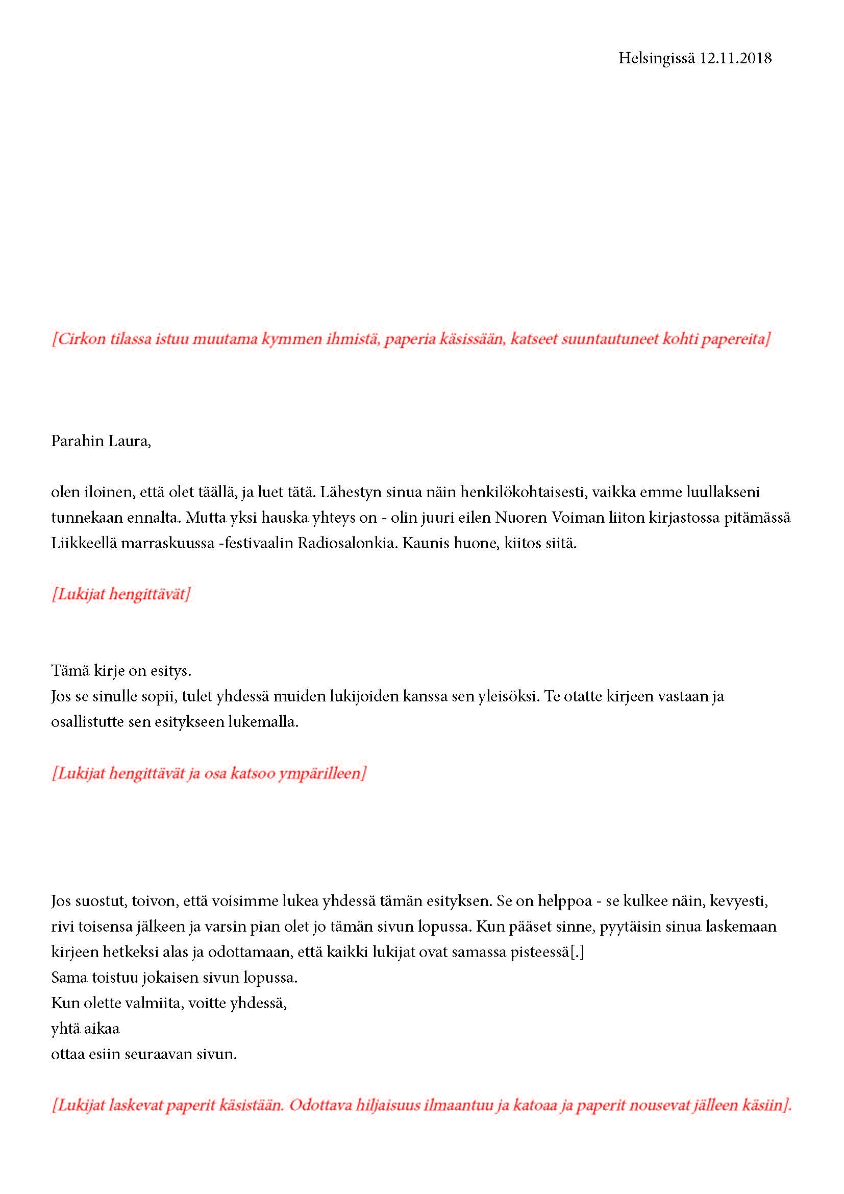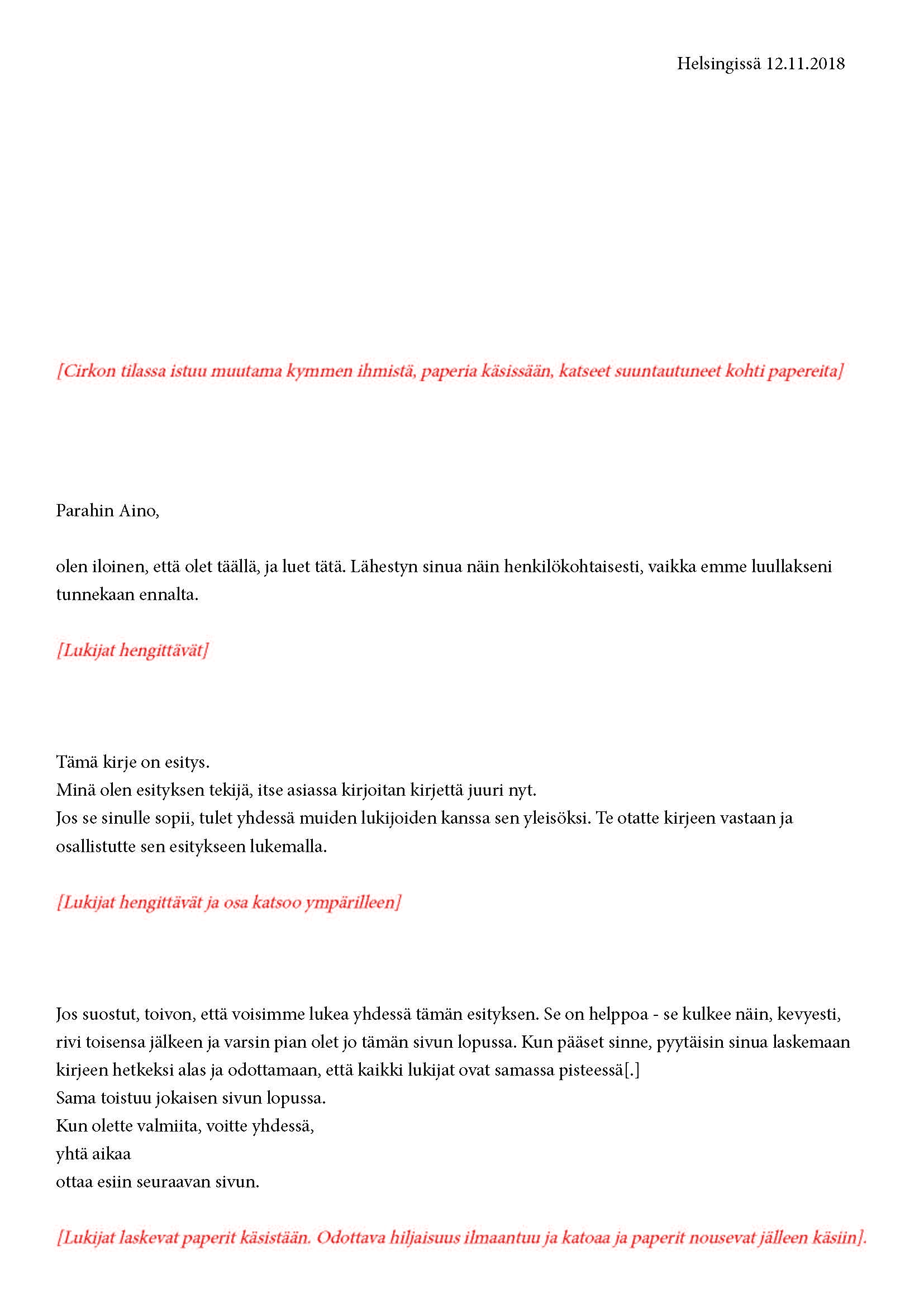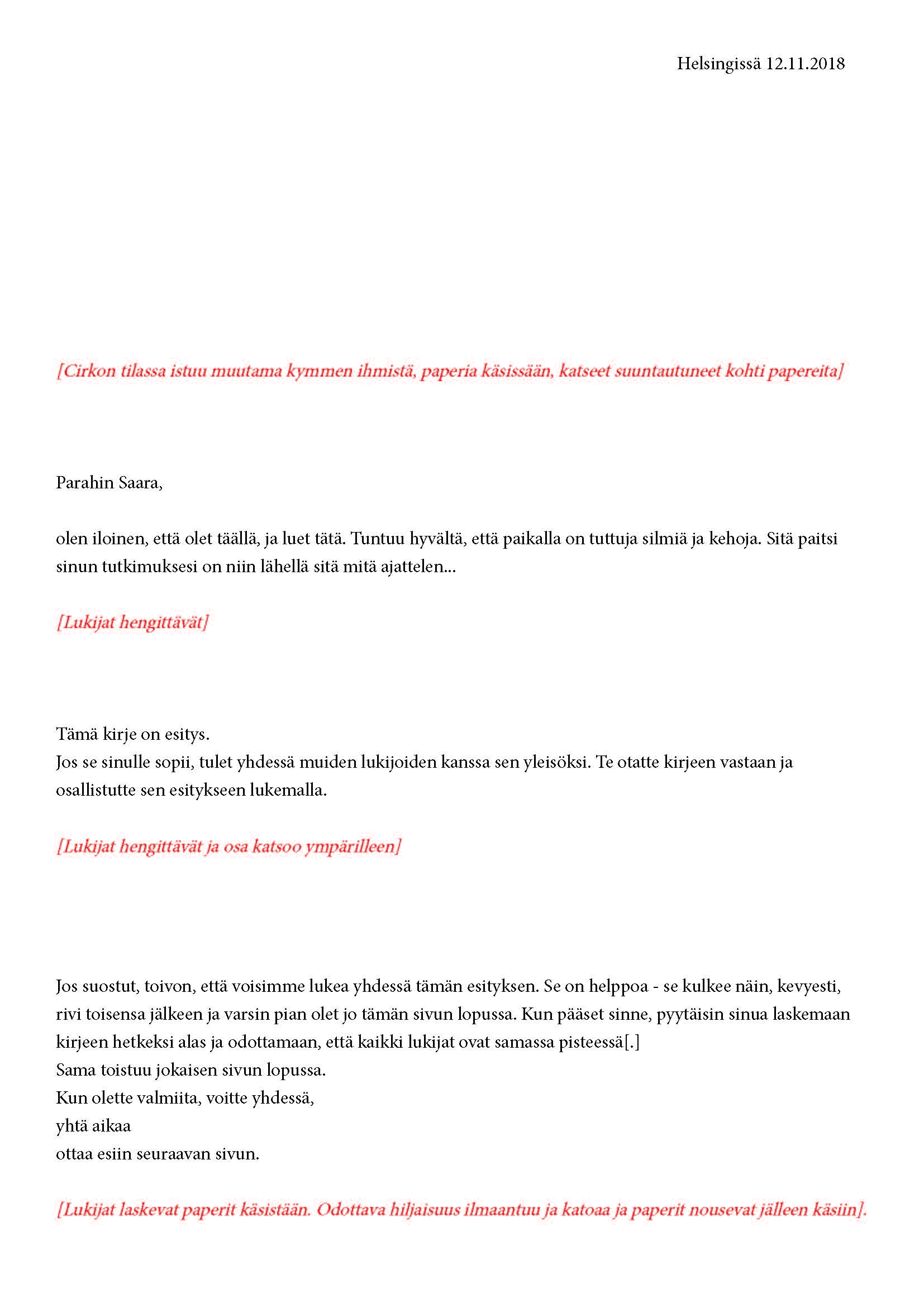 Mikä yleisö on? Miksi esityksessä on yleisö? Väitöstutkimuksessani käsittelen näitä kysymyksiä ja pyrin luonnostelemaan teoreettista esitystä yleisöstä. Hahmottaakseni asiaa olen toteuttanut sarjan esityksellisiä luonnoksia, joissa yleisö katsoo itseään ja esitystilannetta. Näissä luonnoksissa yleisö on paikalla, mutta esitys, näyttämötapahtumien merkityksessä, puuttuu. Näyttämötapahtumien sijaan olen kussakin luonnoksessa valmistanut yleisölle tekstin, joka toimii käsikirjoituksena tai lukuohjeena. Valitsin tapahtumallisen tekstin, jotta voisin käsitellä esitystä sen tavanomaisessa ympäristössä, elävänä tapahtumana, ja samalla rakentaa teoriaa sen tavanomaisessa ympäristössä, tekstinä. Olen kokeillut luonnosteksteille erilaisia muotoja: käsiohjelma, kirje, vihko. Vaihtelua on myös siinä, puhuttelenko yleisöä enemmän ryhmänä vai yksilöinä sekä anonyymeinä vai tiettyinä henkilöinä. Toisissa luonnoksissa kaikilla on sama teksti, toisissa tekstejä on useita, joissain jokaisella on oma henkilökohtainen tekstinsä. Luonnokset ovat aina tilannesidonnaisia.