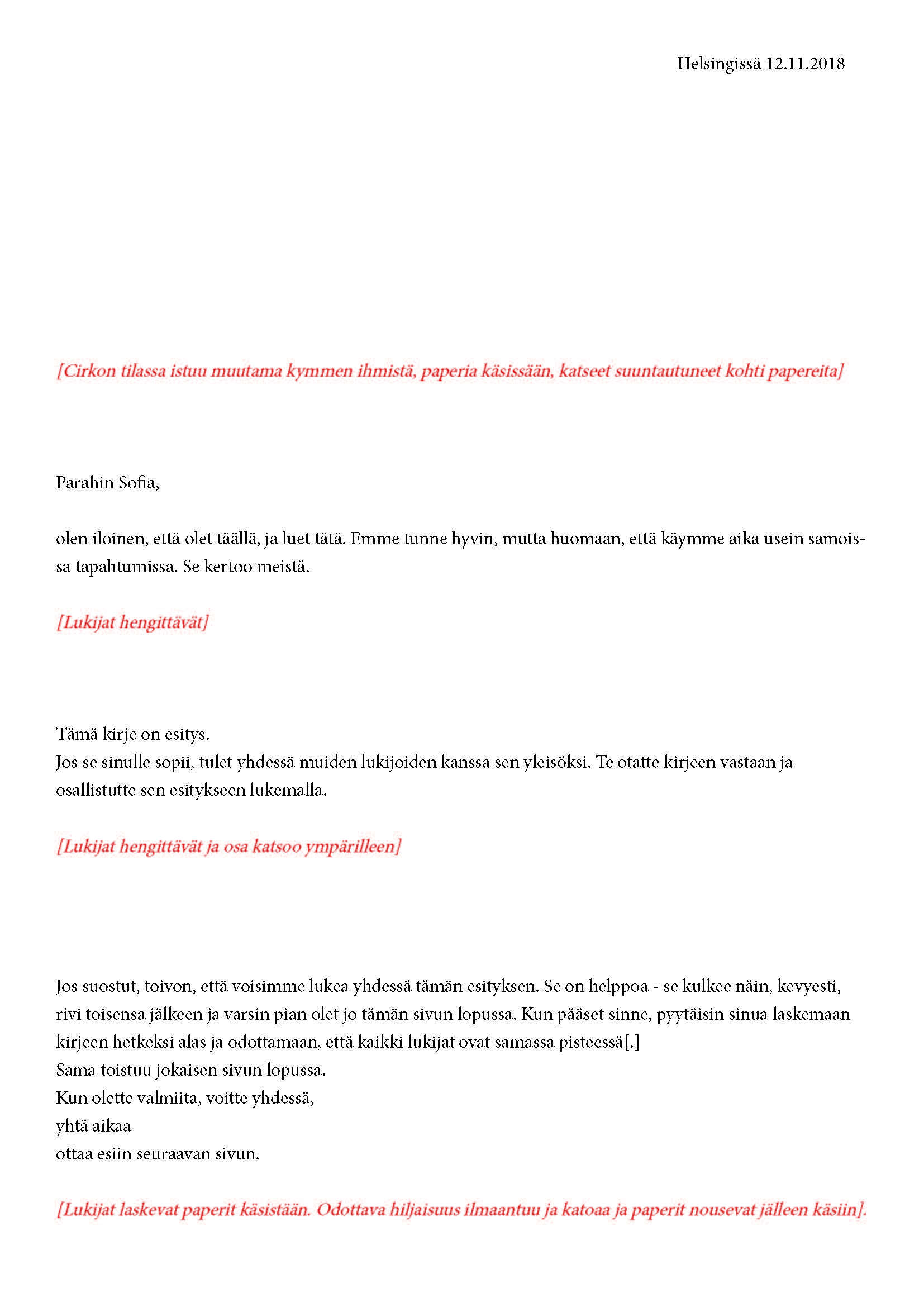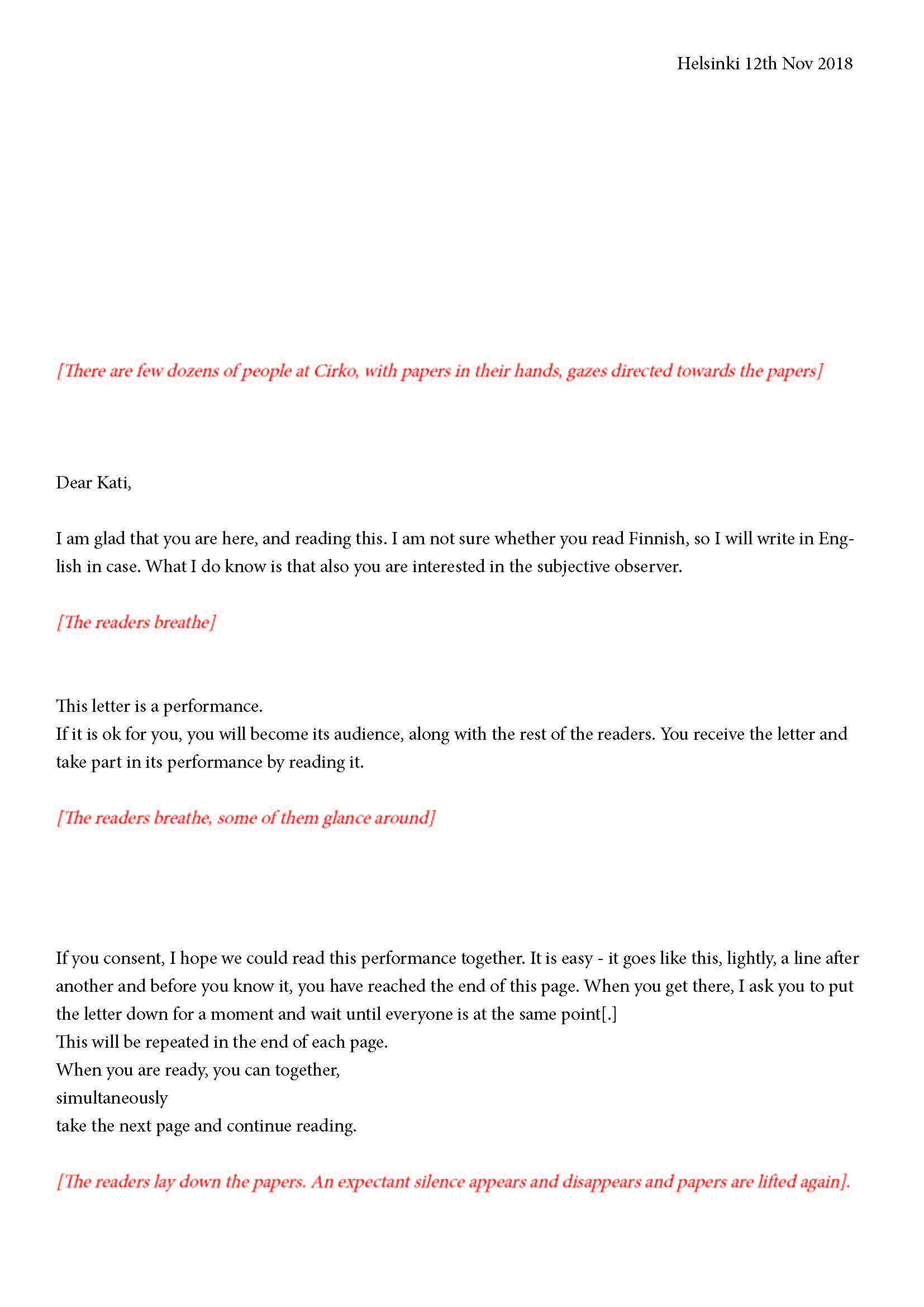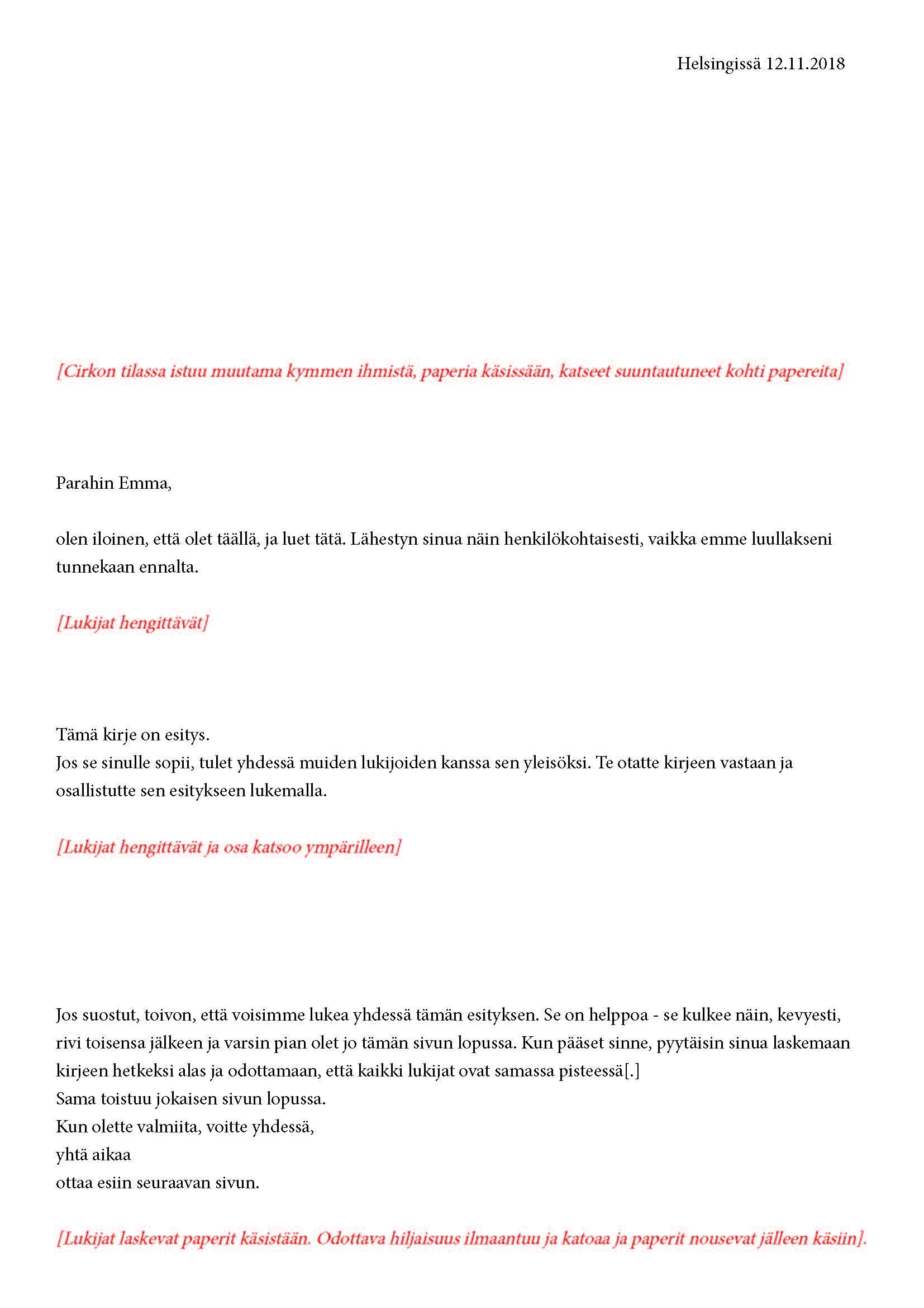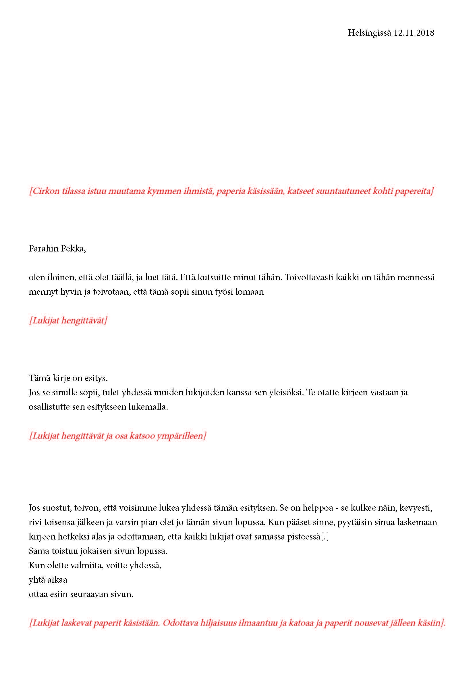 Mikä yleisö on? Miksi esityksessä on yleisö? Väitöstutkimuksessani käsittelen näitä kysymyksiä ja pyrin luonnostelemaan teoreettista esitystä yleisöstä. Hahmottaakseni asiaa olen toteuttanut sarjan esityksellisiä luonnoksia, joissa yleisö katsoo itseään ja esitystilannetta. Näissä luonnoksissa yleisö on paikalla, mutta esitys, näyttämötapahtumien merkityksessä, puuttuu. Näyttämötapahtumien sijaan olen kussakin luonnoksessa valmistanut yleisölle tekstin, joka toimii käsikirjoituksena tai lukuohjeena. Valitsin tapahtumallisen tekstin, jotta voisin käsitellä esitystä sen tavanomaisessa ympäristössä, elävänä tapahtumana, ja samalla rakentaa teoriaa sen tavanomaisessa ympäristössä, tekstinä. Olen kokeillut luonnosteksteille erilaisia muotoja: käsiohjelma, kirje, vihko. Vaihtelua on myös siinä, puhuttelenko yleisöä enemmän ryhmänä vai yksilöinä sekä anonyymeinä vai tiettyinä henkilöinä. Toisissa luonnoksissa kaikilla on sama teksti, toisissa tekstejä on useita, joissain jokaisella on oma henkilökohtainen tekstinsä. Luonnokset ovat aina tilannesidonnaisia.