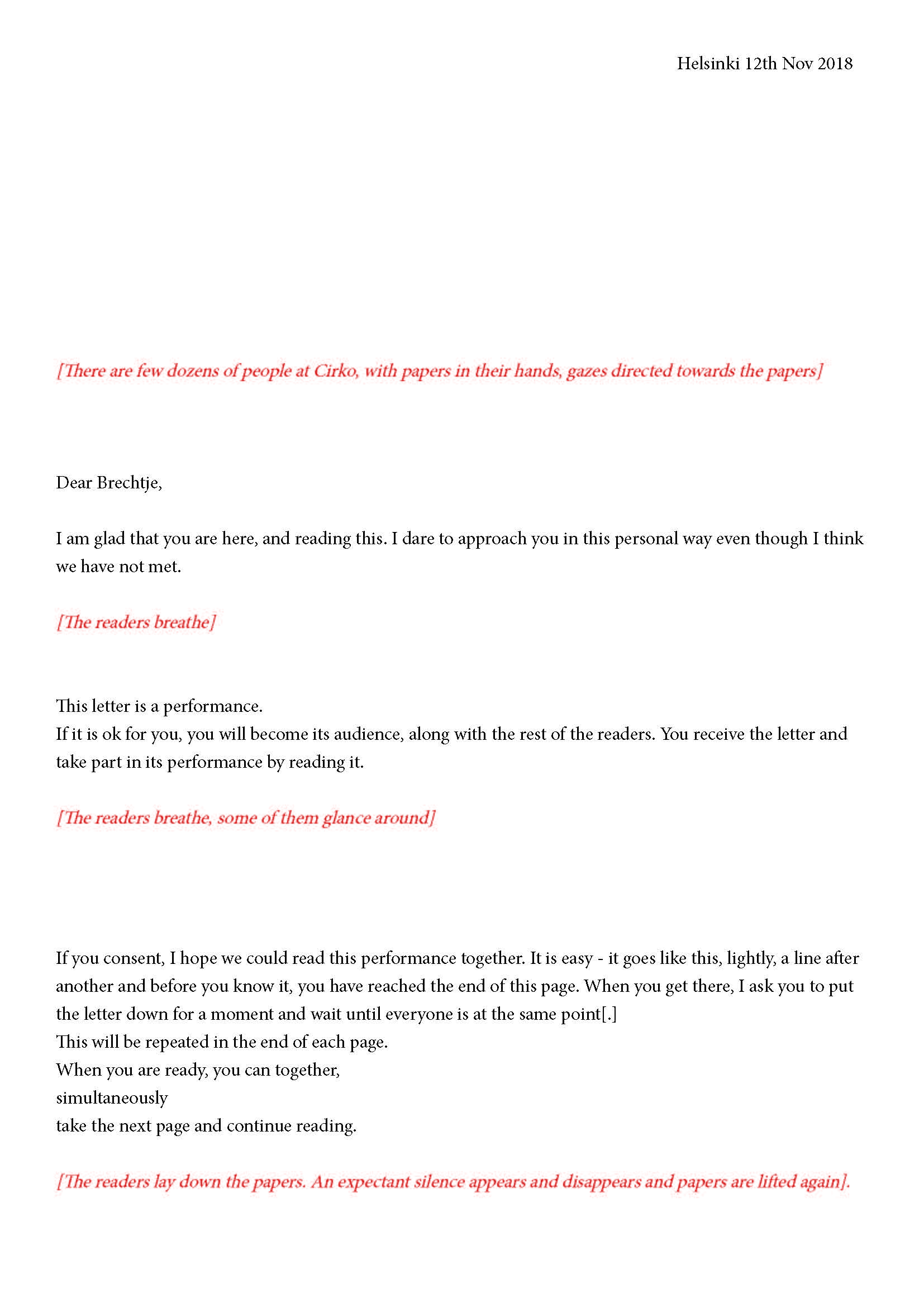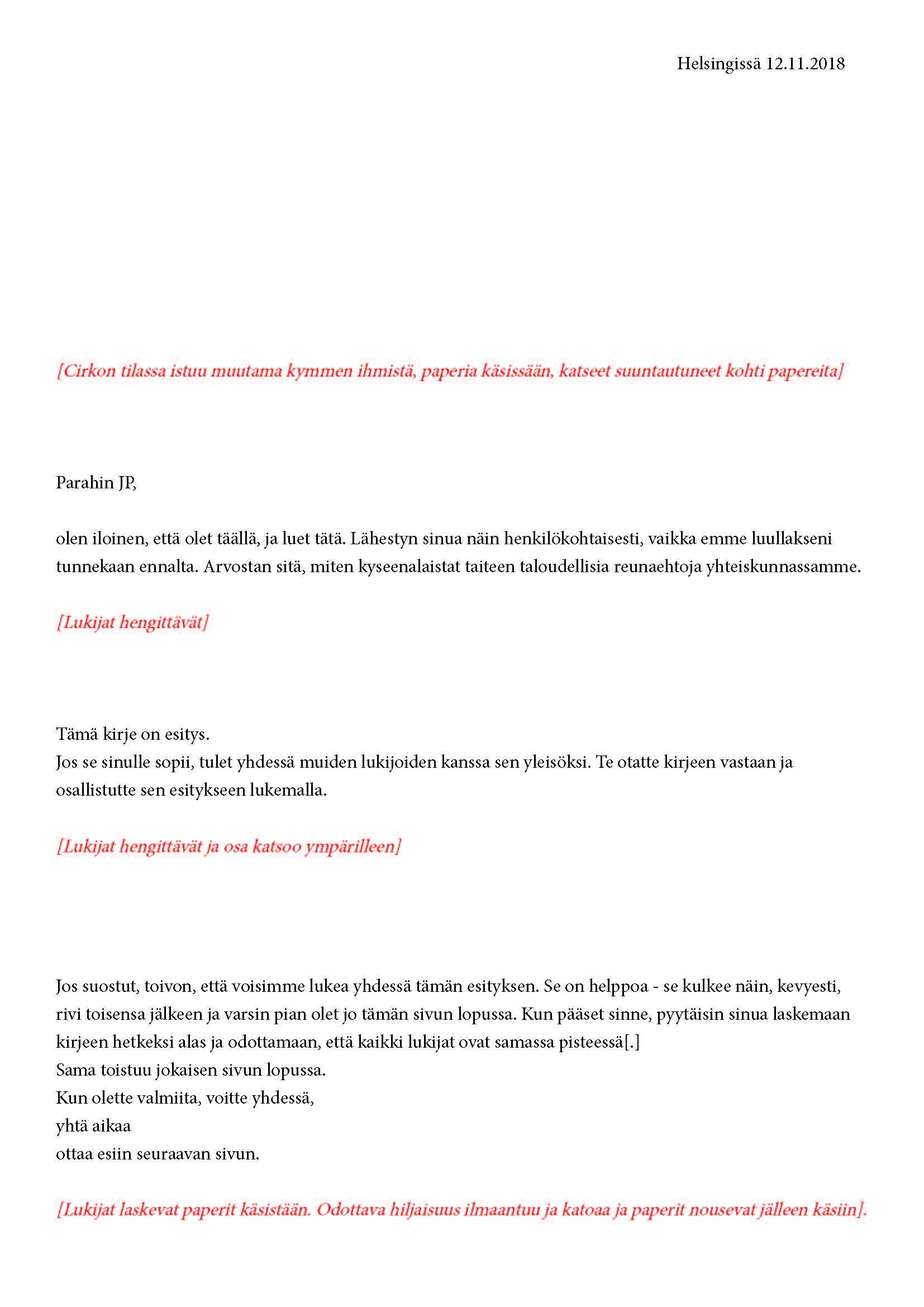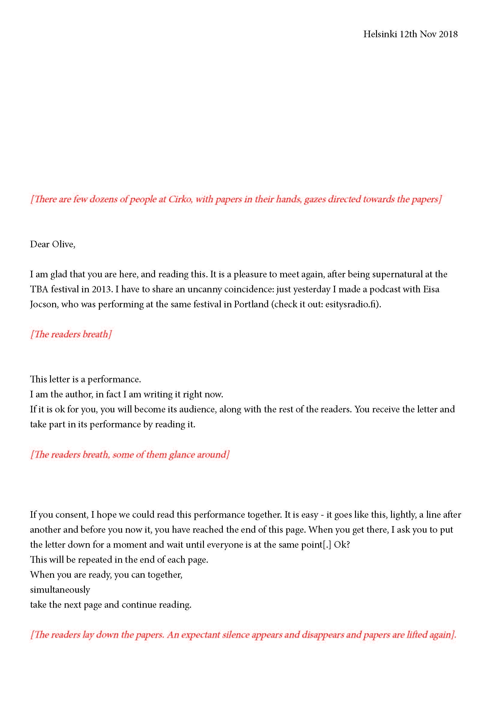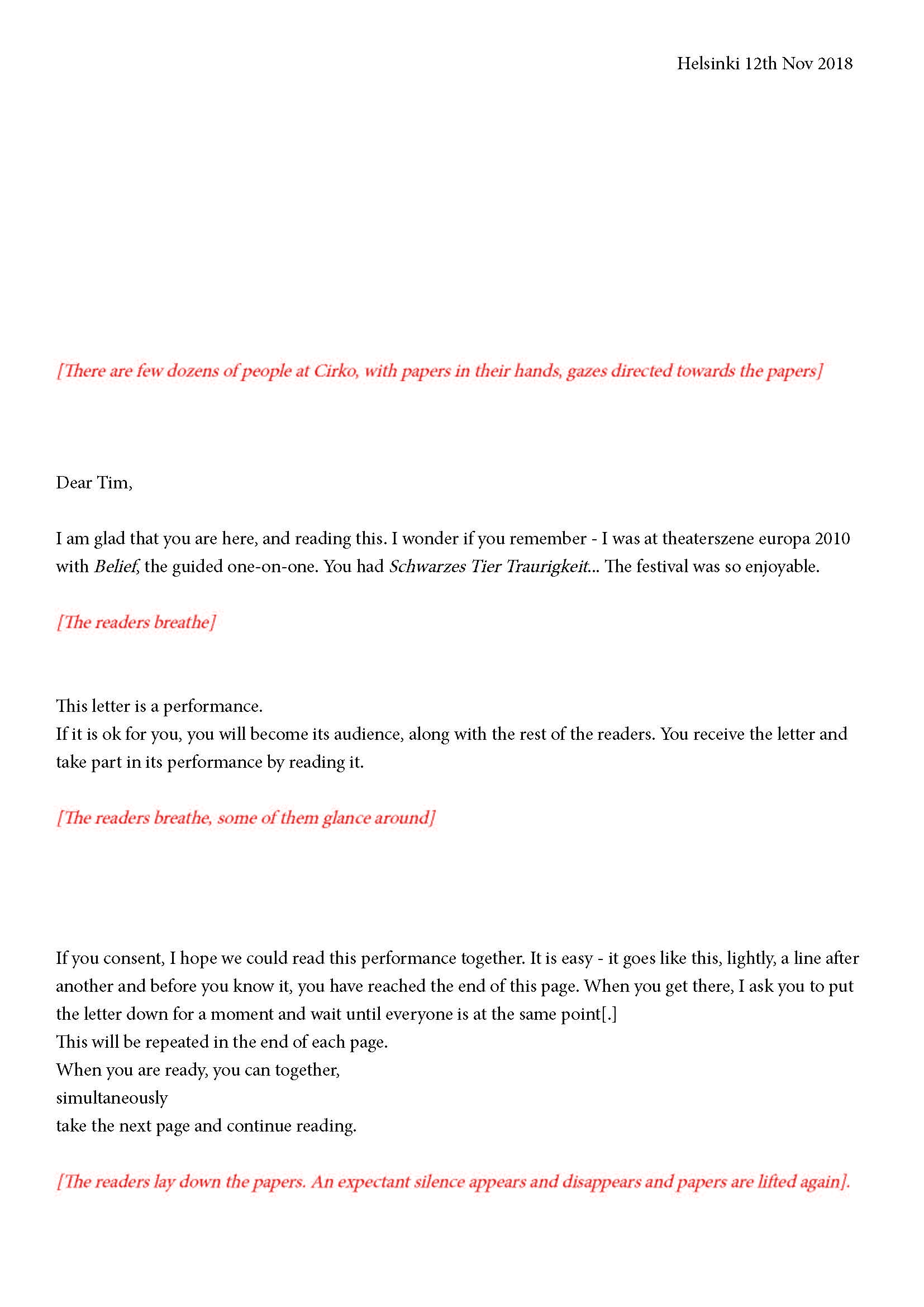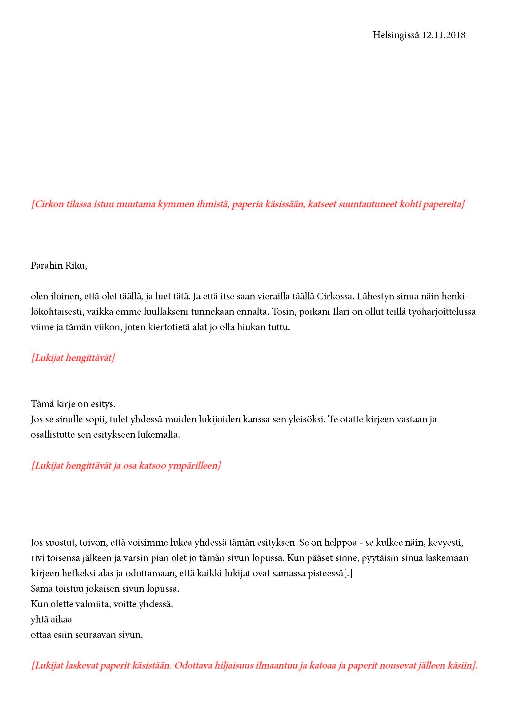 Mikä yleisö on? Miksi esityksessä on yleisö? Väitöstutkimuksessani käsittelen näitä kysymyksiä ja pyrin luonnostelemaan teoreettista esitystä yleisöstä. Hahmottaakseni asiaa olen toteuttanut sarjan esityksellisiä luonnoksia, joissa yleisö katsoo itseään ja esitystilannetta. Näissä luonnoksissa yleisö on paikalla, mutta esitys, näyttämötapahtumien merkityksessä, puuttuu. Näyttämötapahtumien sijaan olen kussakin luonnoksessa valmistanut yleisölle tekstin, joka toimii käsikirjoituksena tai lukuohjeena. Valitsin tapahtumallisen tekstin, jotta voisin käsitellä esitystä sen tavanomaisessa ympäristössä, elävänä tapahtumana, ja samalla rakentaa teoriaa sen tavanomaisessa ympäristössä, tekstinä. Olen kokeillut luonnosteksteille erilaisia muotoja: käsiohjelma, kirje, vihko. Vaihtelua on myös siinä, puhuttelenko yleisöä enemmän ryhmänä vai yksilöinä sekä anonyymeinä vai tiettyinä henkilöinä. Toisissa luonnoksissa kaikilla on sama teksti, toisissa tekstejä on useita, joissain jokaisella on oma henkilökohtainen tekstinsä. Luonnokset ovat aina tilannesidonnaisia.