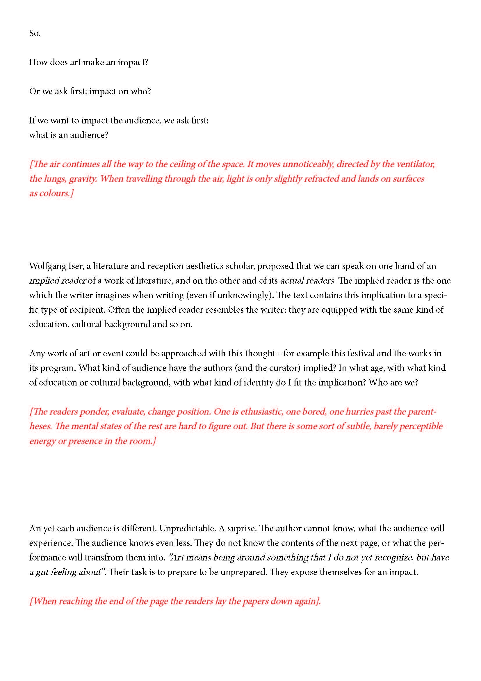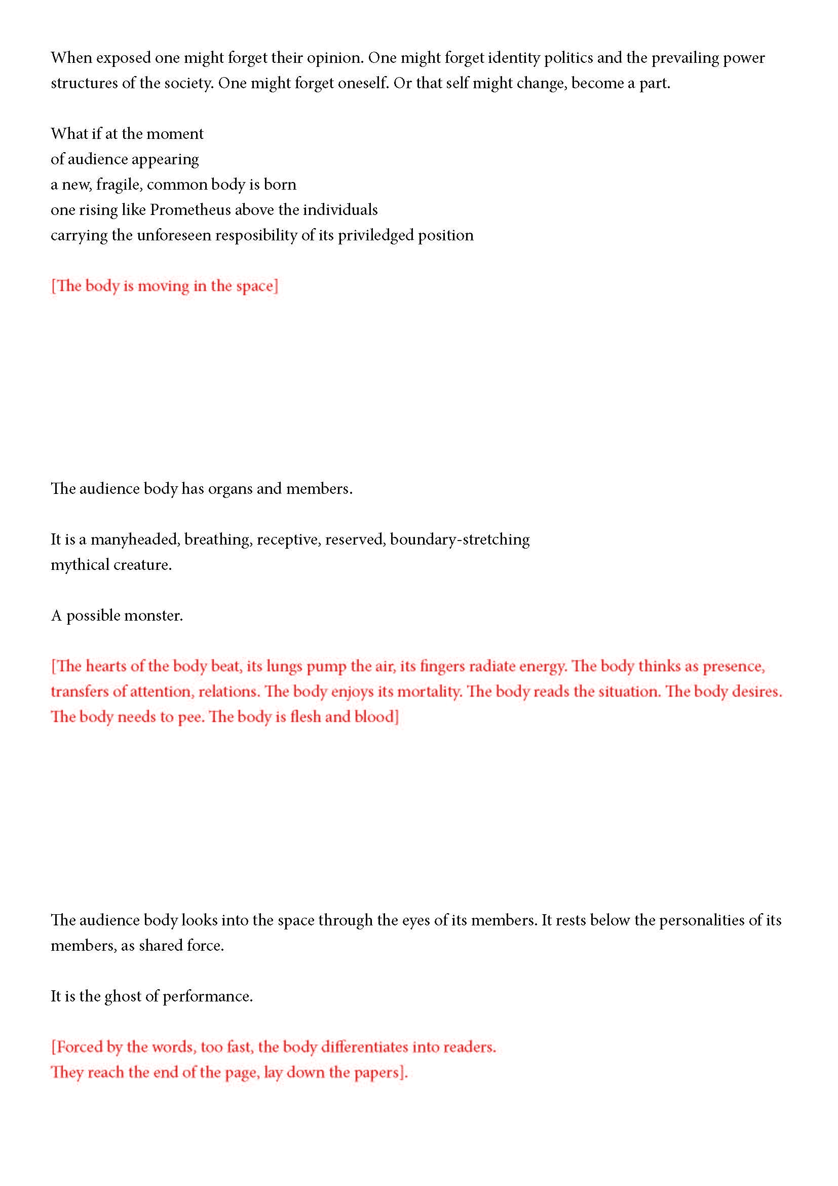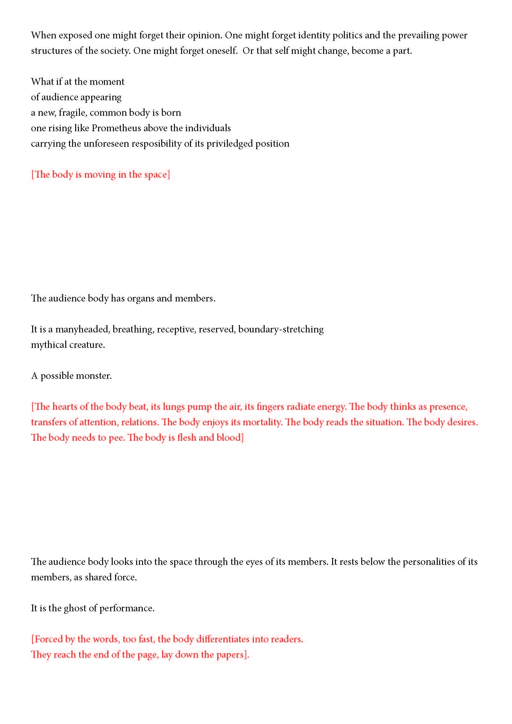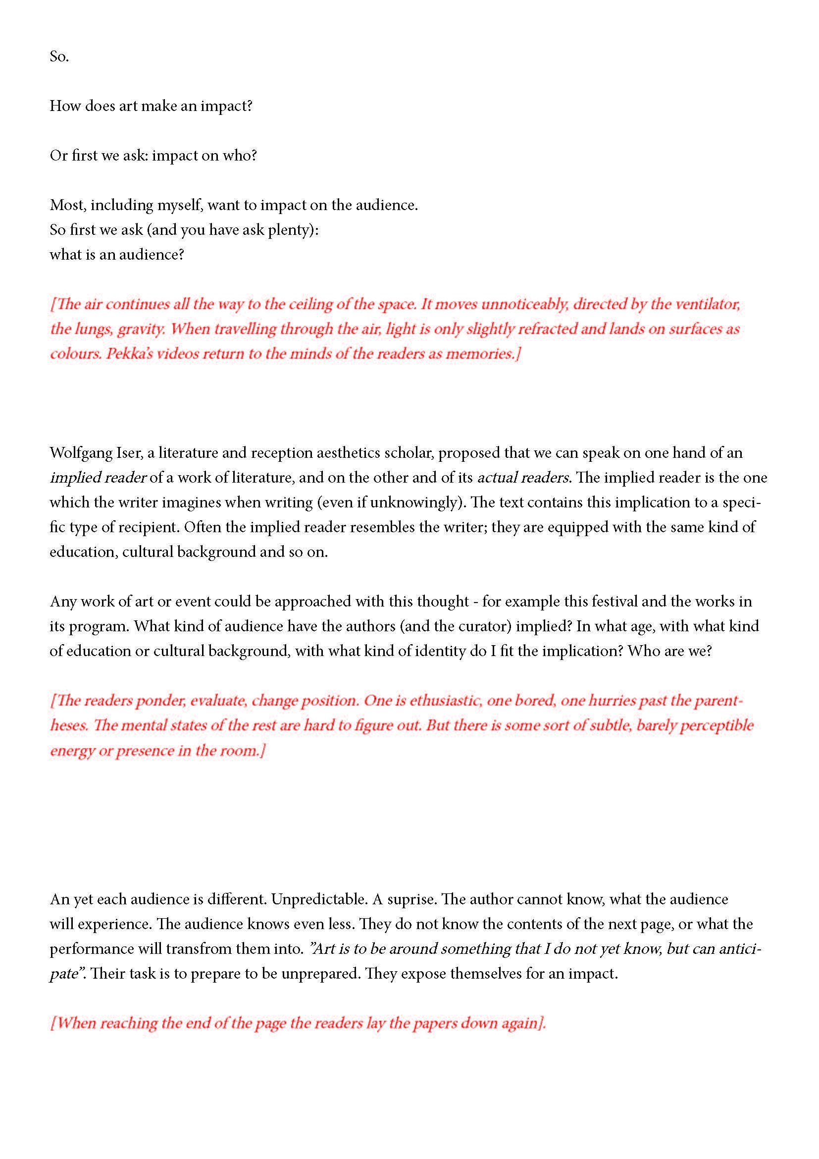 Ehdotan silti jotain. Olen kiinnostunut yleisön synnystä tai luomisesta -- jonkinlaisena yhteisyytenä. Toivon, että voit auttaa minua siinä hieman. Jo lukiessasi tätä luot yhdessä muiden kanssa monikollista olemusta. Suostuessaan se olemus ottaa yleisön muodon.