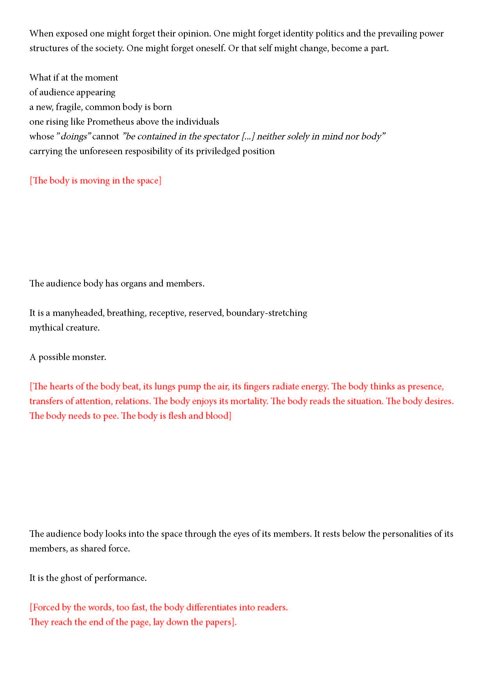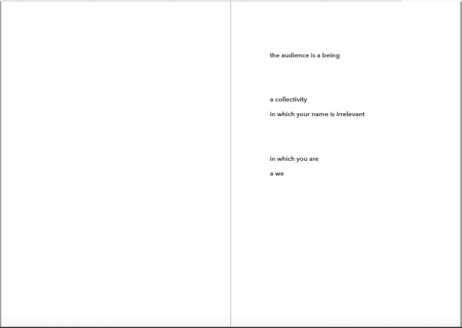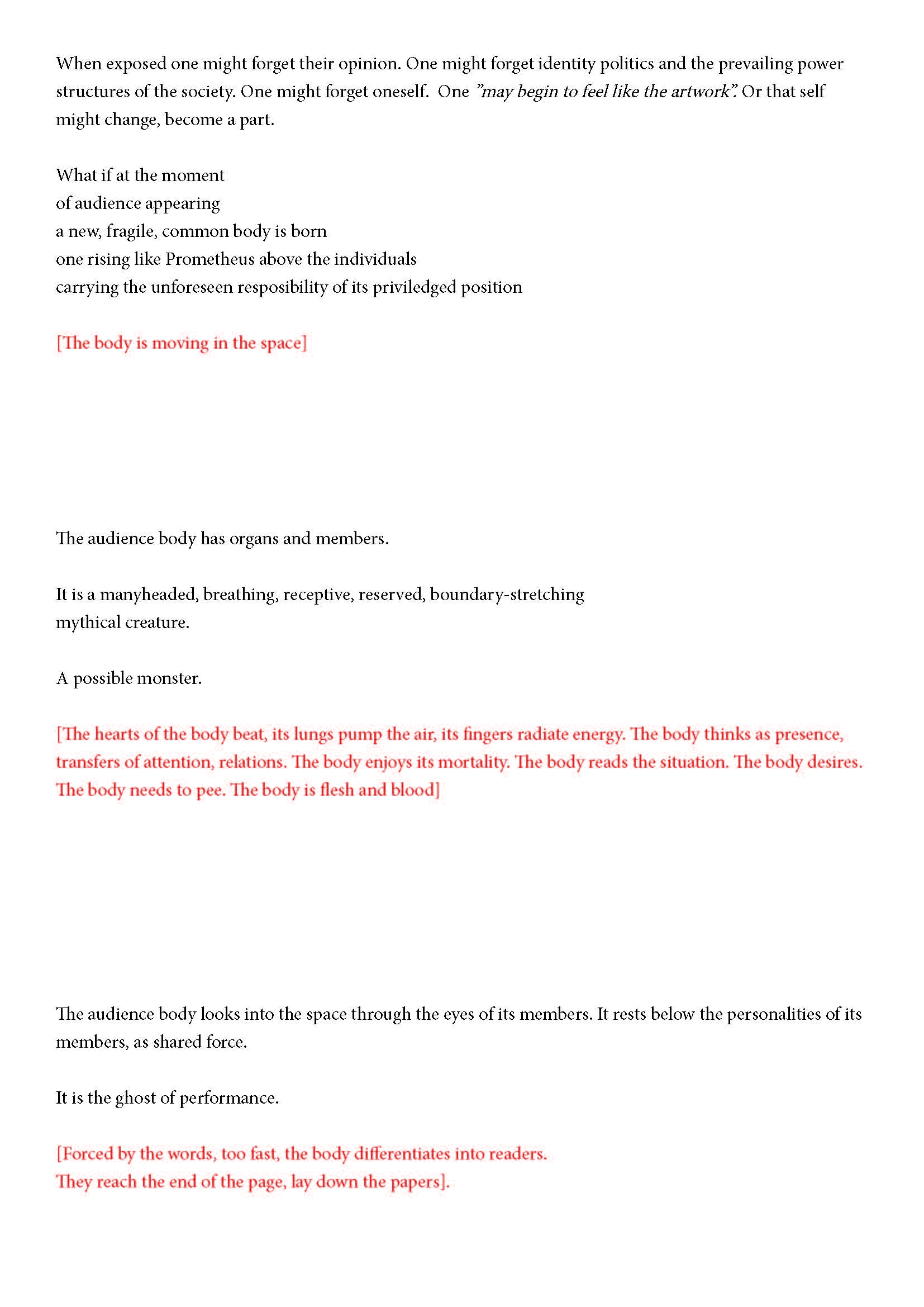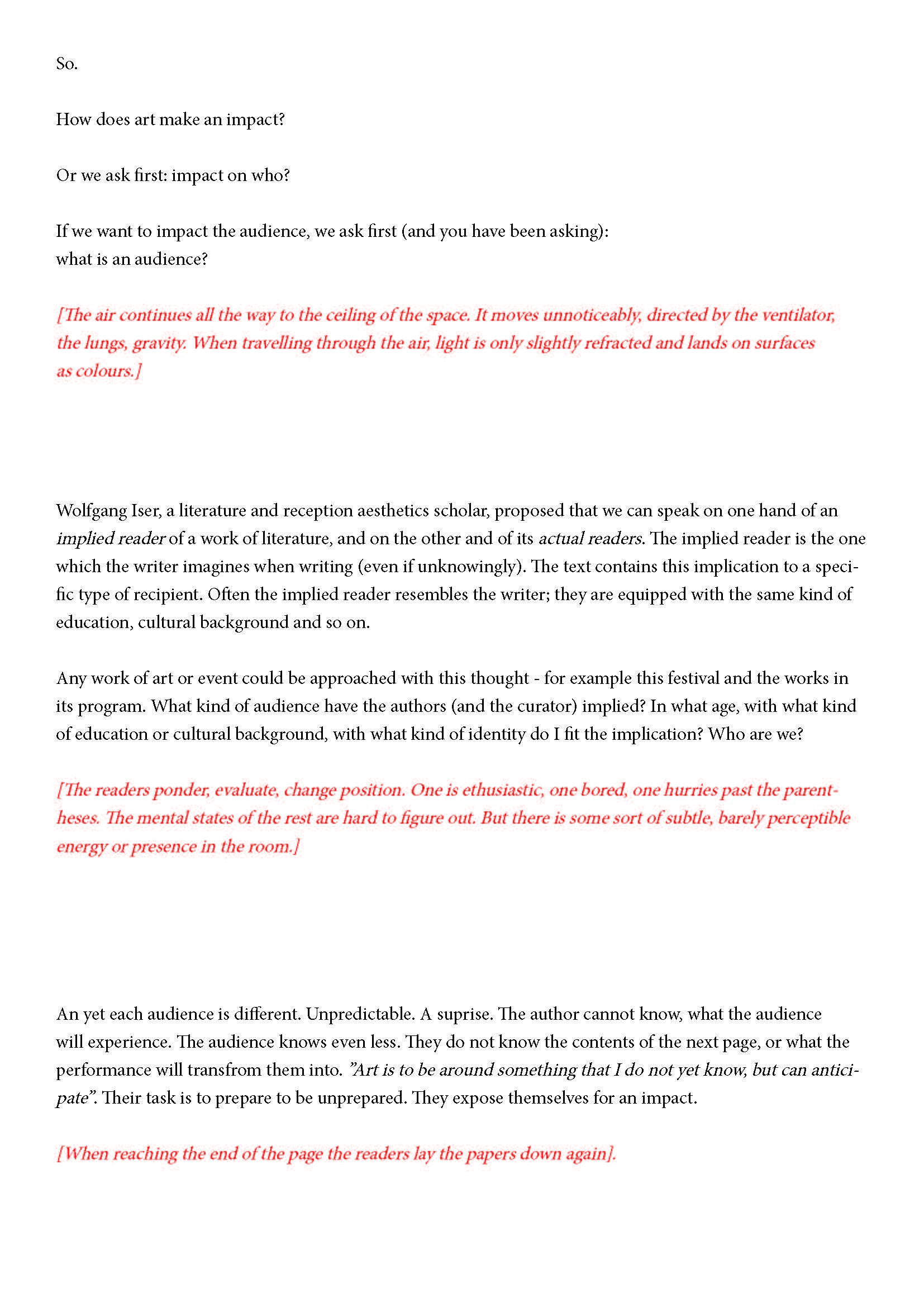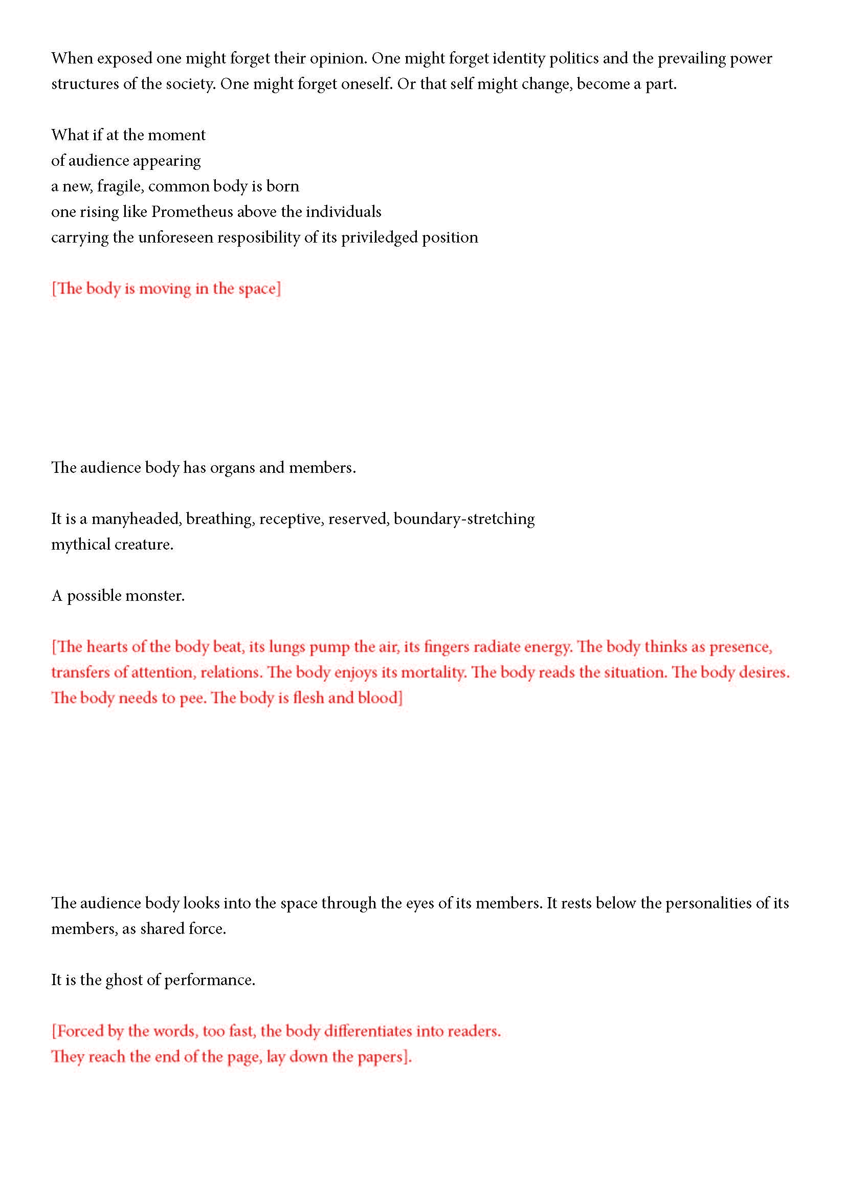 Ehdotan silti jotain. Olen kiinnostunut yleisön synnystä tai luomisesta -- jonkinlaisena yhteisyytenä. Toivon, että voit auttaa minua siinä hieman. Jo lukiessasi tätä luot yhdessä muiden kanssa monikollista olemusta. Suostuessaan se olemus ottaa yleisön muodon.