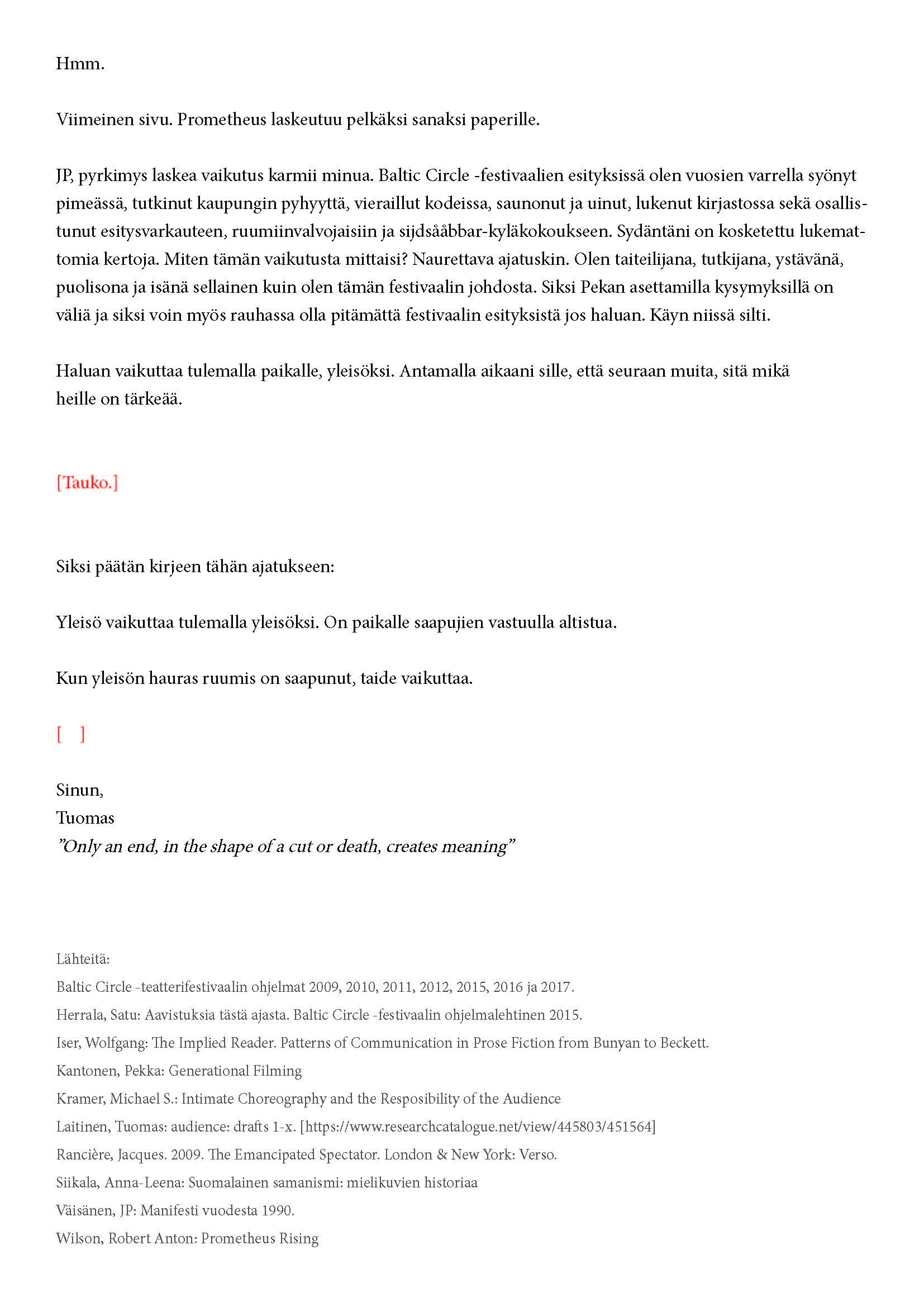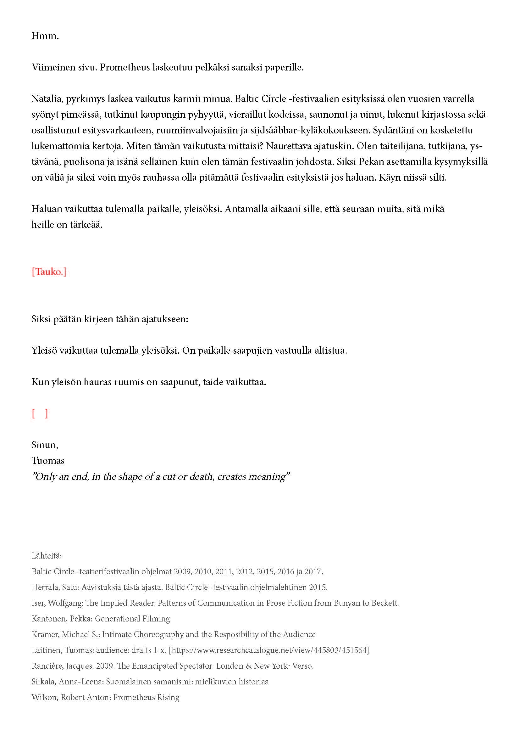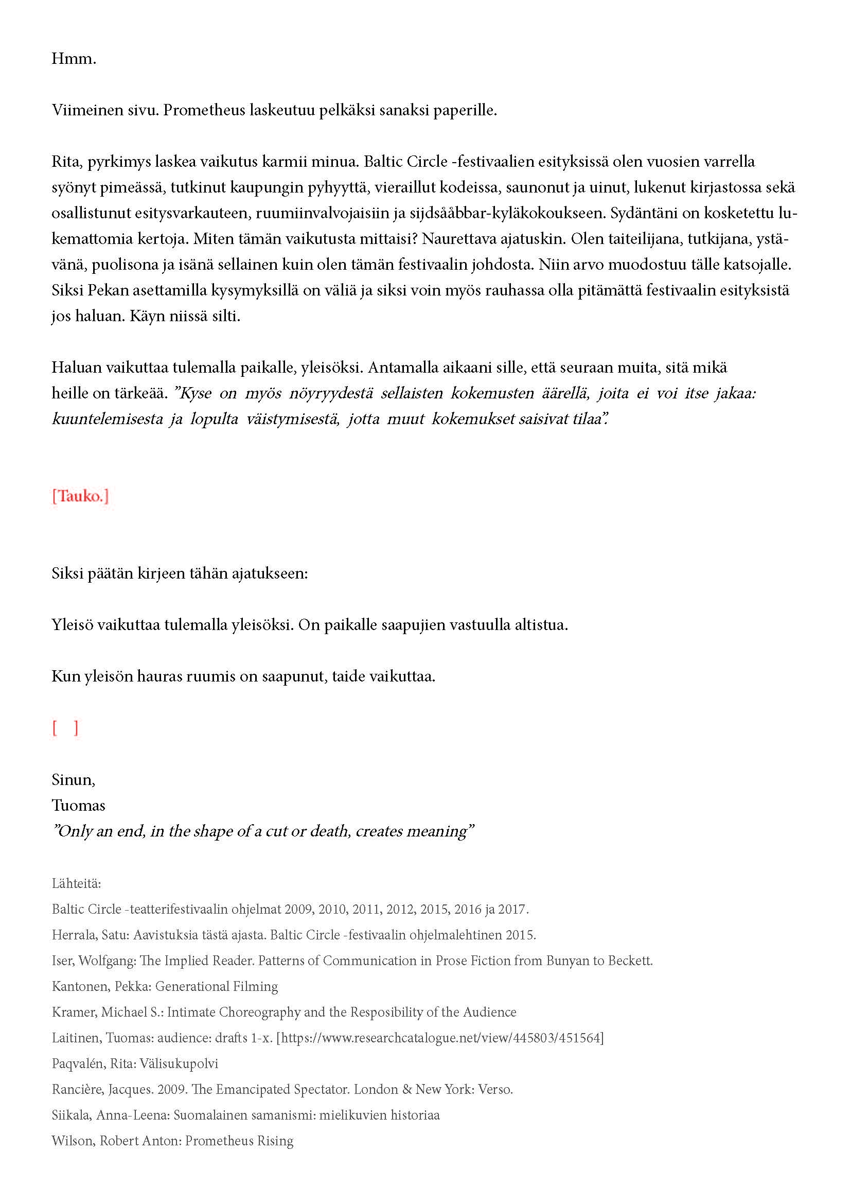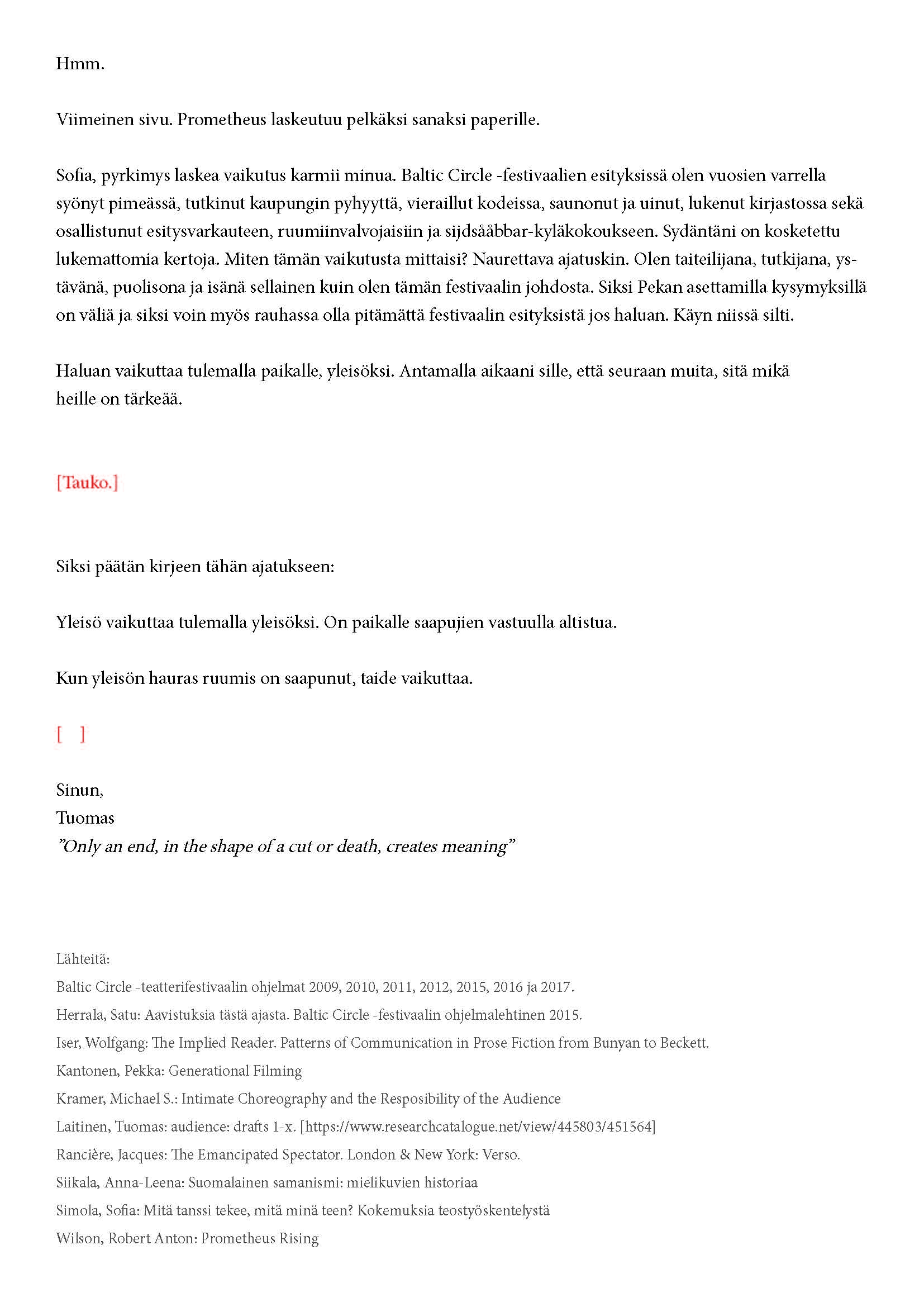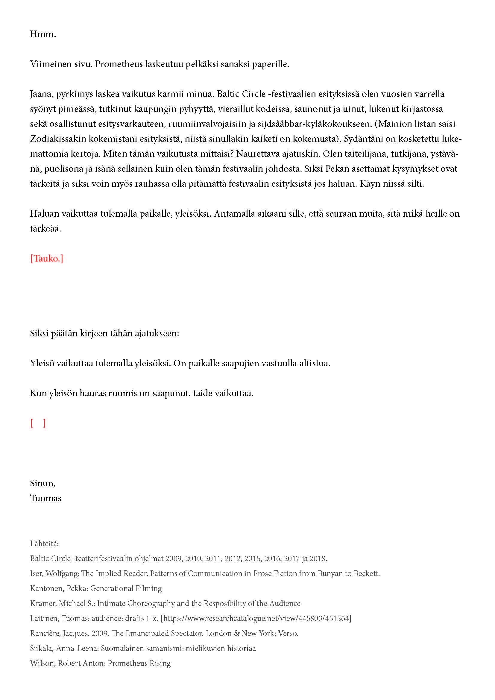 Kiitos kun tulit. Tätä onkin jännittävää kirjoittaa. Tiedät kirjeen sisällön jo ennalta, joten noidankehästä ei pääse eroon. Tämä on tutkijan paradoksi, jota en voi olla käsittelemättä. Toivon, että pääset osaksi yleisöä.