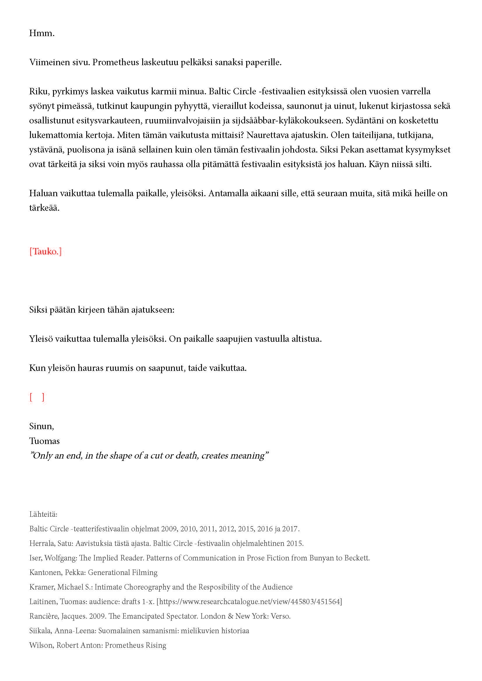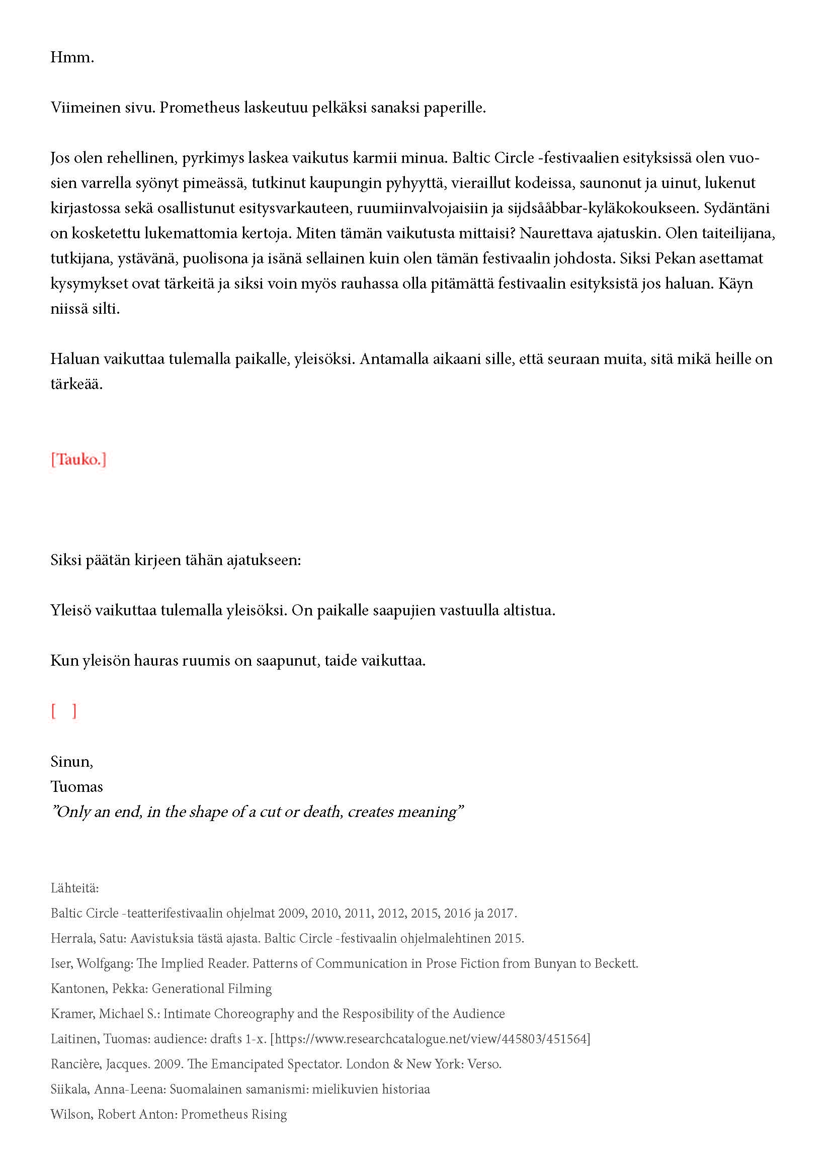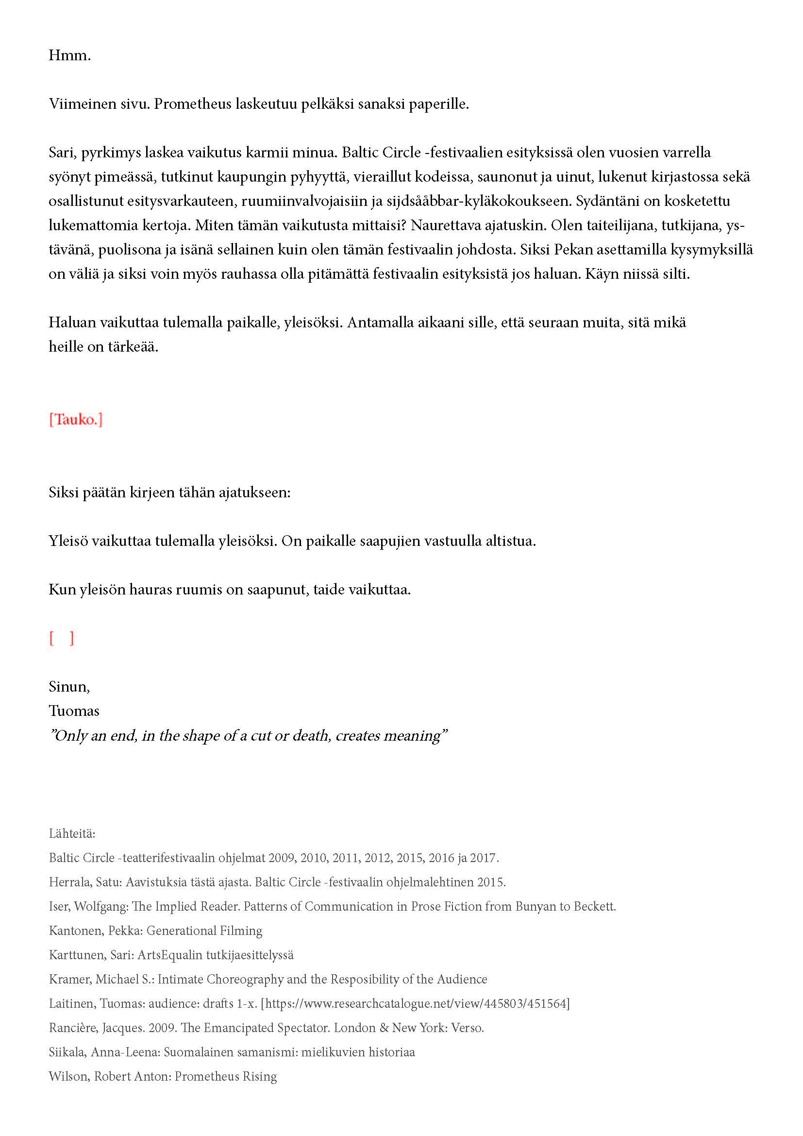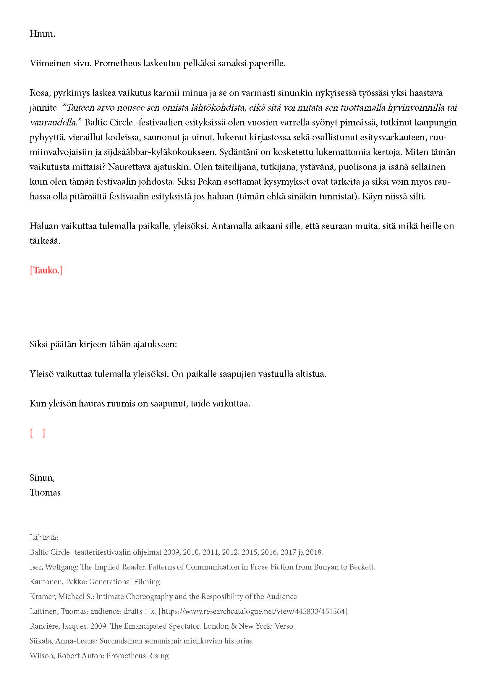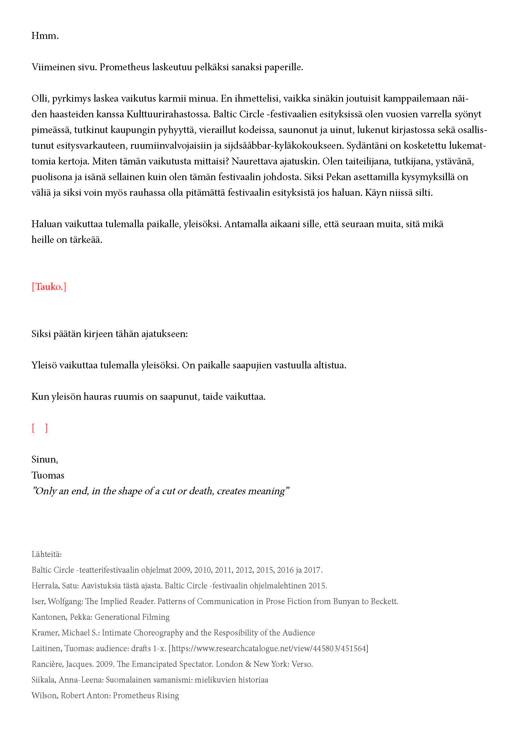 Kiitos kun tulit. Tätä onkin jännittävää kirjoittaa. Tiedät kirjeen sisällön jo ennalta, joten noidankehästä ei pääse eroon. Tämä on tutkijan paradoksi, jota en voi olla käsittelemättä. Toivon, että pääset osaksi yleisöä.