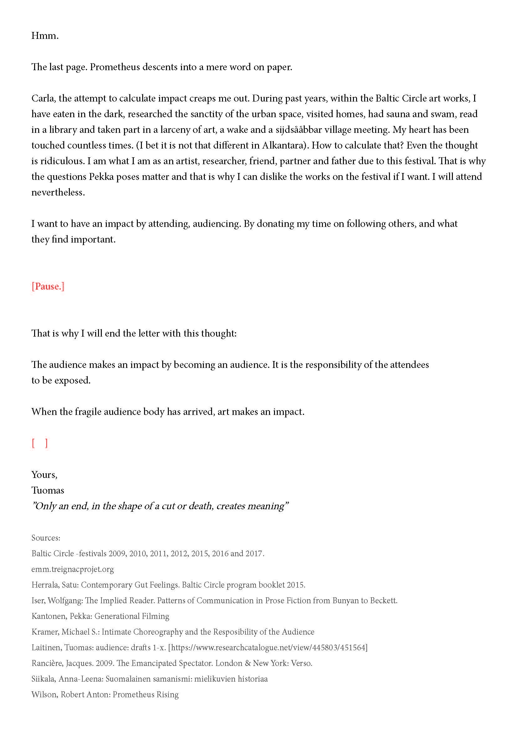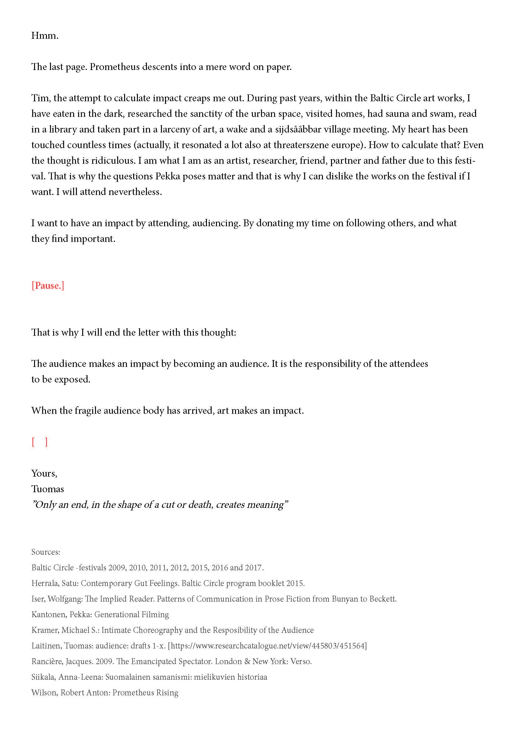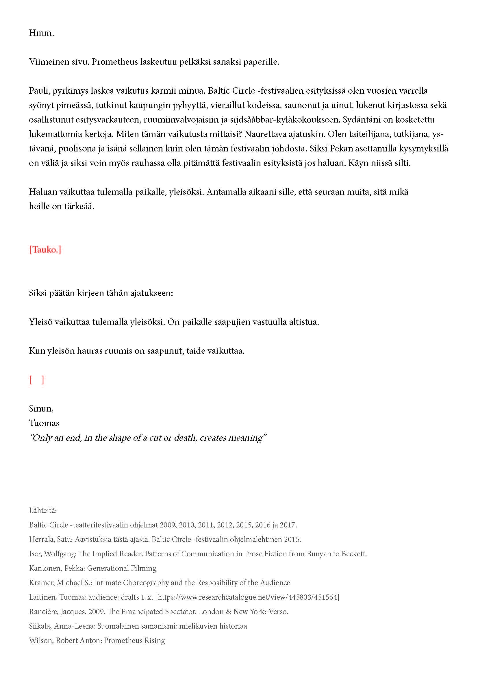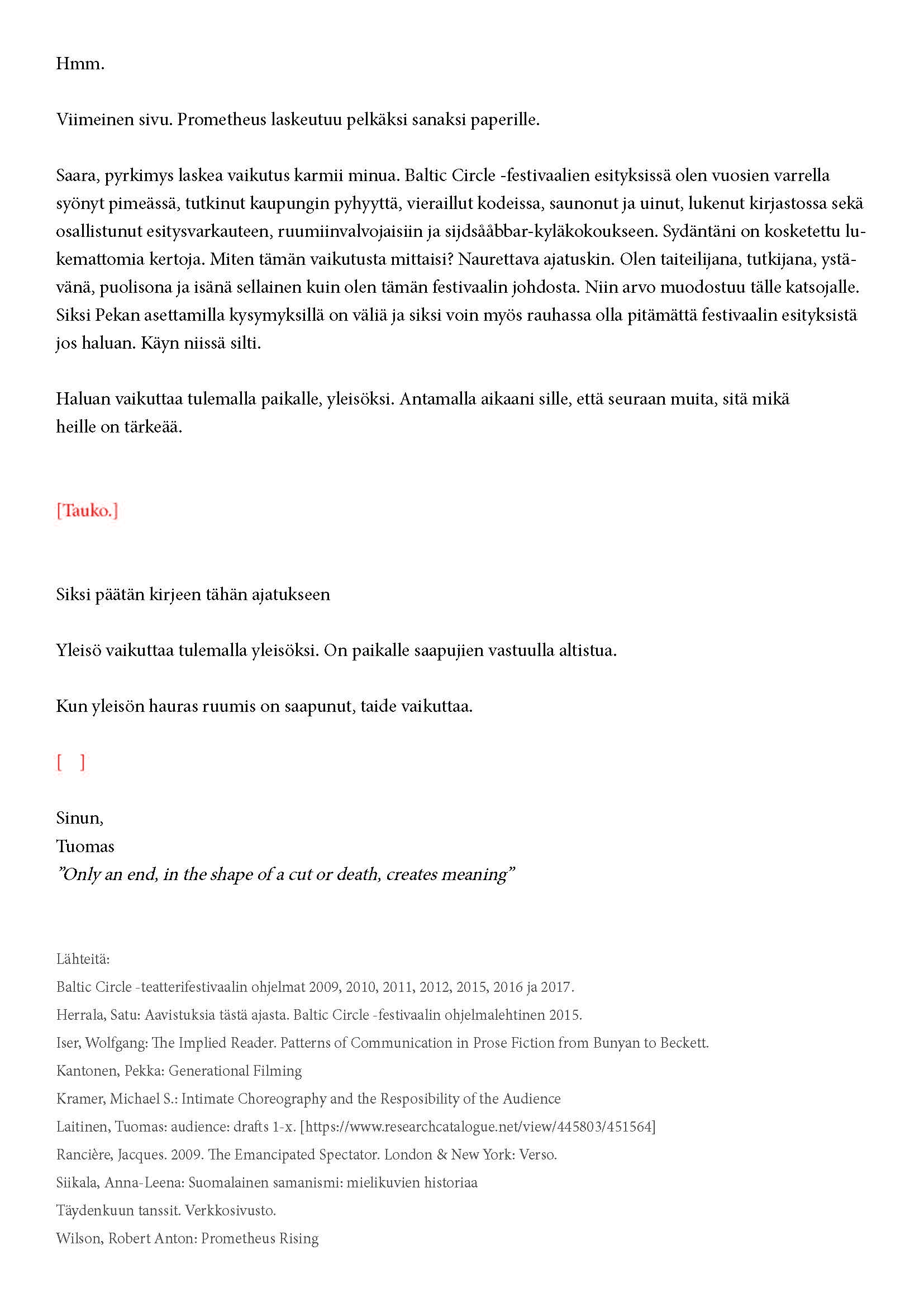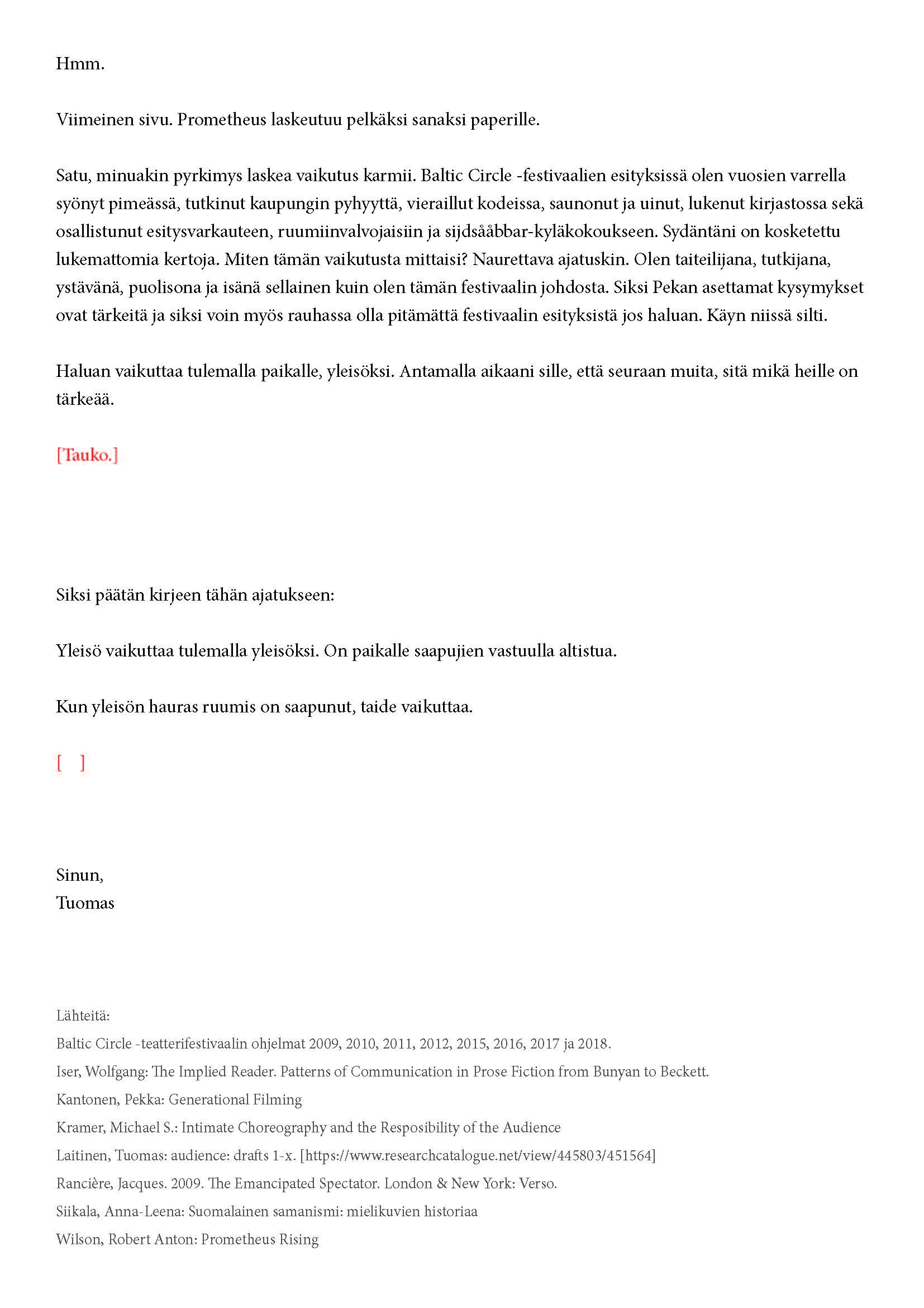 Kiitos kun tulit. Tätä onkin jännittävää kirjoittaa. Tiedät kirjeen sisällön jo ennalta, joten noidankehästä ei pääse eroon. Tämä on tutkijan paradoksi, jota en voi olla käsittelemättä. Toivon, että pääset osaksi yleisöä.