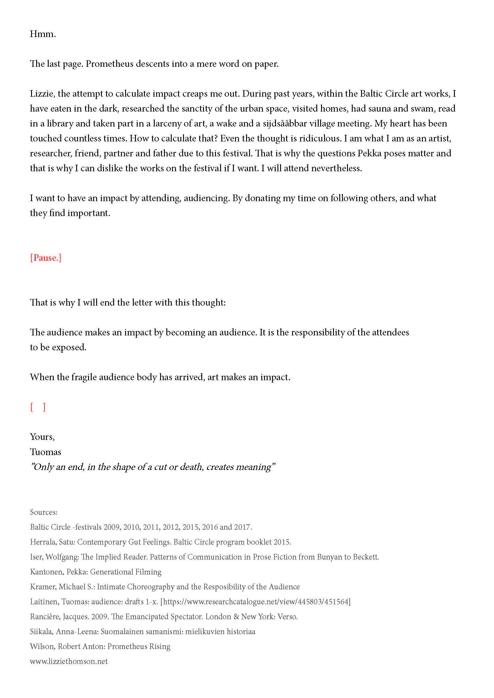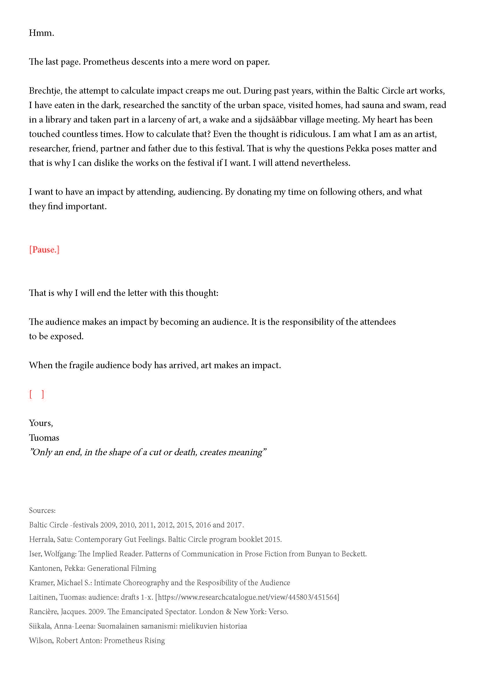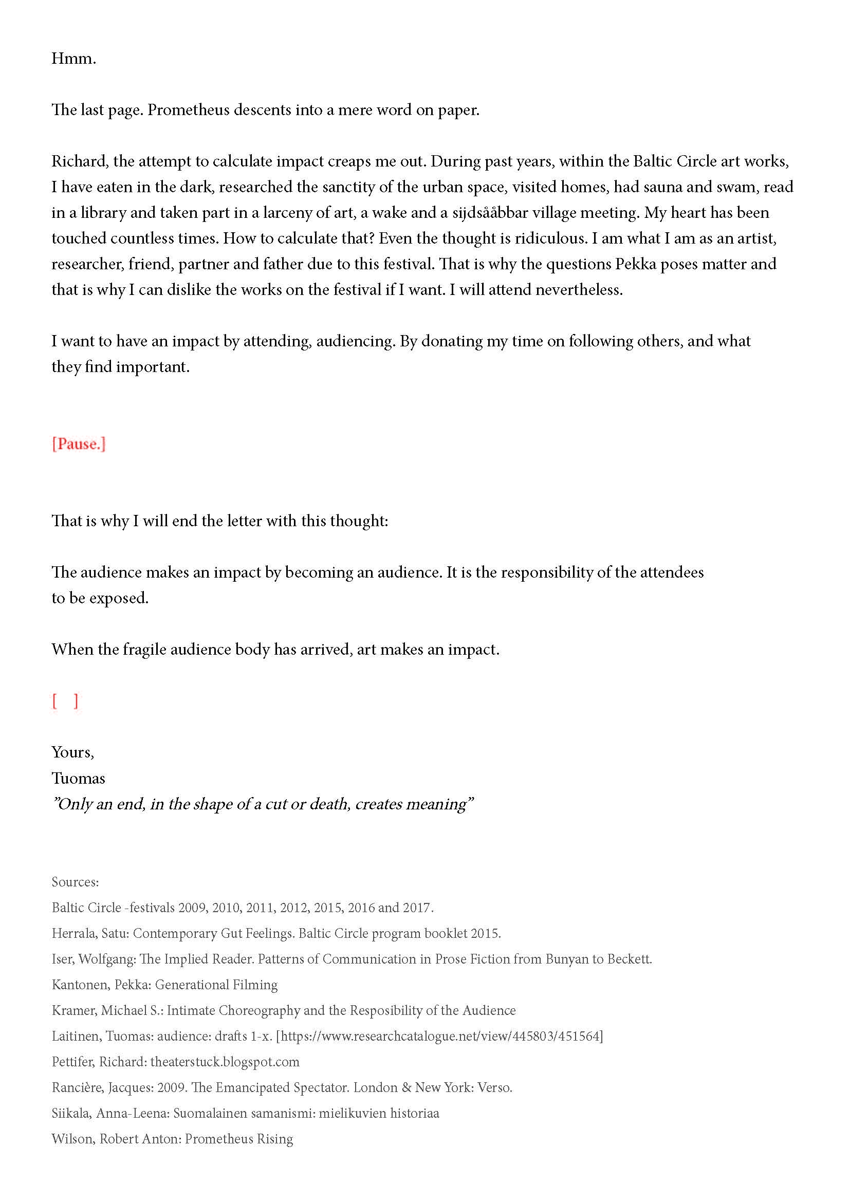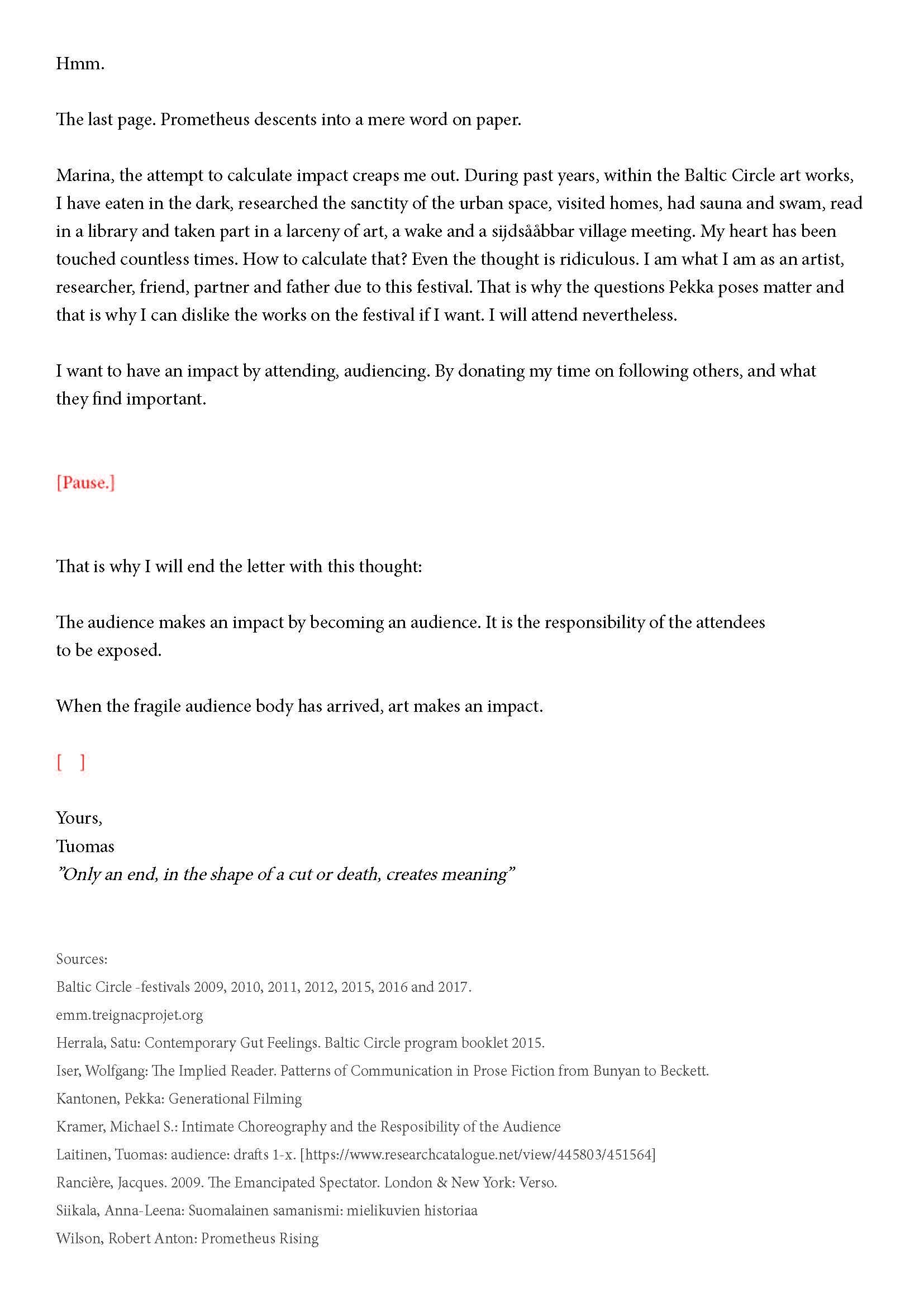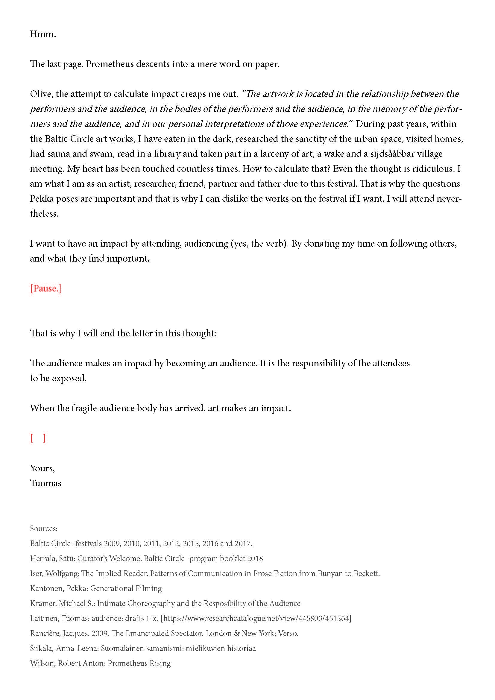 Kiitos kun tulit. Tätä onkin jännittävää kirjoittaa. Tiedät kirjeen sisällön jo ennalta, joten noidankehästä ei pääse eroon. Tämä on tutkijan paradoksi, jota en voi olla käsittelemättä. Toivon, että pääset osaksi yleisöä.